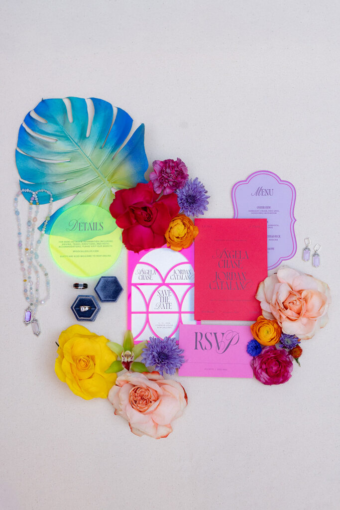 A kaleidoscope of color sets the tone in this vibrant flat lay featuring stationery in a mix of layered acrylics by Creole Amour Laser Studio and luxe papers by Nice Day Events creates depth and texture, with shades of hot pink, lilac, and neon chartreuse nodding to the stained-glass inspiration behind Color Theory. Bold blooms from Cry Baby Floral infuse the composition with saturated energy. Finishing touches, including statement jewelry pieces from Mignon Faget’s new Legacy Wonderland Collection and radiant rings from Symmetry Jewelers, bring a soft shimmer that mirrors the interplay of light and color woven throughout the editorial.