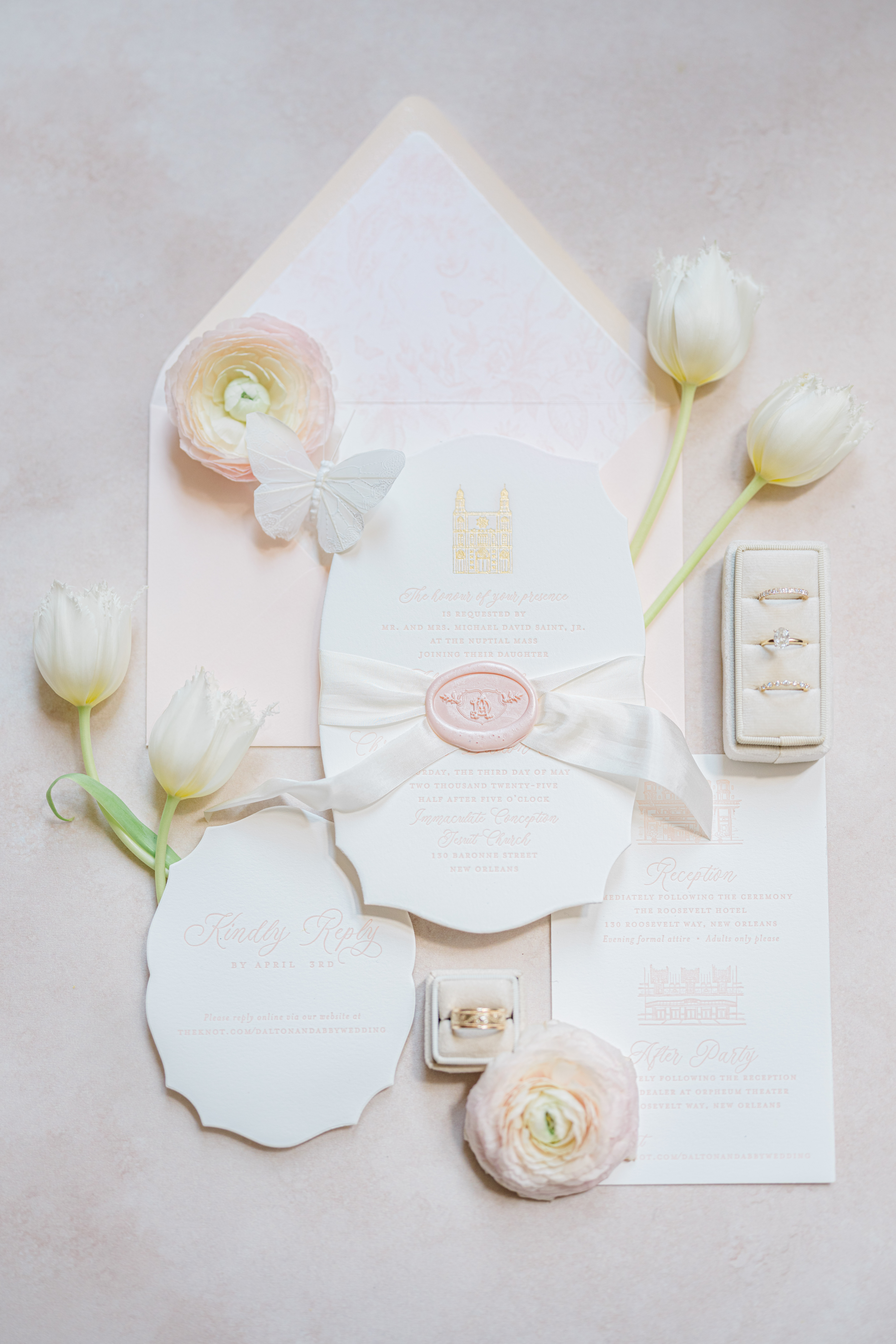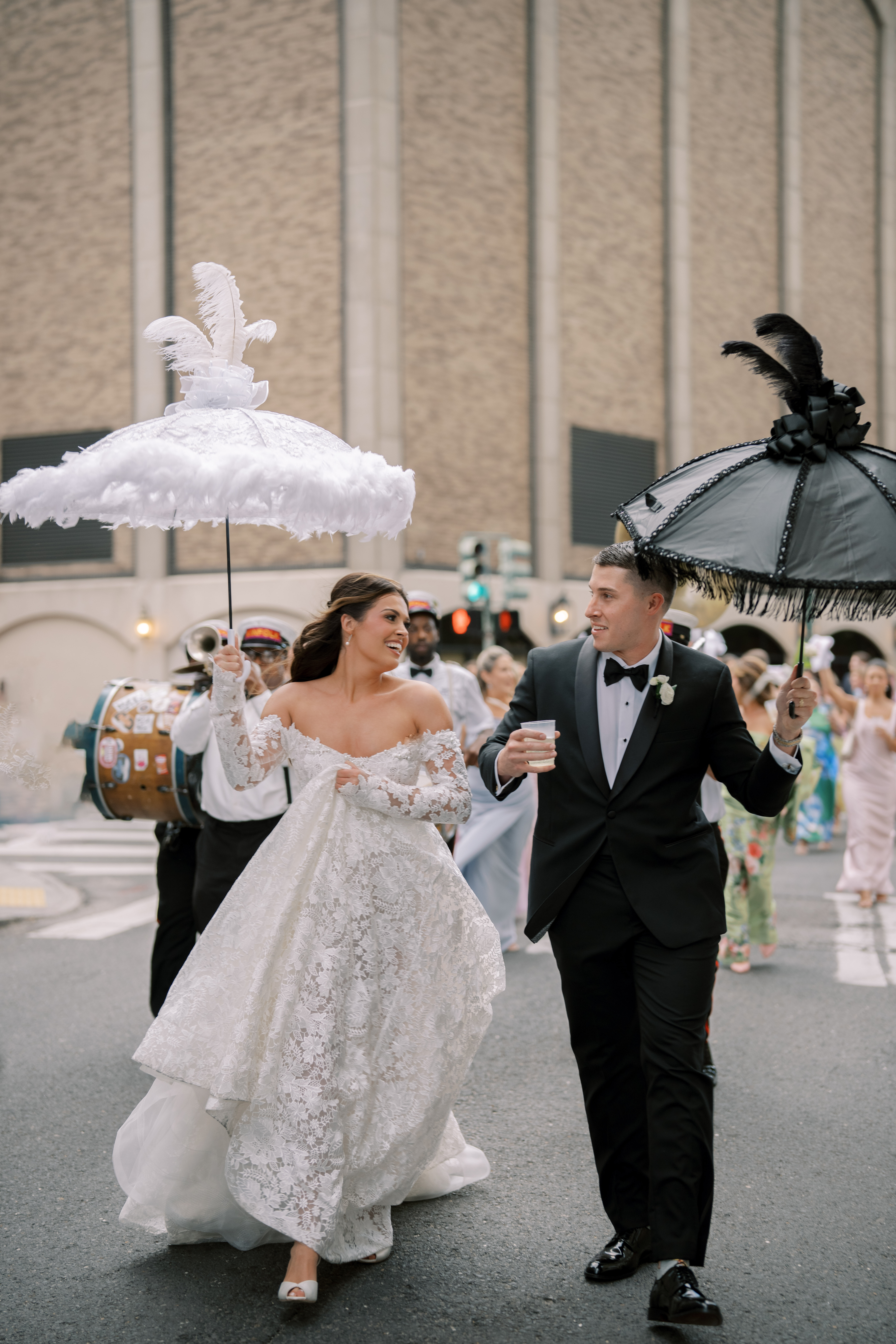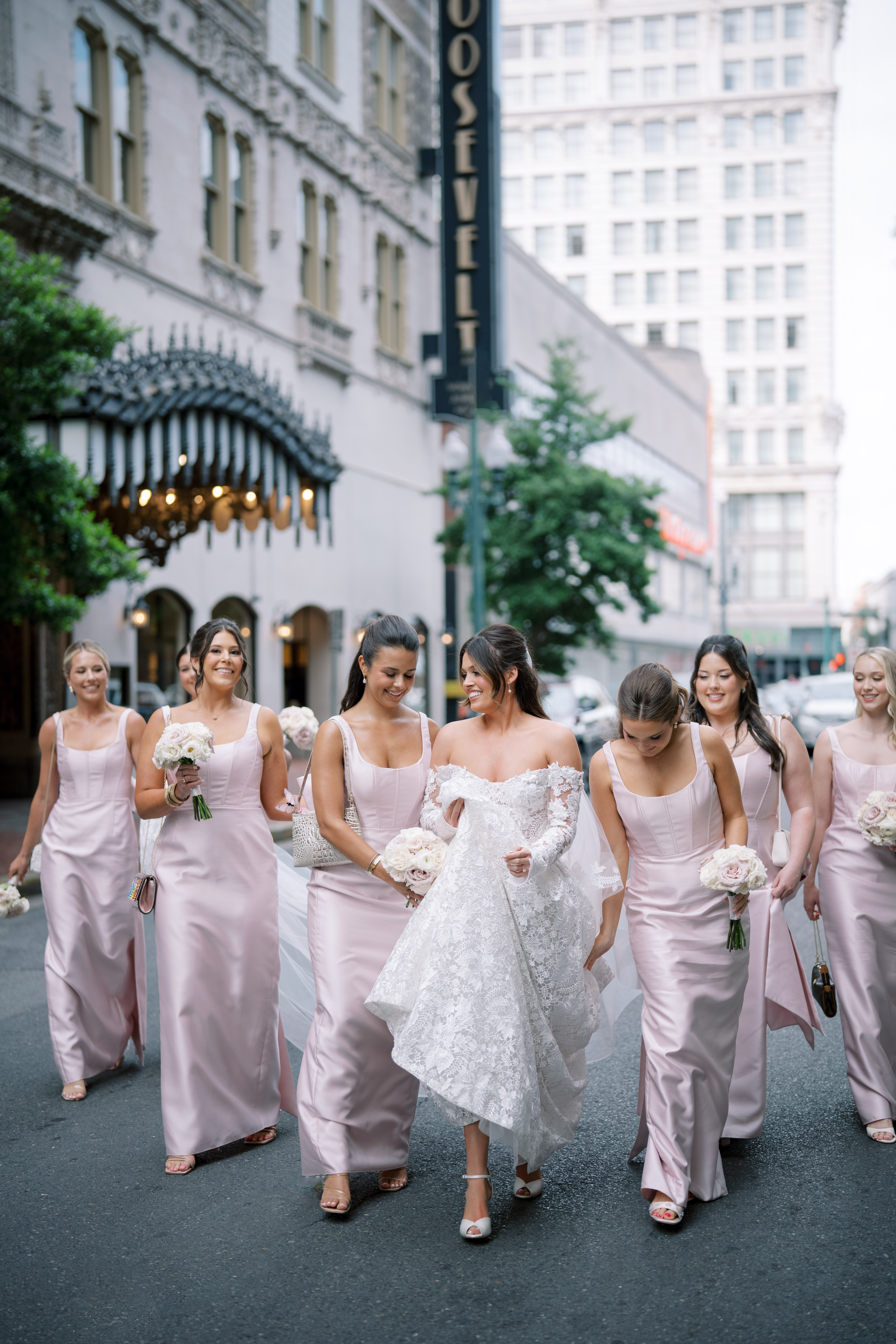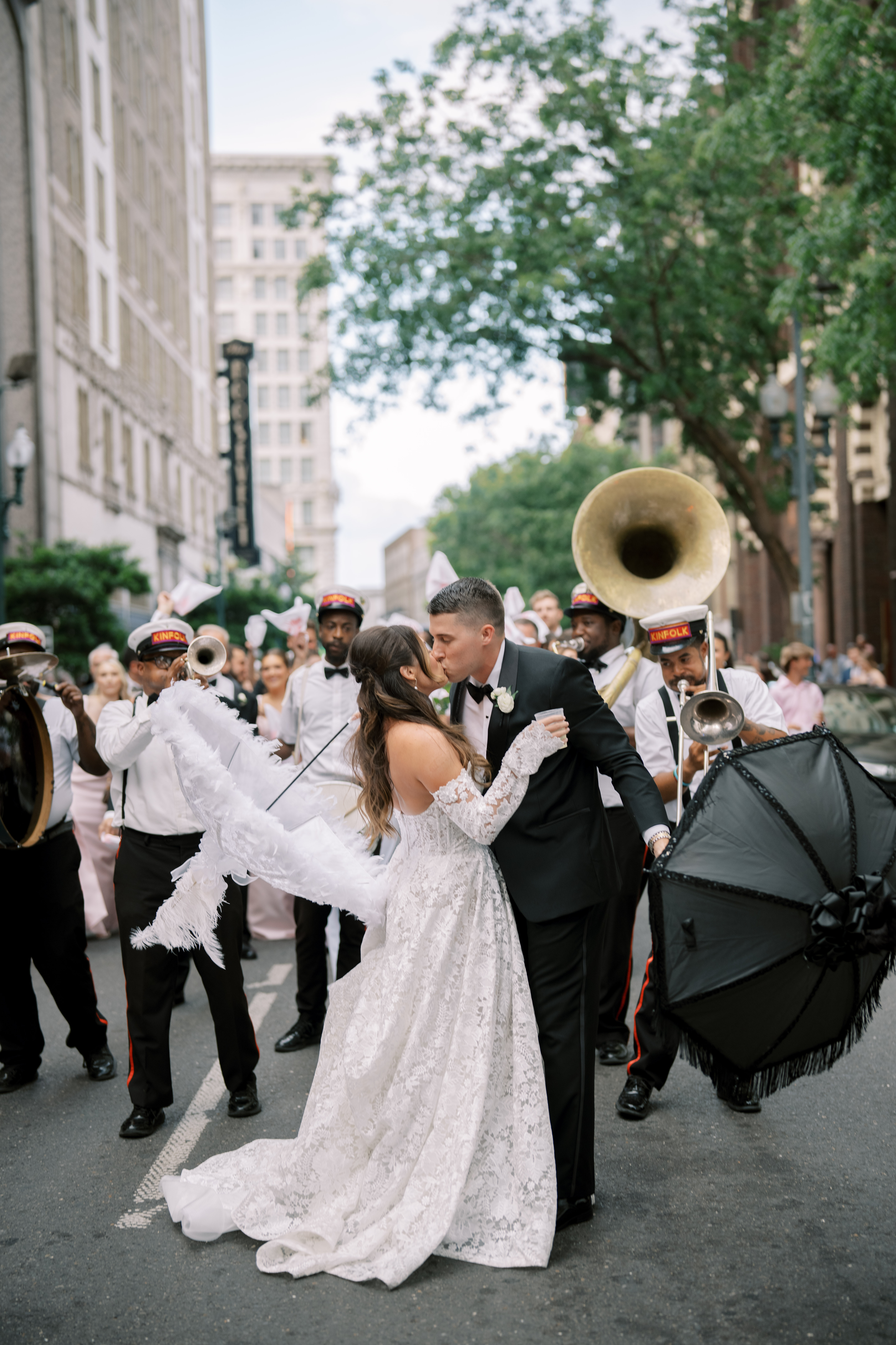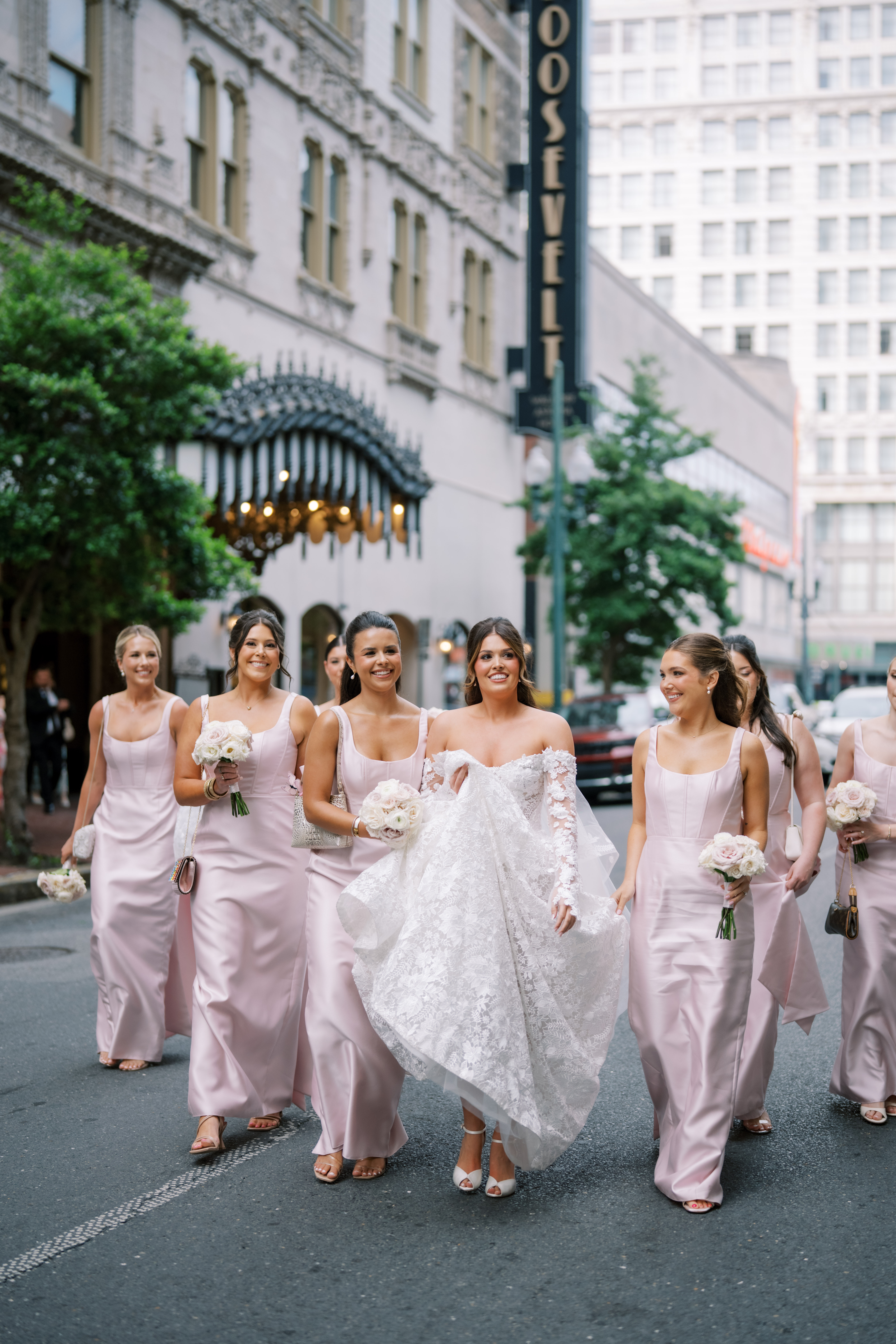 VENUE + BAKERY + CATERER: The Roosevelt | CEREMONY LOCATION: Immaculate Conception Jesuit Church | OFFICIANT: Father Alex | REHEARSAL DINNER LOCATION: Arnaud’s | AFTER PARTY VENUE: Double Dealer | BRIDAL GOWN: Berta | BRIDESMAIDS’ GOWNS: Alfred Sung, London | PHOTOGRAPHER + VIDEOGRAPHER: Brooke Boyd Photo & Films | CEREMONY MUSIC: Immaculate Conception Musicians | RECEPTION ENTERTAINMENT: The Mixed Nuts | SECOND LINE BAND: Kinfolk Brass Band | AFTER PARTY DJ: Oh2 Entertainment, llc | HAIR + MAKEUP: Megan Adams, Hair & Mainstreet Salon + Maddie G MUA | HONEYMOON: Antigua | WEDDING PLANNER/DESIGNER: Amanda Price Events | DECOR RENTALS: Ad Event Group + Distressed Rentals | LINEN RENTALS: BJJ Latavola + Nuage Designs | CANDLE DECOR/LIGHTING: Radiant Rentals NOLA | AFTER PARTY CATERER: Pigéon Catering & Events | SECOND LINE BAR SERVICE: Bourbon Bubbly & Brew | HOT DOG CART: Lucky Dogs | JEWELERS: Béjé, engagement ring + Ramsey’s Diamonds, Bride’s custom wedding band (made with diamonds from her mother’s ring) + Jared, Groom’s wedding band | LIVE PAINTER: Torregrossa Fine Art | PHOTO BOOTH: Boogie Booth | INVITATIONS: Dogwood Blossom