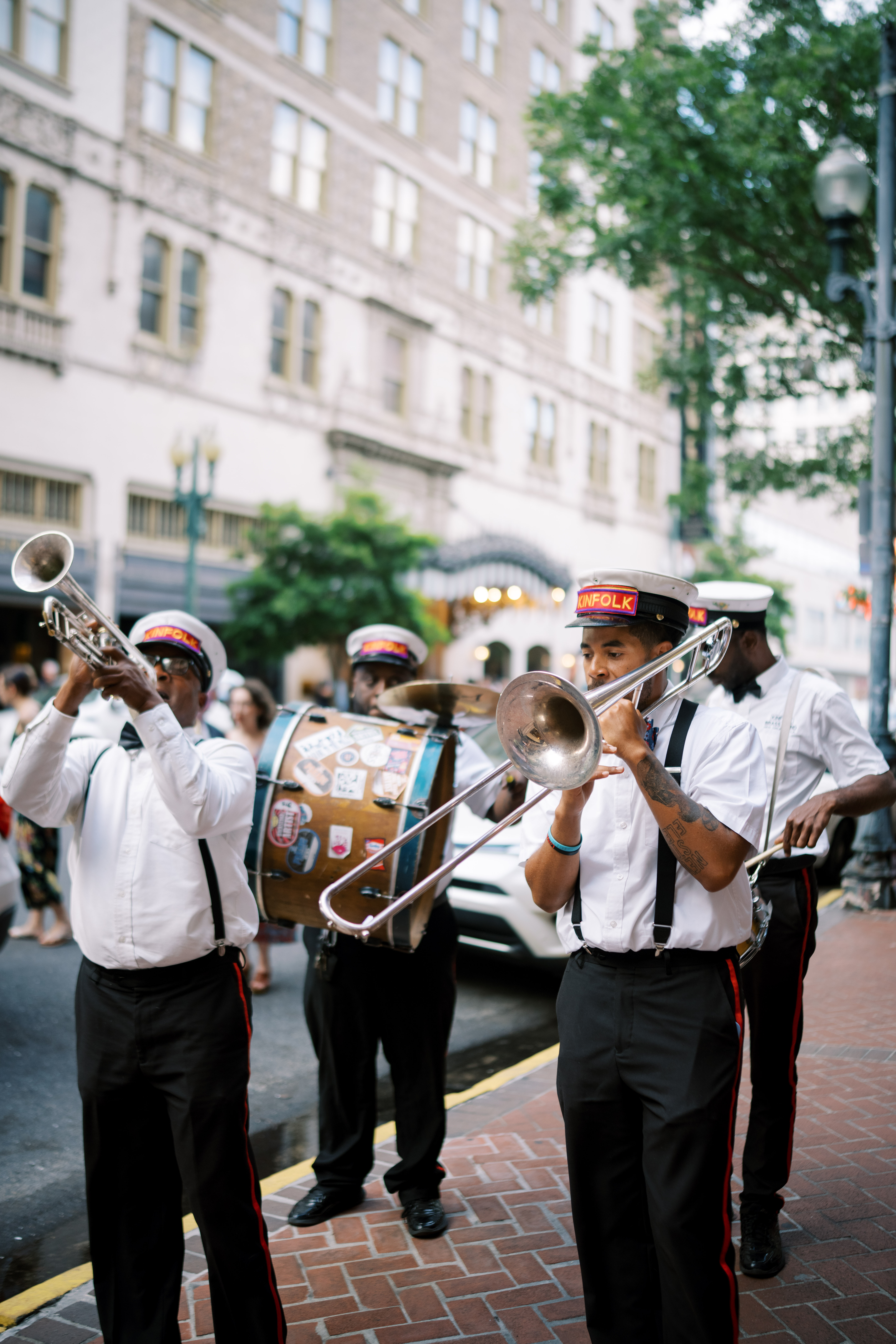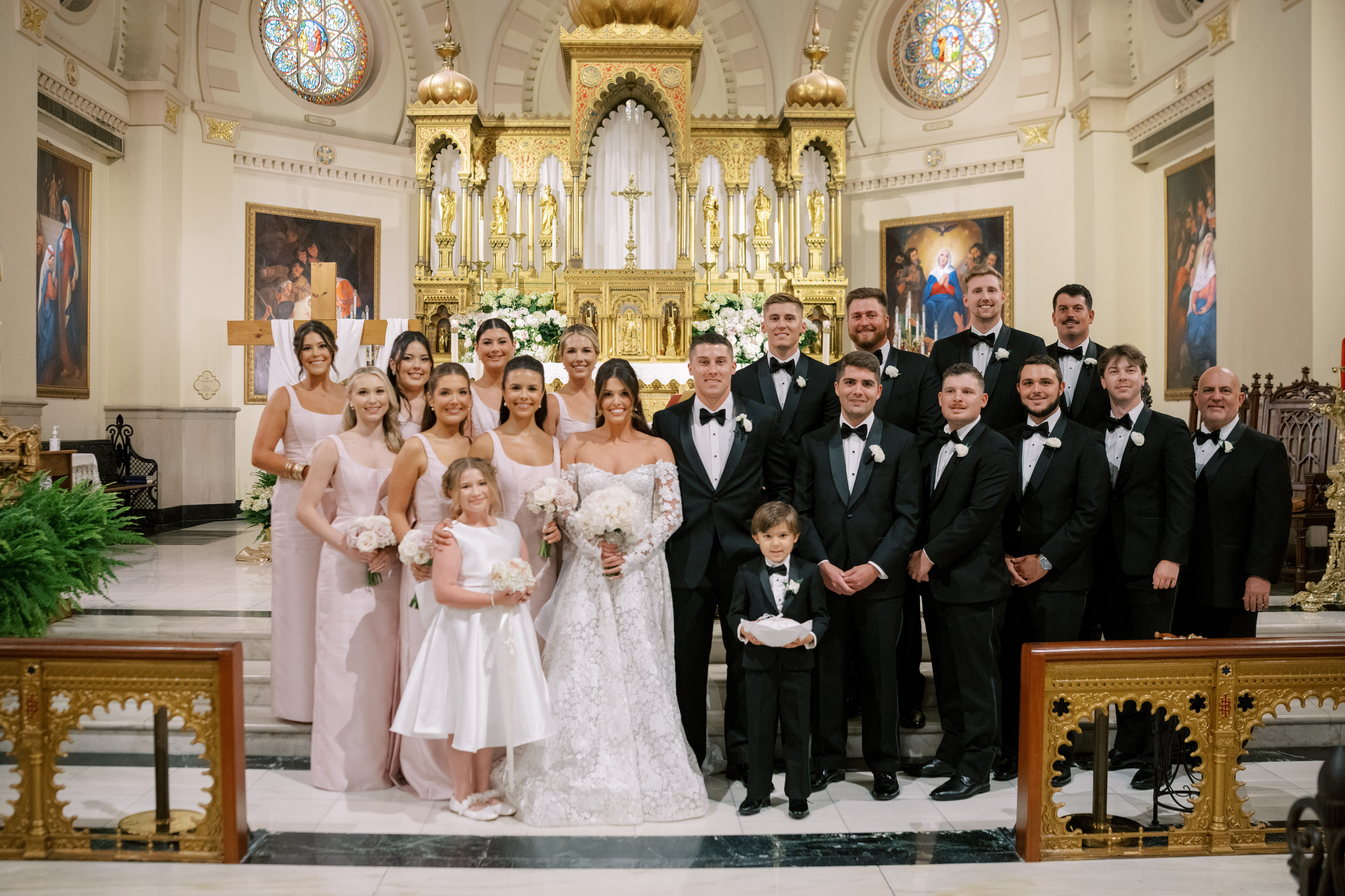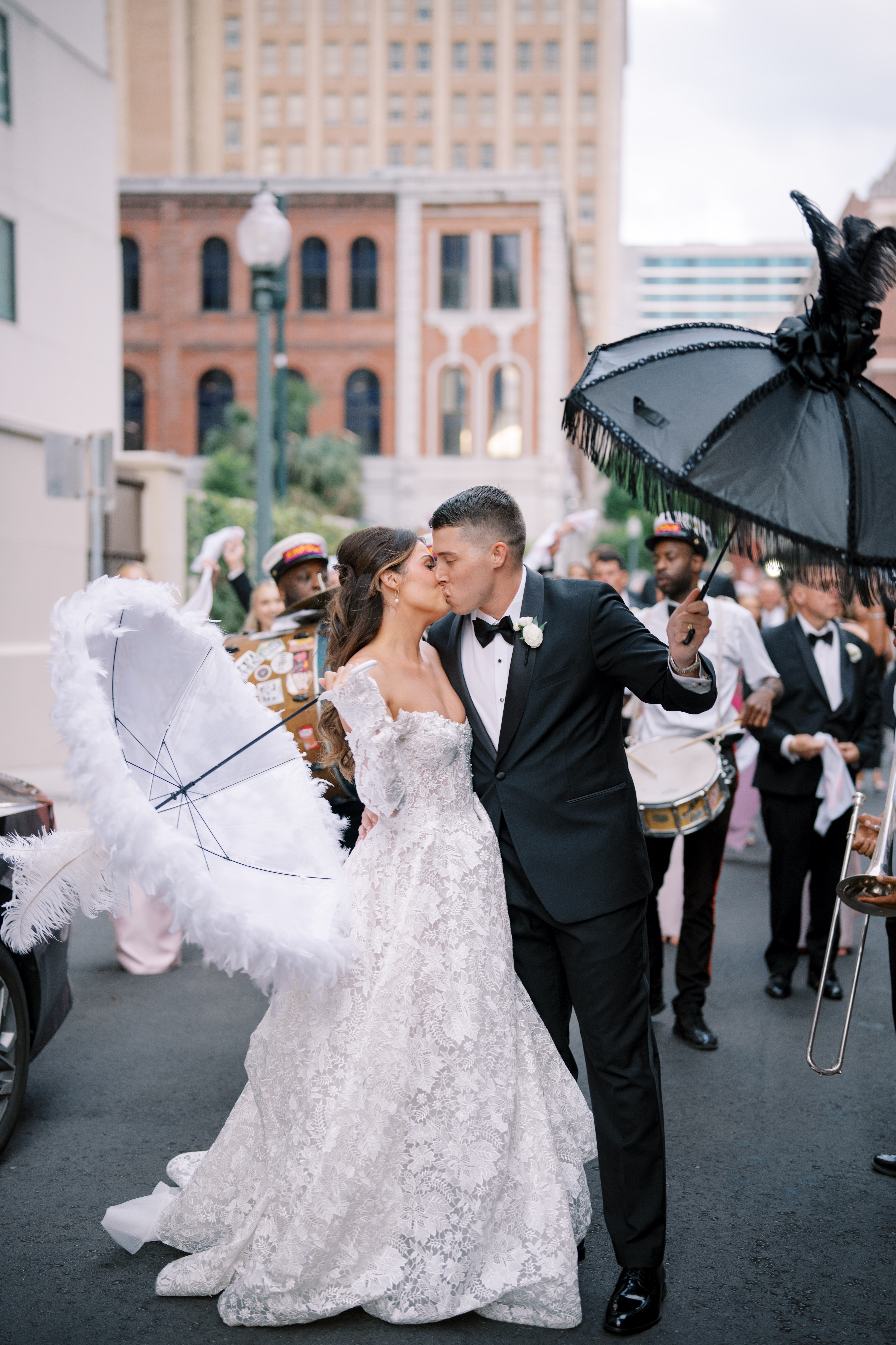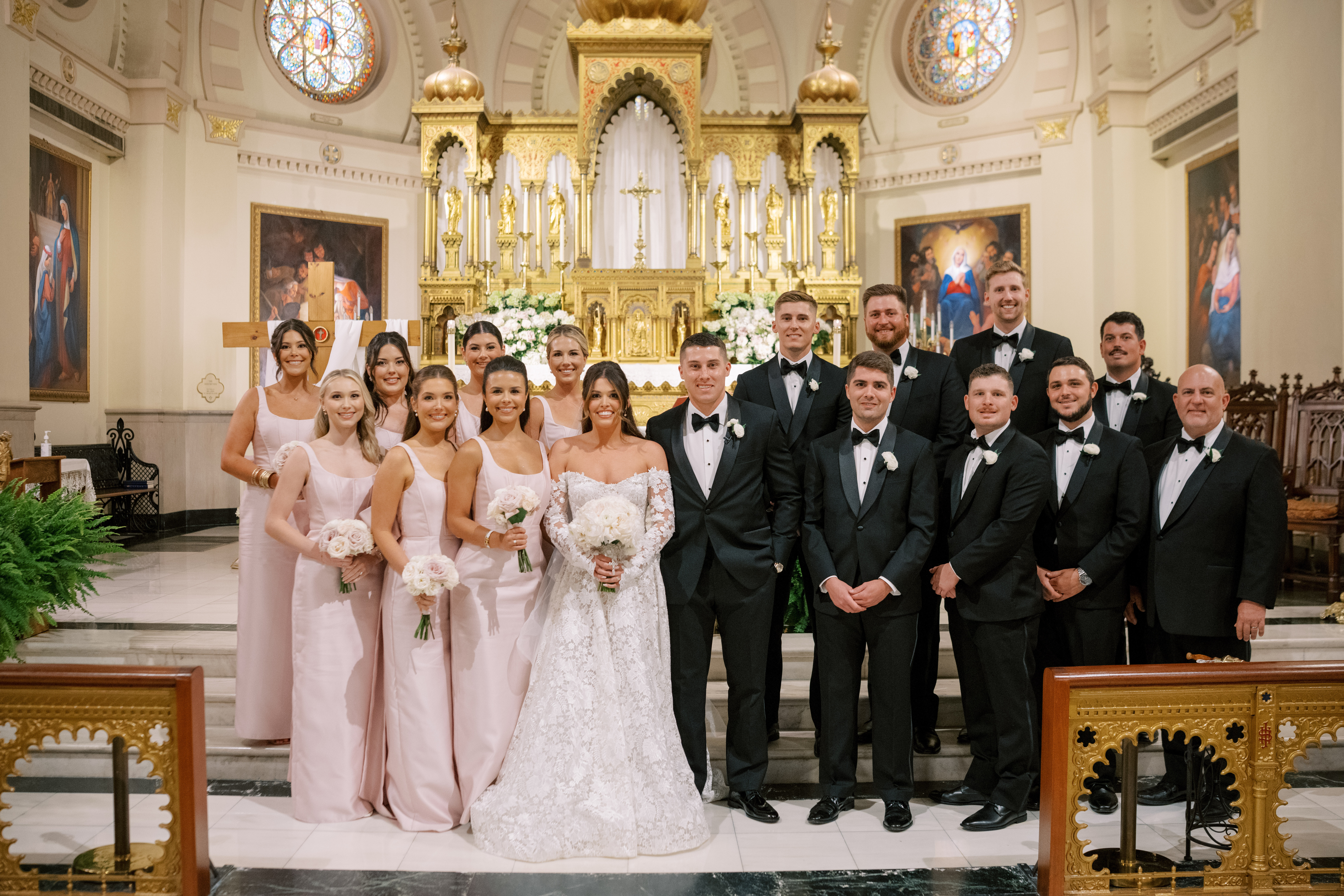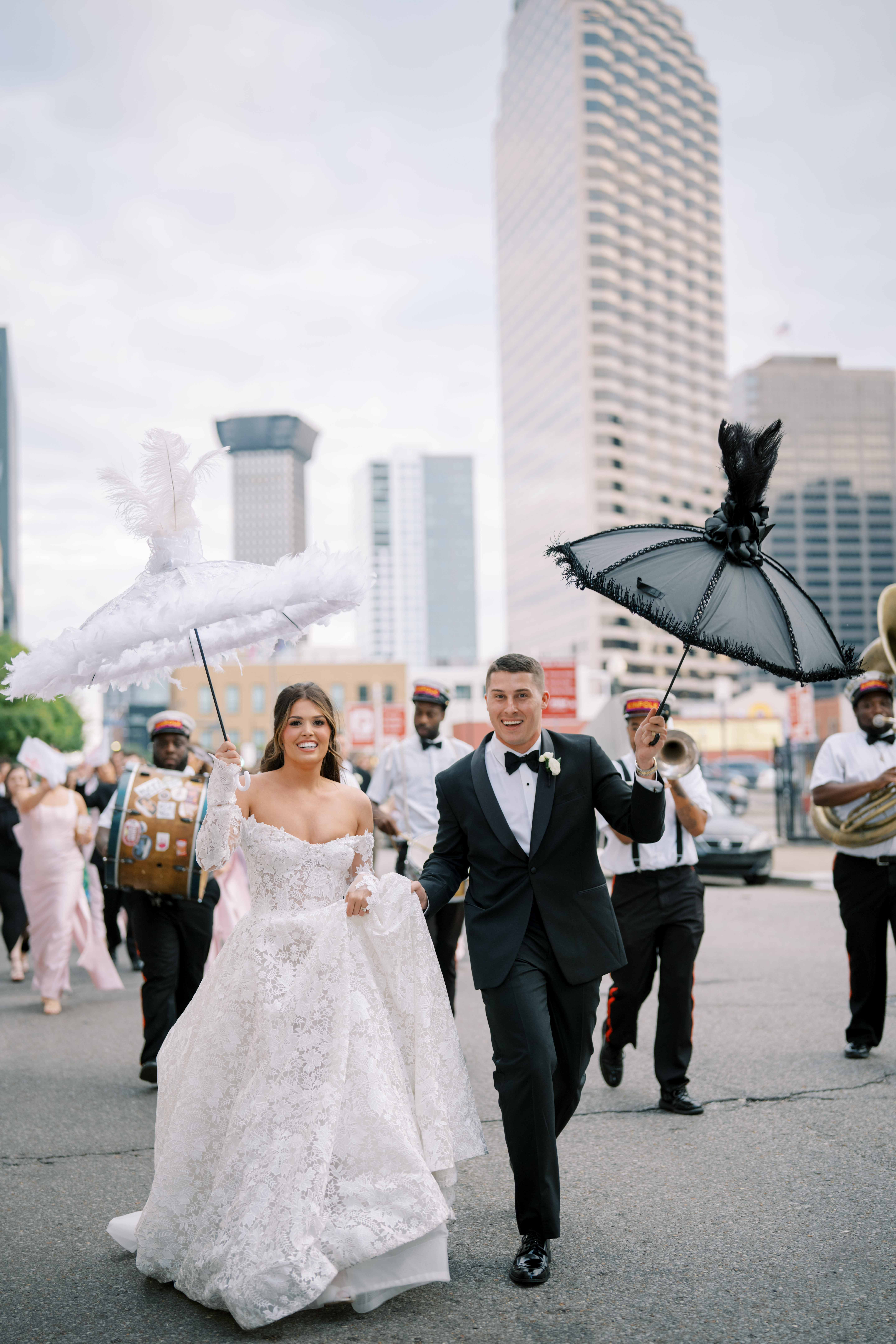 VENUE + BAKERY + CATERER: The Roosevelt | CEREMONY LOCATION: Immaculate Conception Jesuit Church | OFFICIANT: Father Alex | REHEARSAL DINNER LOCATION: Arnaud’s | AFTER PARTY VENUE: Double Dealer | BRIDAL GOWN: Berta | BRIDESMAIDS’ GOWNS: Alfred Sung, London | PHOTOGRAPHER + VIDEOGRAPHER: Brooke Boyd Photo & Films | CEREMONY MUSIC: Immaculate Conception Musicians | RECEPTION ENTERTAINMENT: The Mixed Nuts | SECOND LINE BAND: Kinfolk Brass Band | AFTER PARTY DJ: Oh2 Entertainment, llc | HAIR + MAKEUP: Megan Adams, Hair & Mainstreet Salon + Maddie G MUA | HONEYMOON: Antigua | WEDDING PLANNER/DESIGNER: Amanda Price Events | DECOR RENTALS: Ad Event Group + Distressed Rentals | LINEN RENTALS: BJJ Latavola + Nuage Designs | CANDLE DECOR/LIGHTING: Radiant Rentals NOLA | AFTER PARTY CATERER: Pigéon Catering & Events | SECOND LINE BAR SERVICE: Bourbon Bubbly & Brew | HOT DOG CART: Lucky Dogs | JEWELERS: Béjé, engagement ring + Ramsey’s Diamonds, Bride’s custom wedding band (made with diamonds from her mother’s ring) + Jared, Groom’s wedding band | LIVE PAINTER: Torregrossa Fine Art | PHOTO BOOTH: Boogie Booth | INVITATIONS: Dogwood Blossom