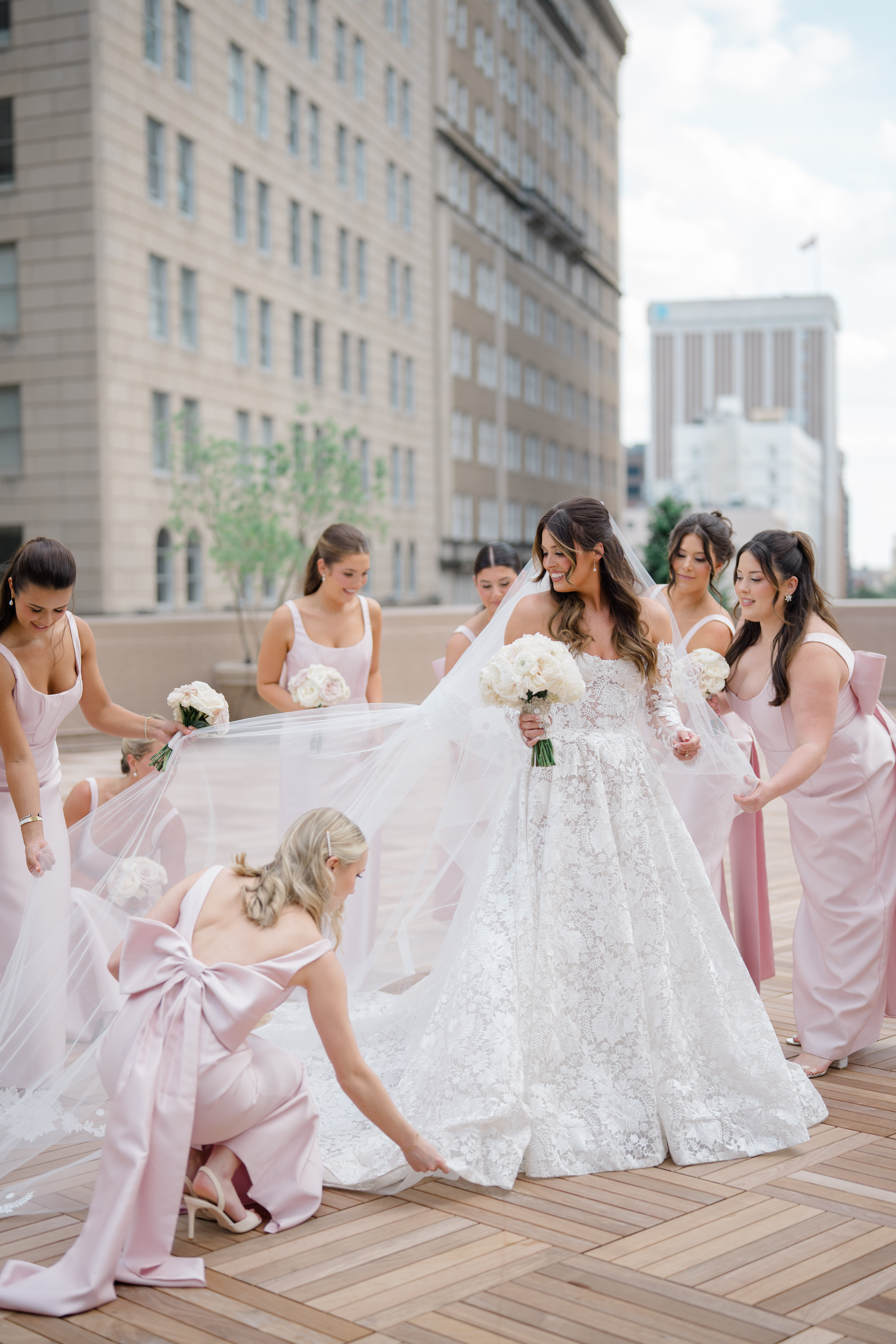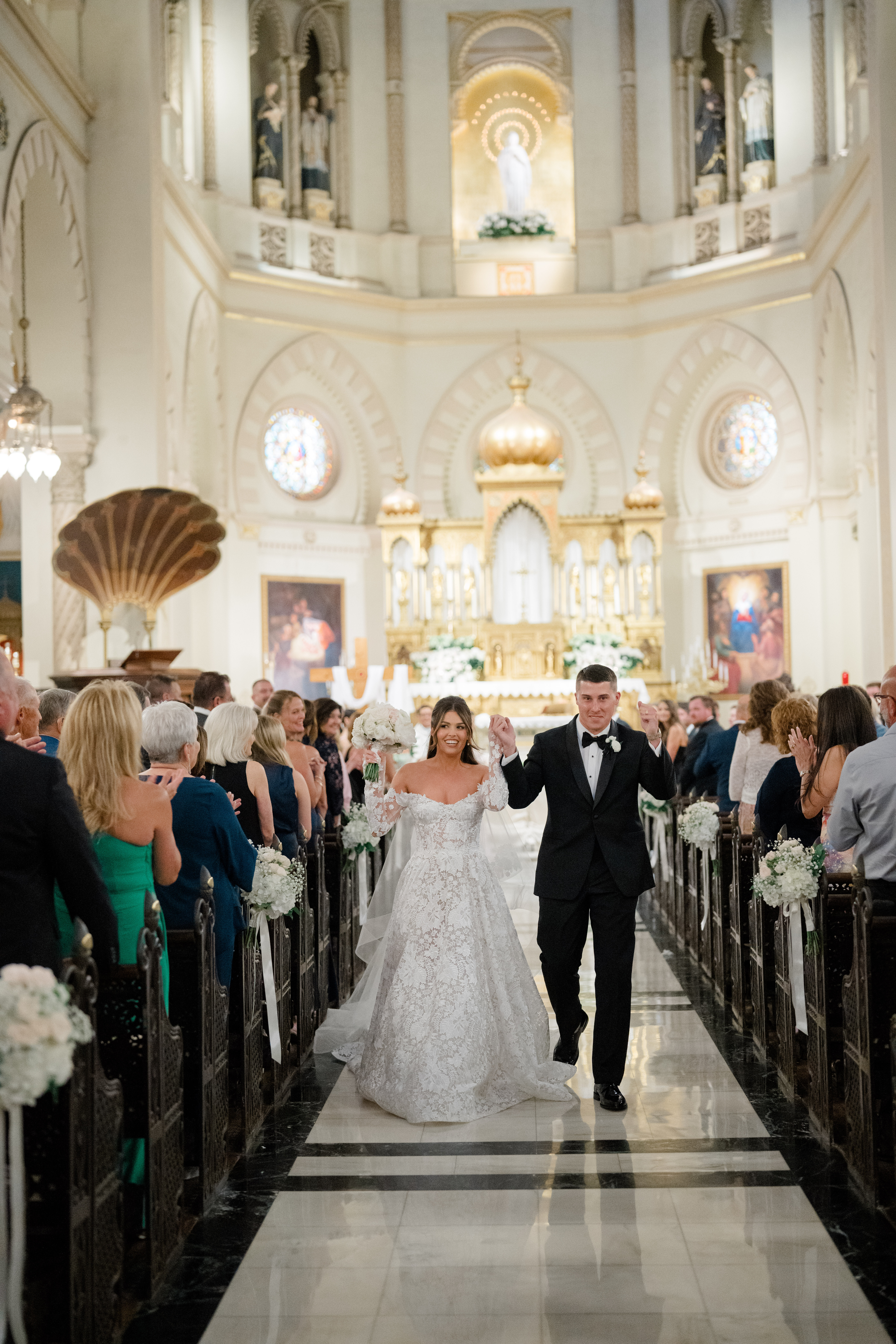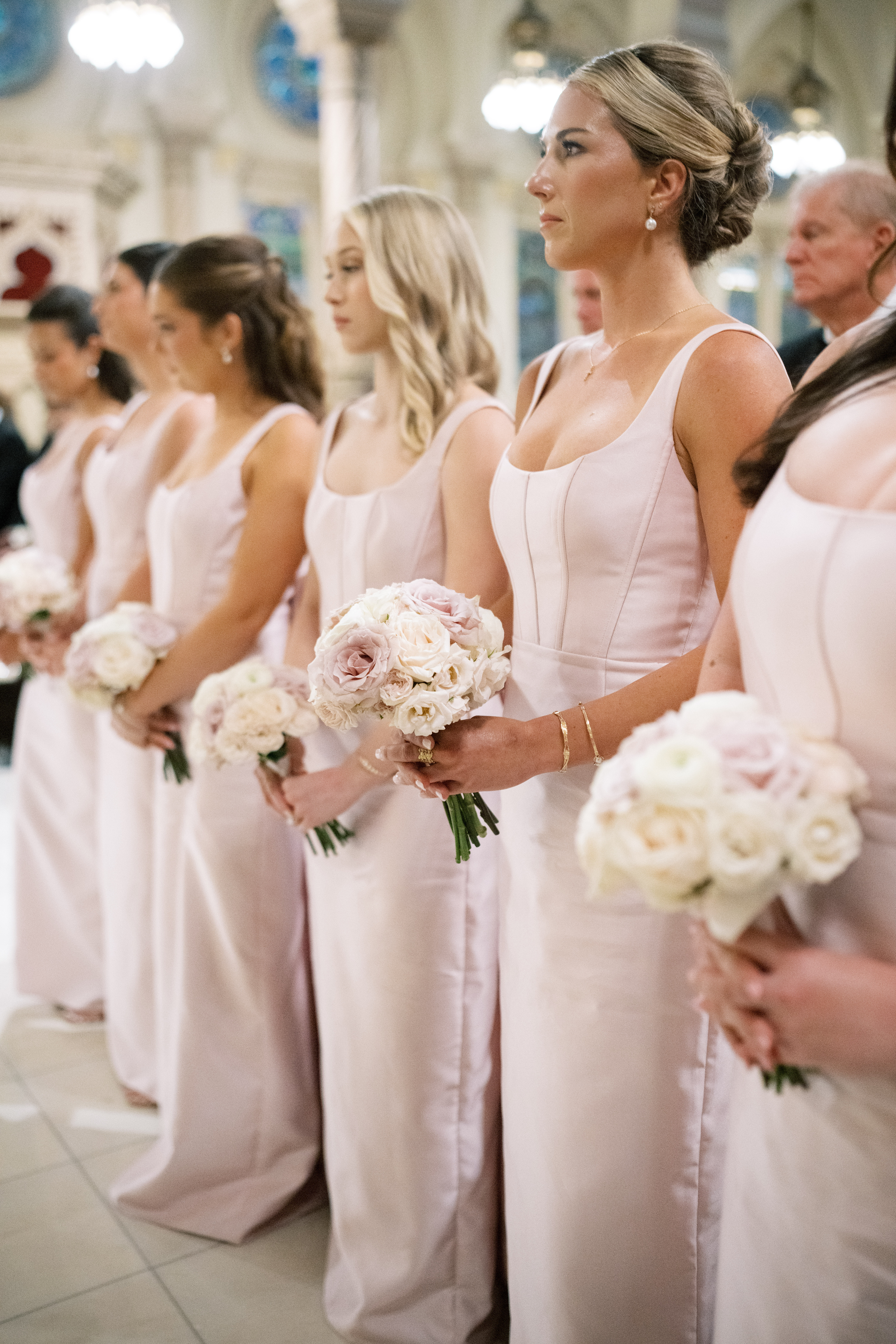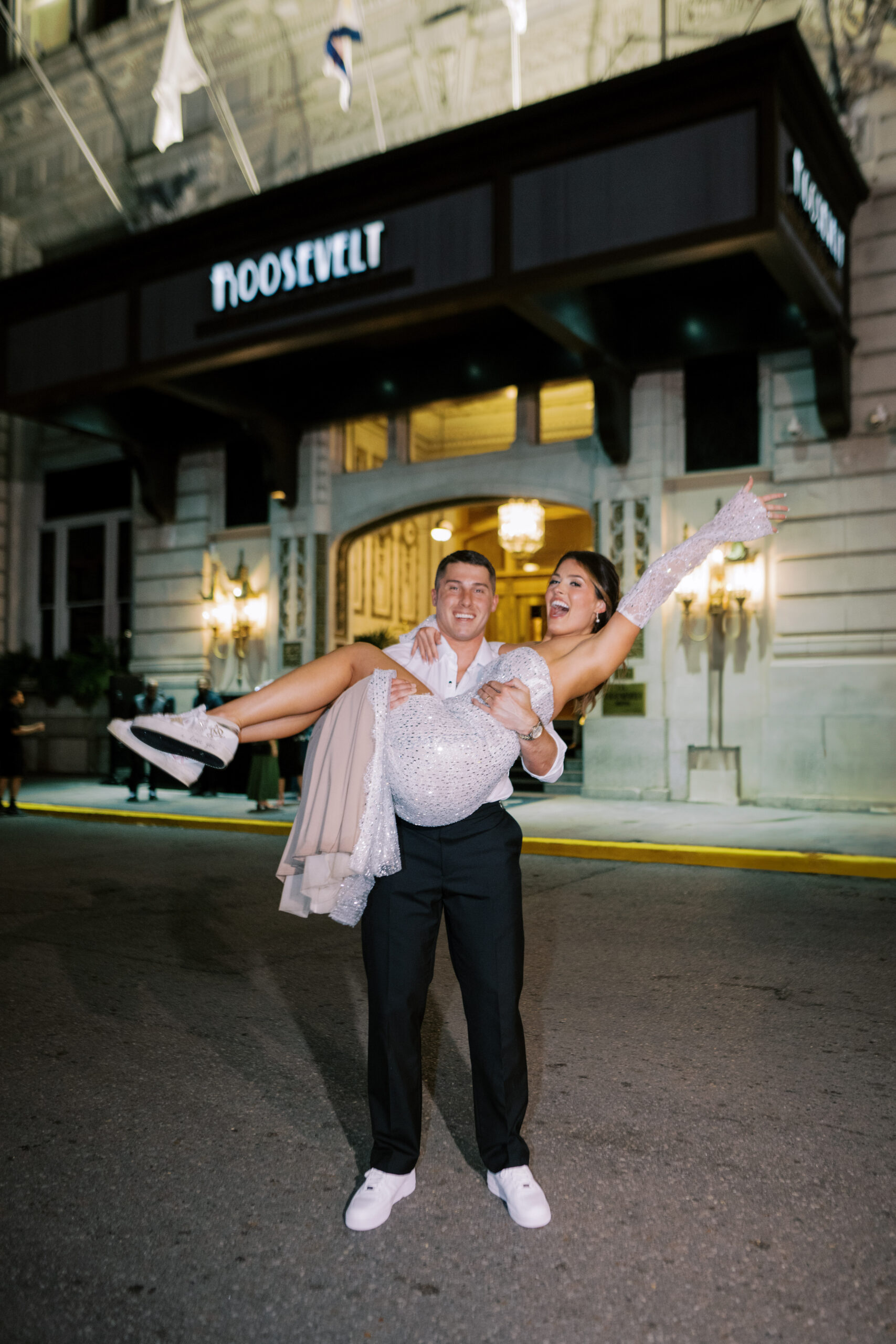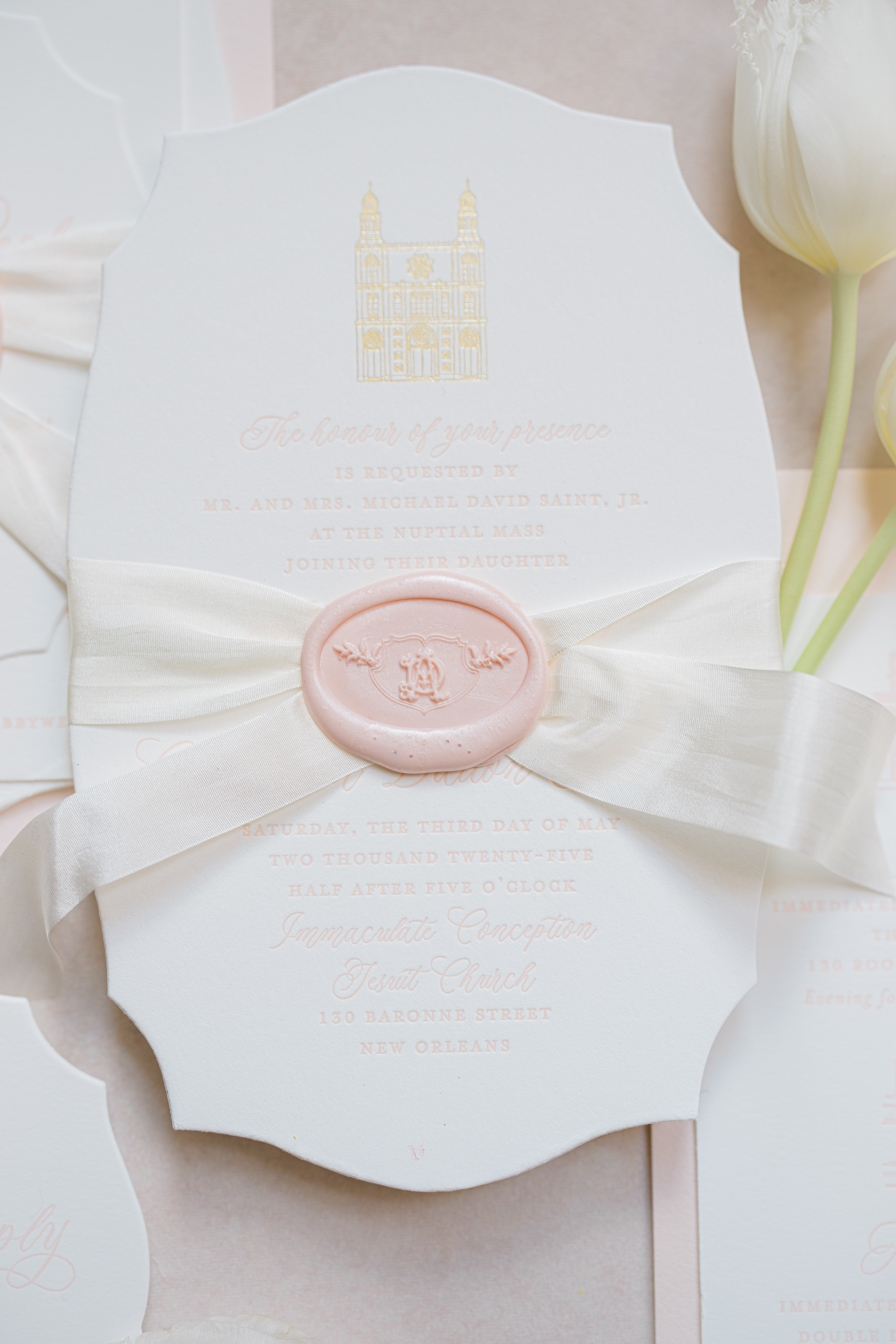 VENUE + BAKERY + CATERER: The Roosevelt | CEREMONY LOCATION: Immaculate Conception Jesuit Church | OFFICIANT: Father Alex | REHEARSAL DINNER LOCATION: Arnaud’s | AFTER PARTY VENUE: Double Dealer | BRIDAL GOWN: Berta | BRIDESMAIDS’ GOWNS: Alfred Sung, London | PHOTOGRAPHER + VIDEOGRAPHER: Brooke Boyd Photo & Films | CEREMONY MUSIC: Immaculate Conception Musicians | RECEPTION ENTERTAINMENT: The Mixed Nuts | SECOND LINE BAND: Kinfolk Brass Band | AFTER PARTY DJ: Oh2 Entertainment, llc | HAIR + MAKEUP: Megan Adams, Hair & Mainstreet Salon + Maddie G MUA | HONEYMOON: Antigua | WEDDING PLANNER/DESIGNER: Amanda Price Events | DECOR RENTALS: Ad Event Group + Distressed Rentals | LINEN RENTALS: BJJ Latavola + Nuage Designs | CANDLE DECOR/LIGHTING: Radiant Rentals NOLA | AFTER PARTY CATERER: Pigéon Catering & Events | SECOND LINE BAR SERVICE: Bourbon Bubbly & Brew | HOT DOG CART: Lucky Dogs | JEWELERS: Béjé, engagement ring + Ramsey’s Diamonds, Bride’s custom wedding band (made with diamonds from her mother’s ring) + Jared, Groom’s wedding band | LIVE PAINTER: Torregrossa Fine Art | PHOTO BOOTH: Boogie Booth | INVITATIONS: Dogwood Blossom