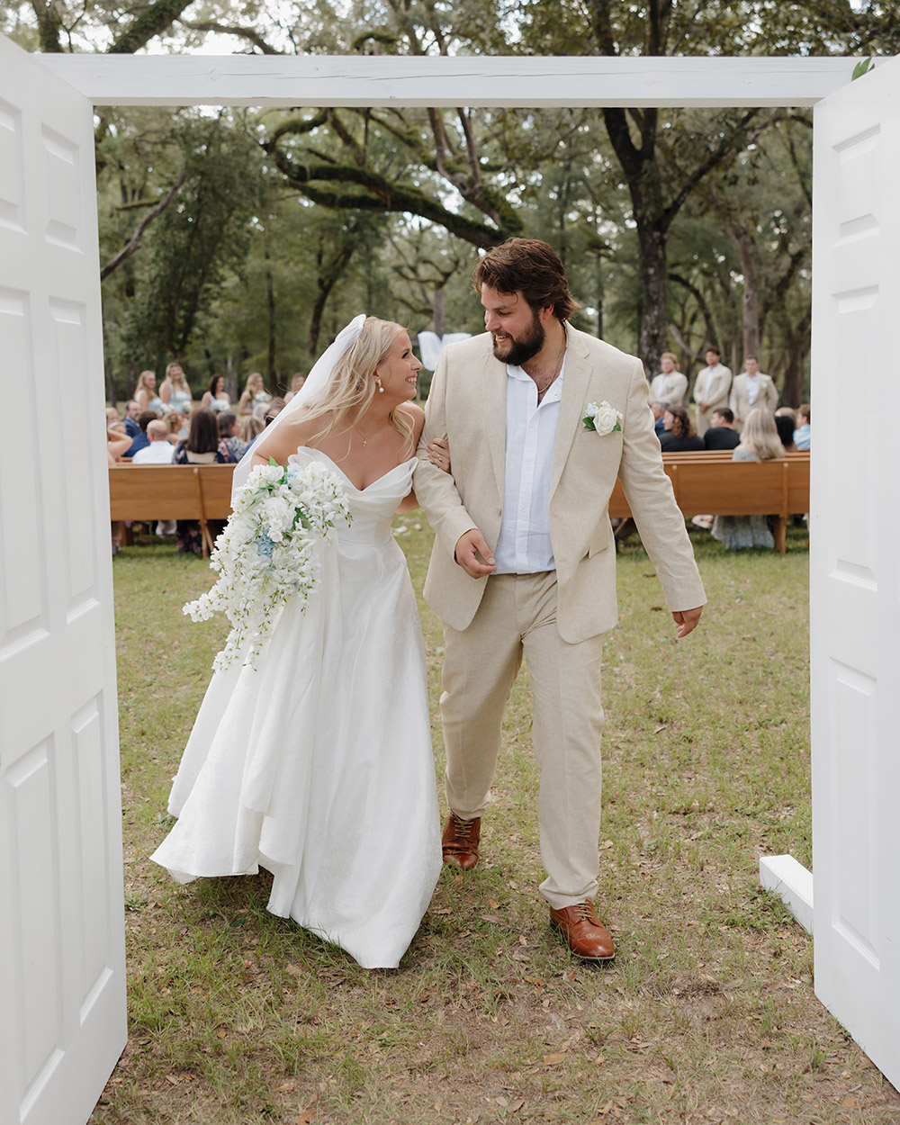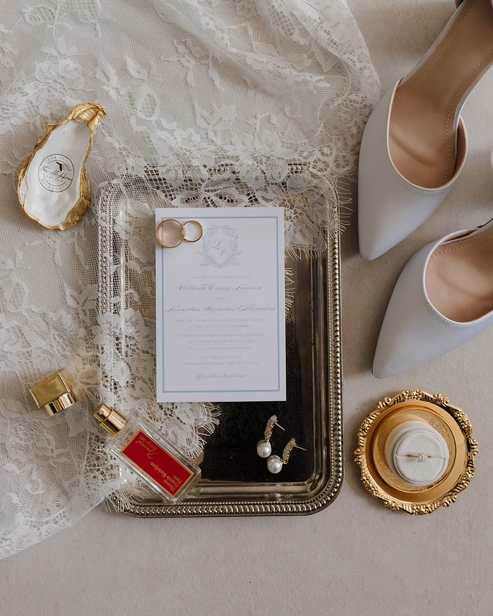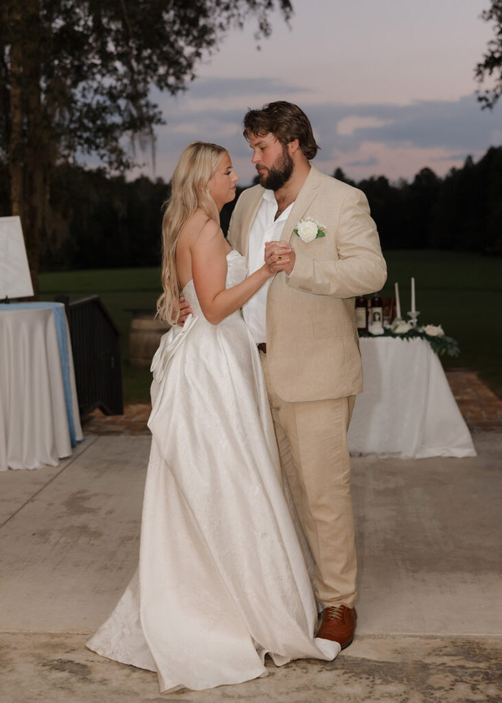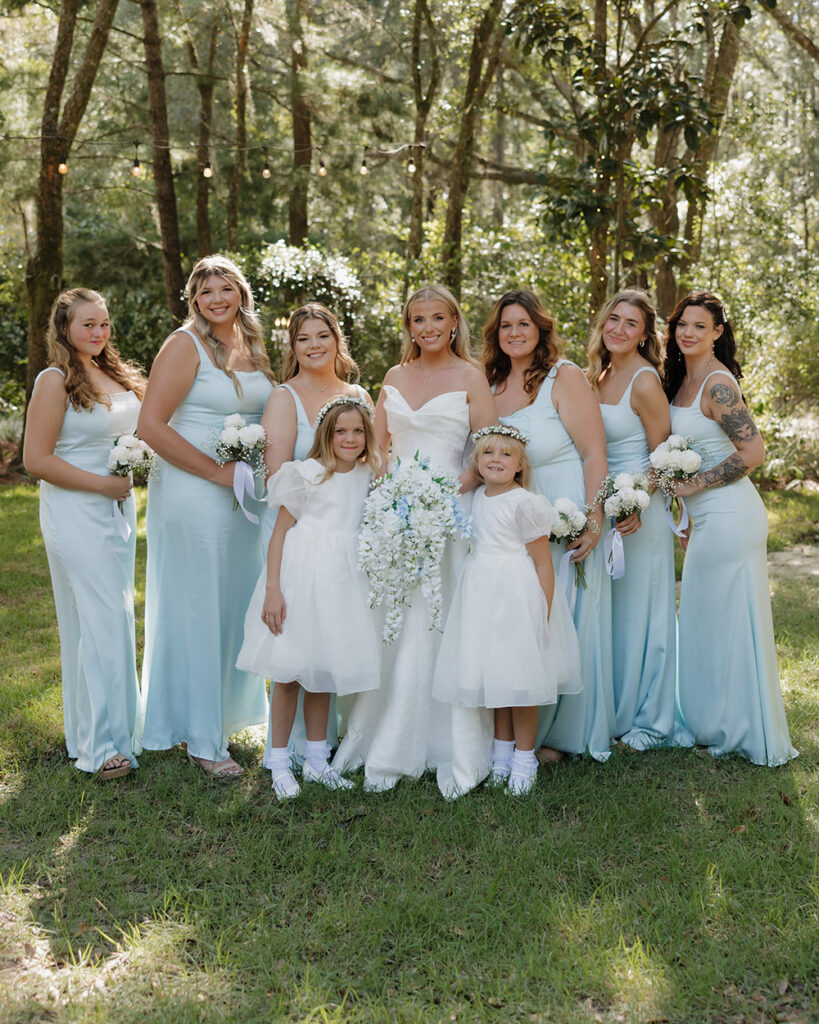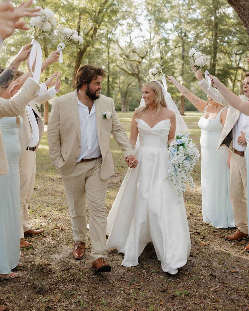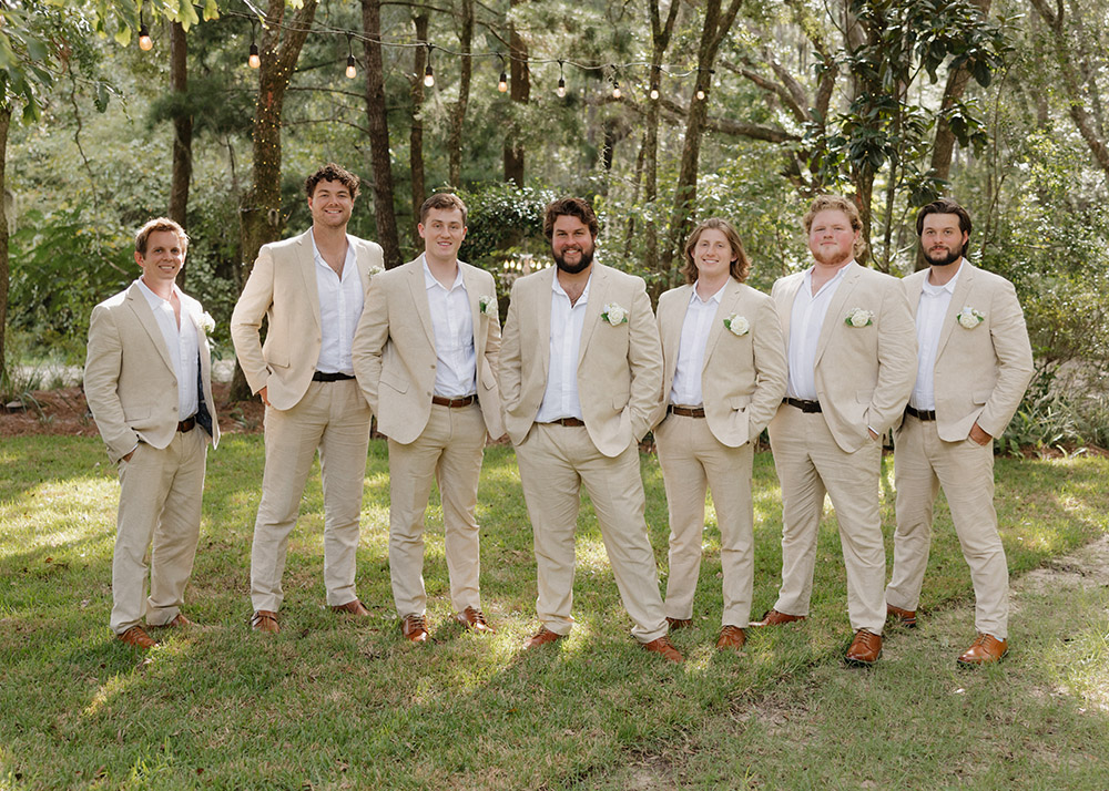 VENUE: Live Oak Plantation (Vernon, Fl) | OFFICIANT: Dalton Wilson | BRIDAL GOWN : Wtoo by Walters, Rebecca’s Bridal | BRIDESMAIDS’ GOWNS: Stacey’s Bridal | GROOM/GROOMSMEN ATTIRE: Joseph Abboud | PHOTOGRAPHER: Madison Higgins, Higgins Photo and Film | BAKERY: The Baykery | CEREMONY MUSIC: Strings Bespoke | RECEPTION ENTERTAINMENT: Spitfire Entertainment | HAIR + MAKEUP: Alexis Cain + Morgan Womack | HONEYMOON: Puerto Rico | WEDDING PLANNER/DESIGNER: Rachel McCarty | CATERER: Catering By Lisa | JEWELER: Melanie Casey | FAVORS: Hand picked oyster shells with custom logos that say “FROM FLORIDA WITH LOVE” | INVITATIONS: Custom Canva