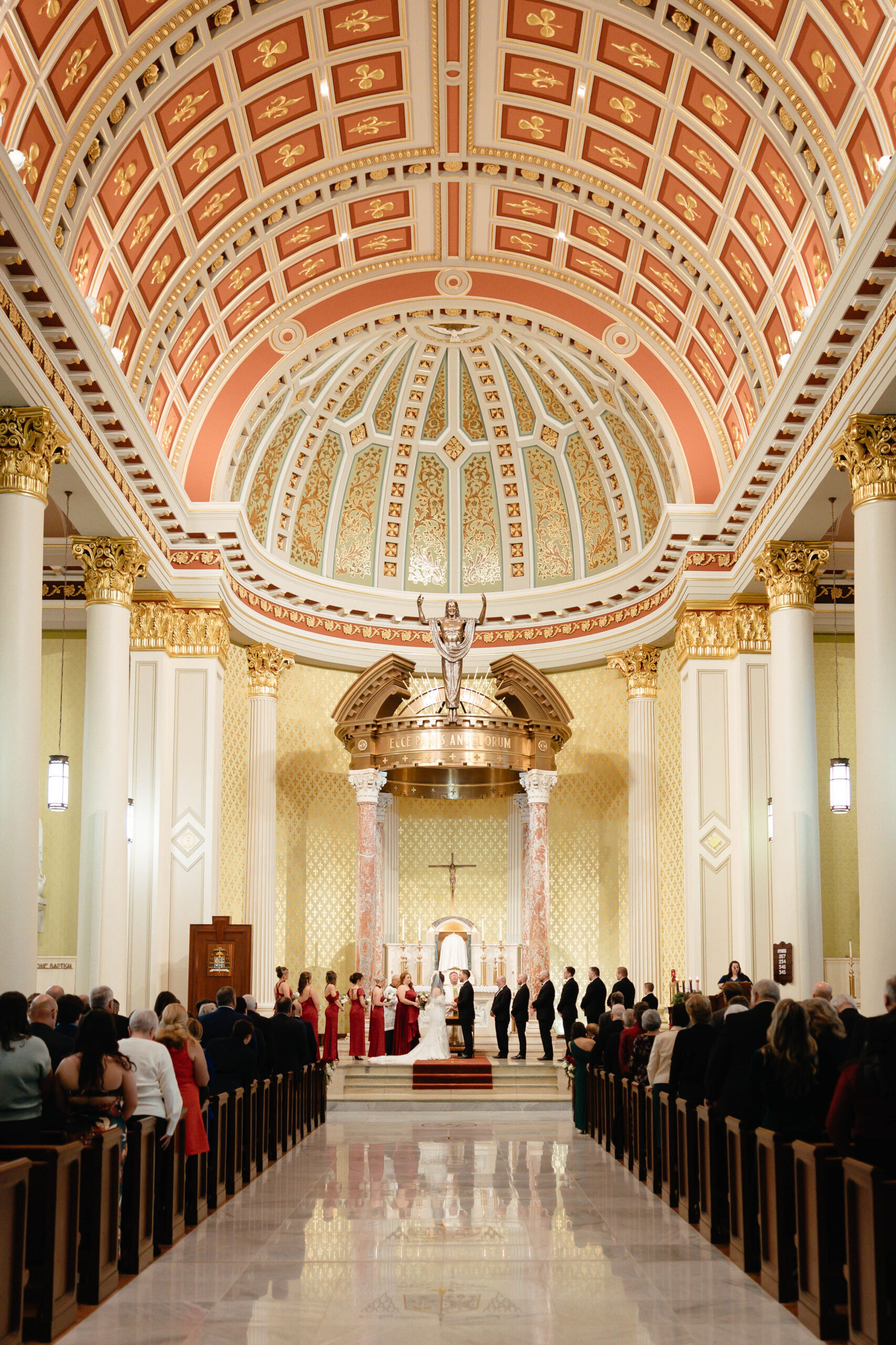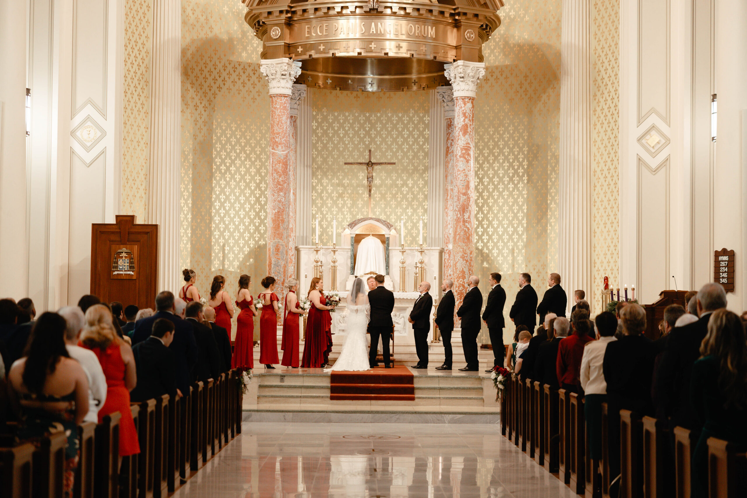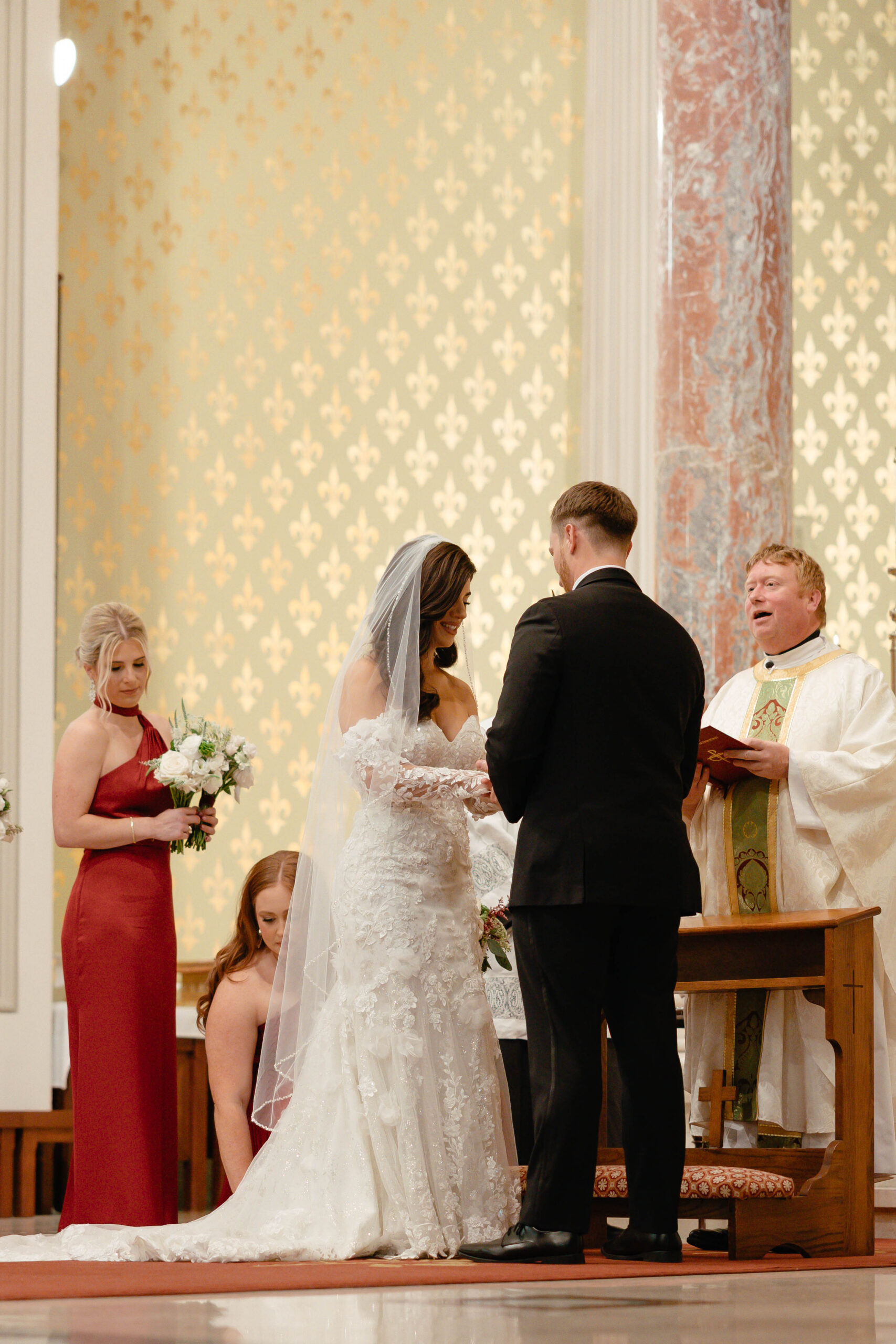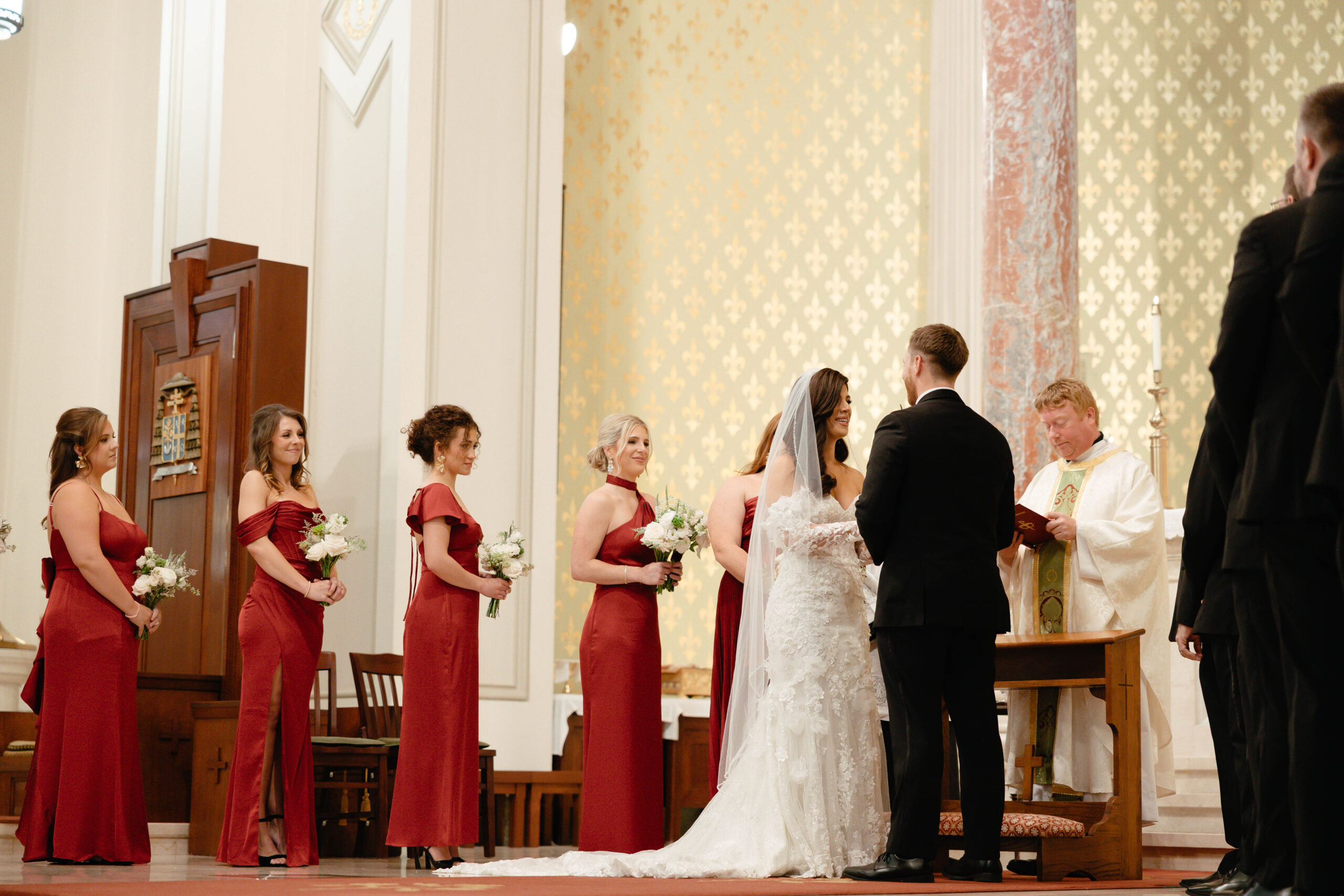 CEREMONY LOCATION: The Cathedral Basilica of the Immaculate Conception | OFFICIANT: Father Dan Good | RECEPTION LOCATION + CATERER: Crown Hall | CHAMPAGNE HOUR: Lupercalia Art Society and Gallery | BRIDAL GOWN: Yvonne La Fleur | BRIDESMAIDS’ GOWNS: Azazie | GROOM/GROOMSMEN ATTIRE: Calvin Klein from Jos. A Bank | PHOTOGRAPHER: Mary Patterson Wallace | FLORIST: Farm Girl Floral & Events | BAKERY: Pollman’s Bakery | SECOND LINE BAND: Excelsior Brass Band | RECEPTION ENTERTAINMENT: The Tip Tops | HAIR + MAKEUP: Hair by Lydia Bell and Makeup by Brittanie Summers | HONEYMOON: Greece | WEDDING PLANNER/DESIGNER: Jennifer Anderson with Farm Girl Florals | JEWELER: Janet Bruno Small | FAVORS: Christmas Ornaments with the Bride and Groom’s Names | INVITATIONS: It’s Inviting