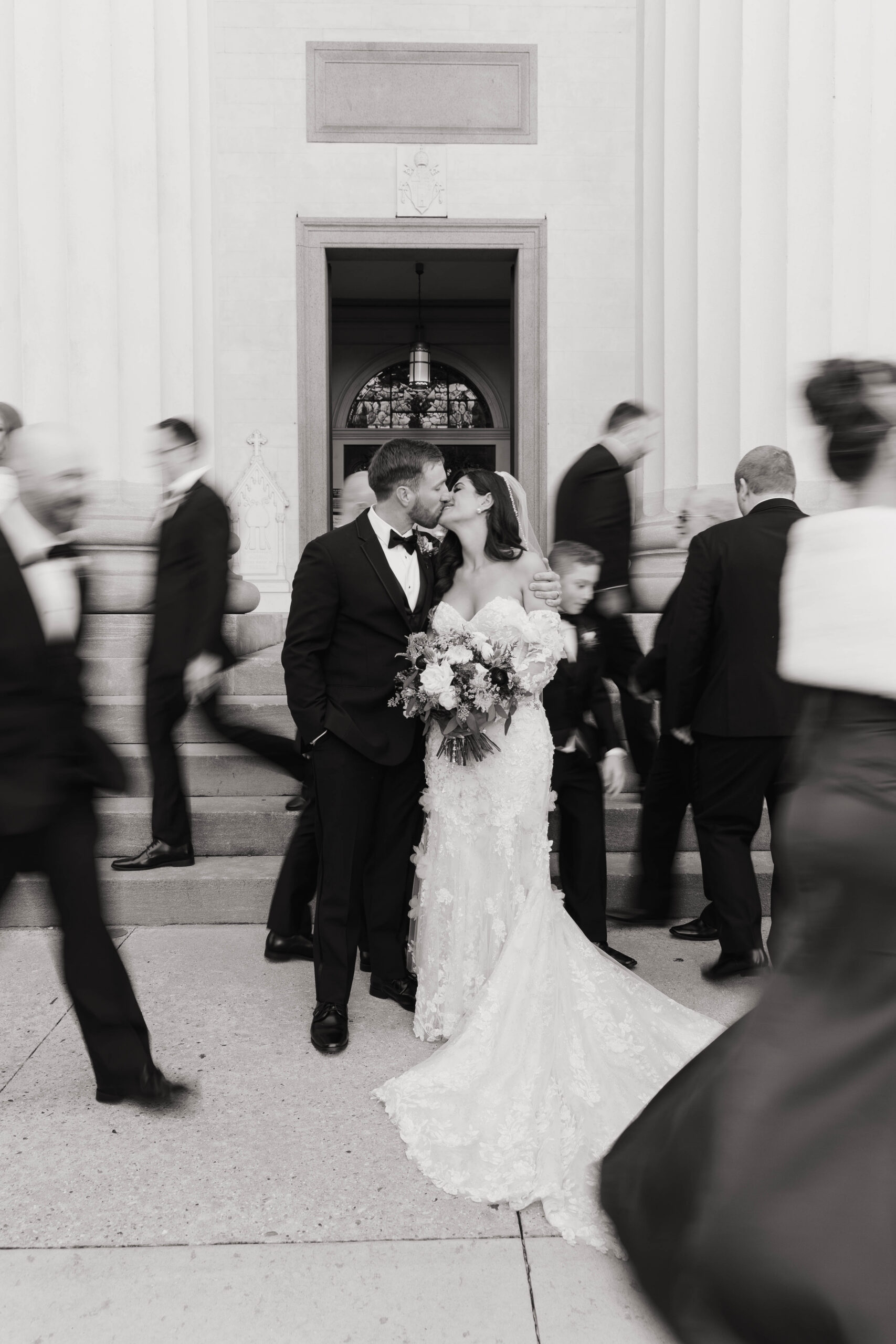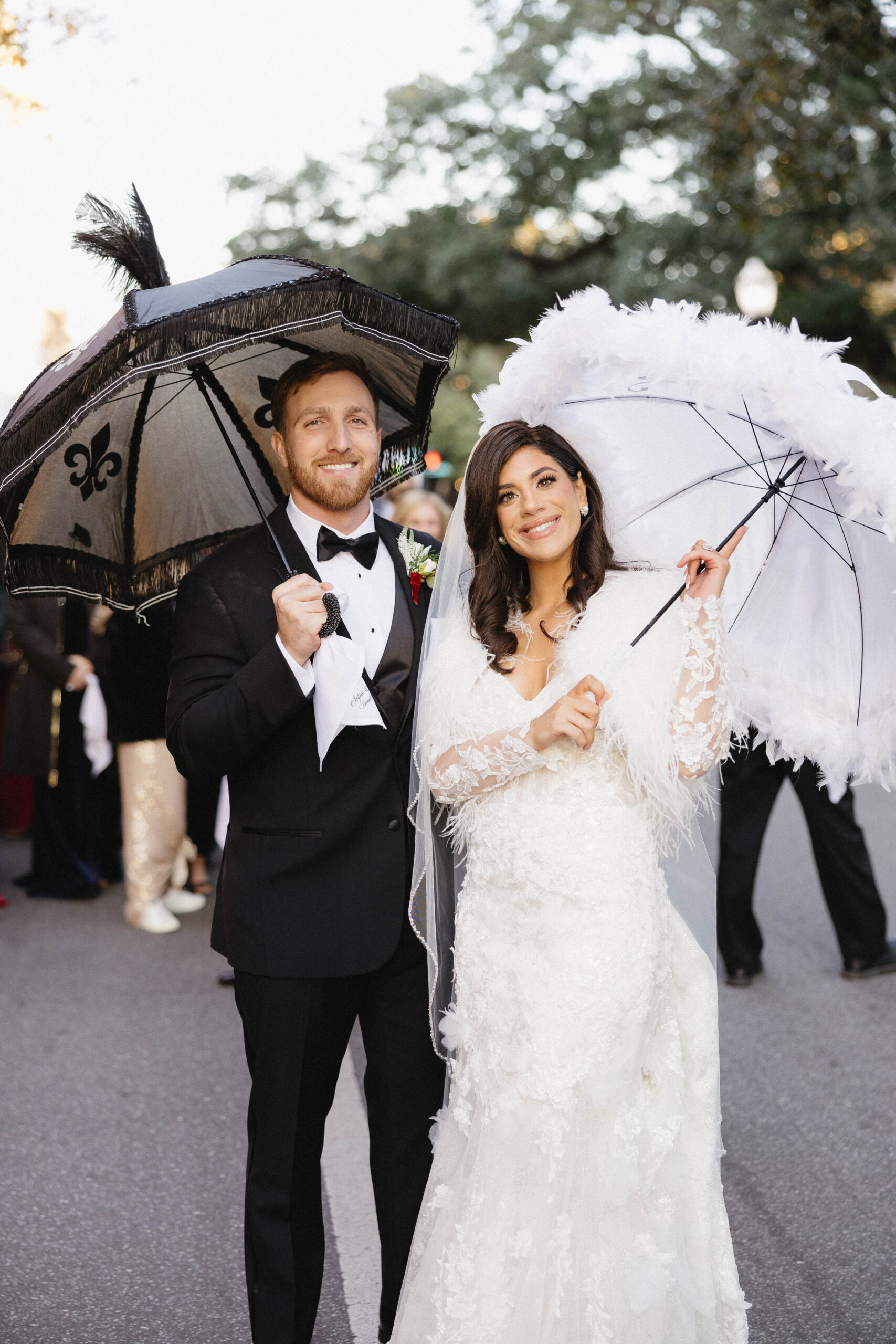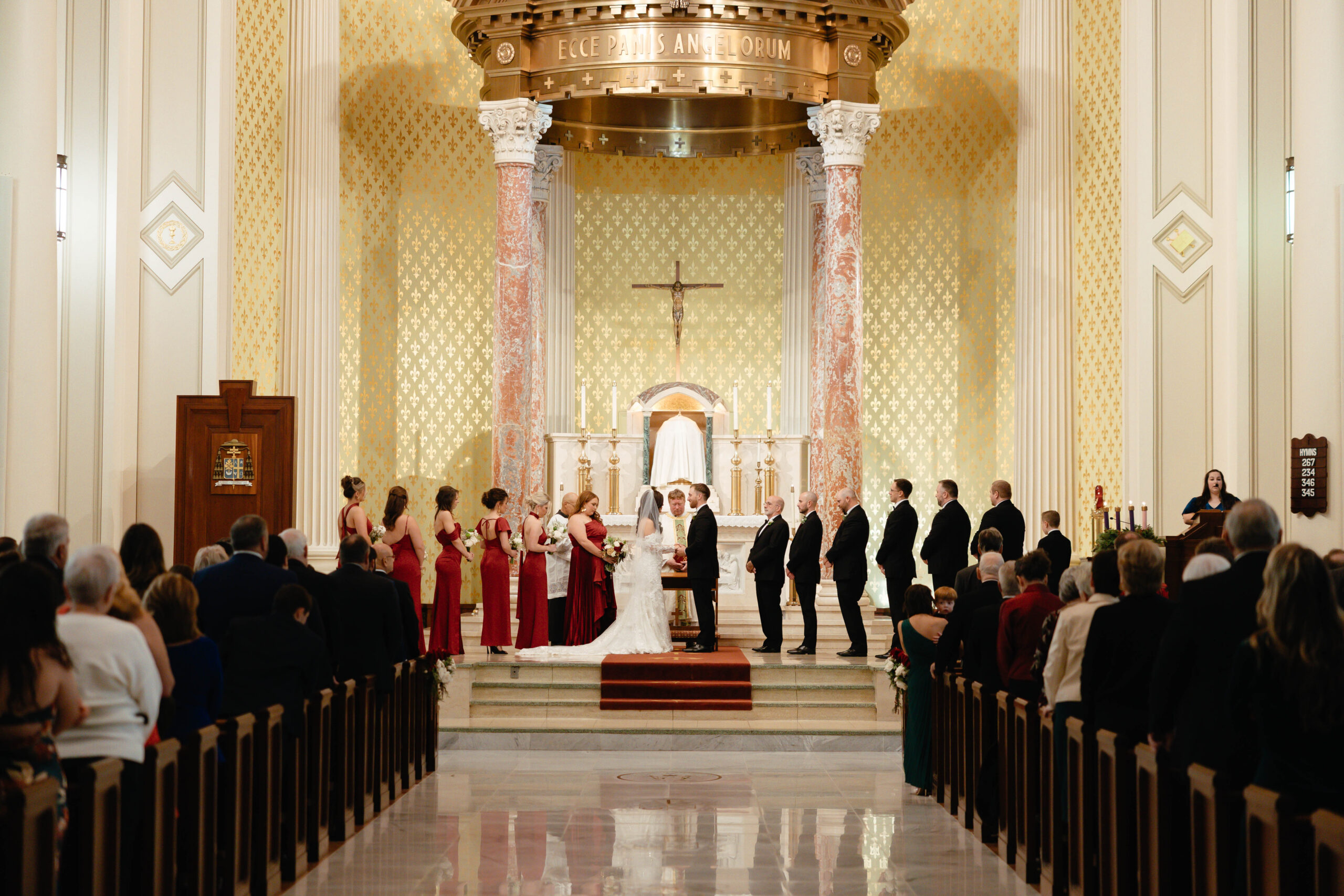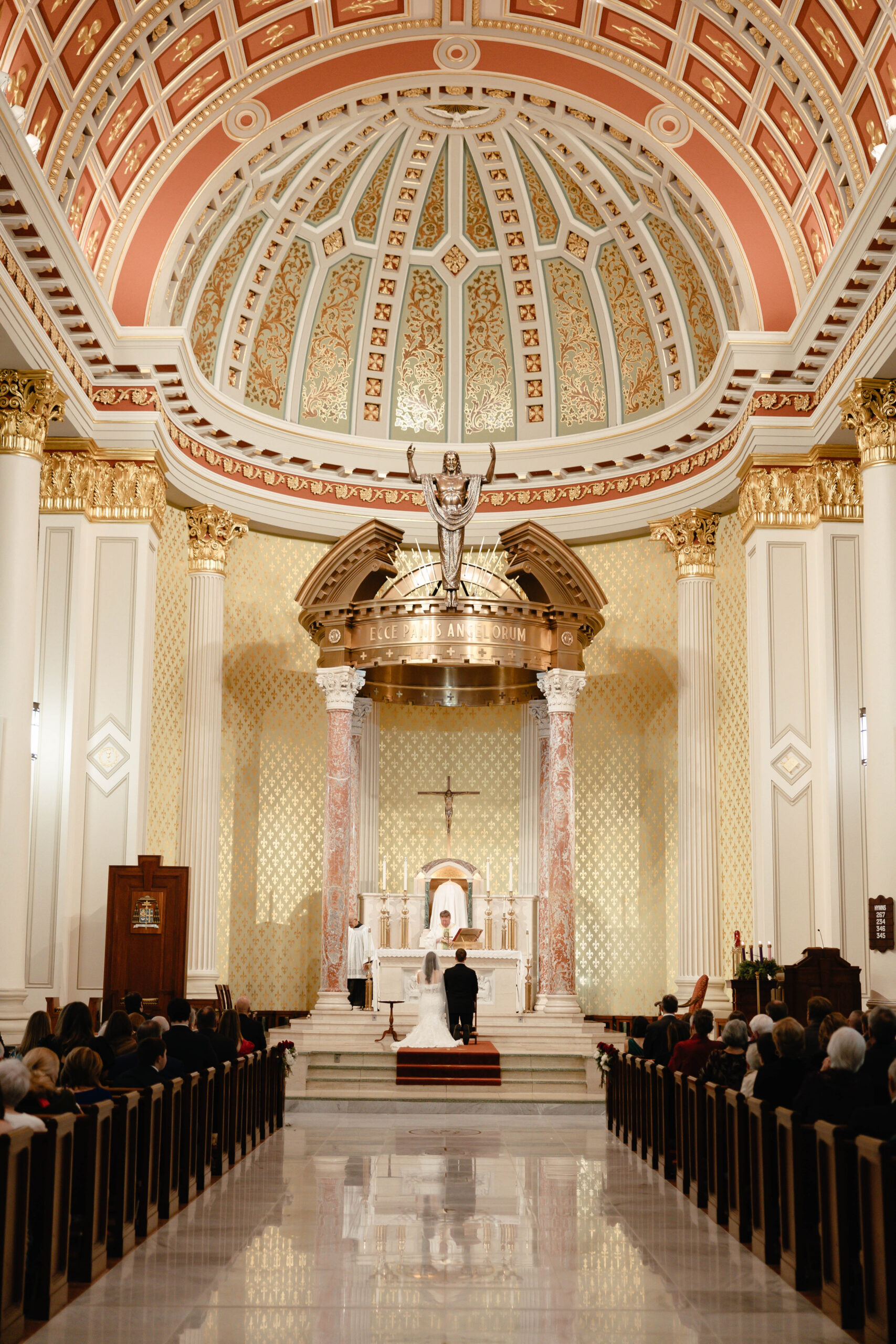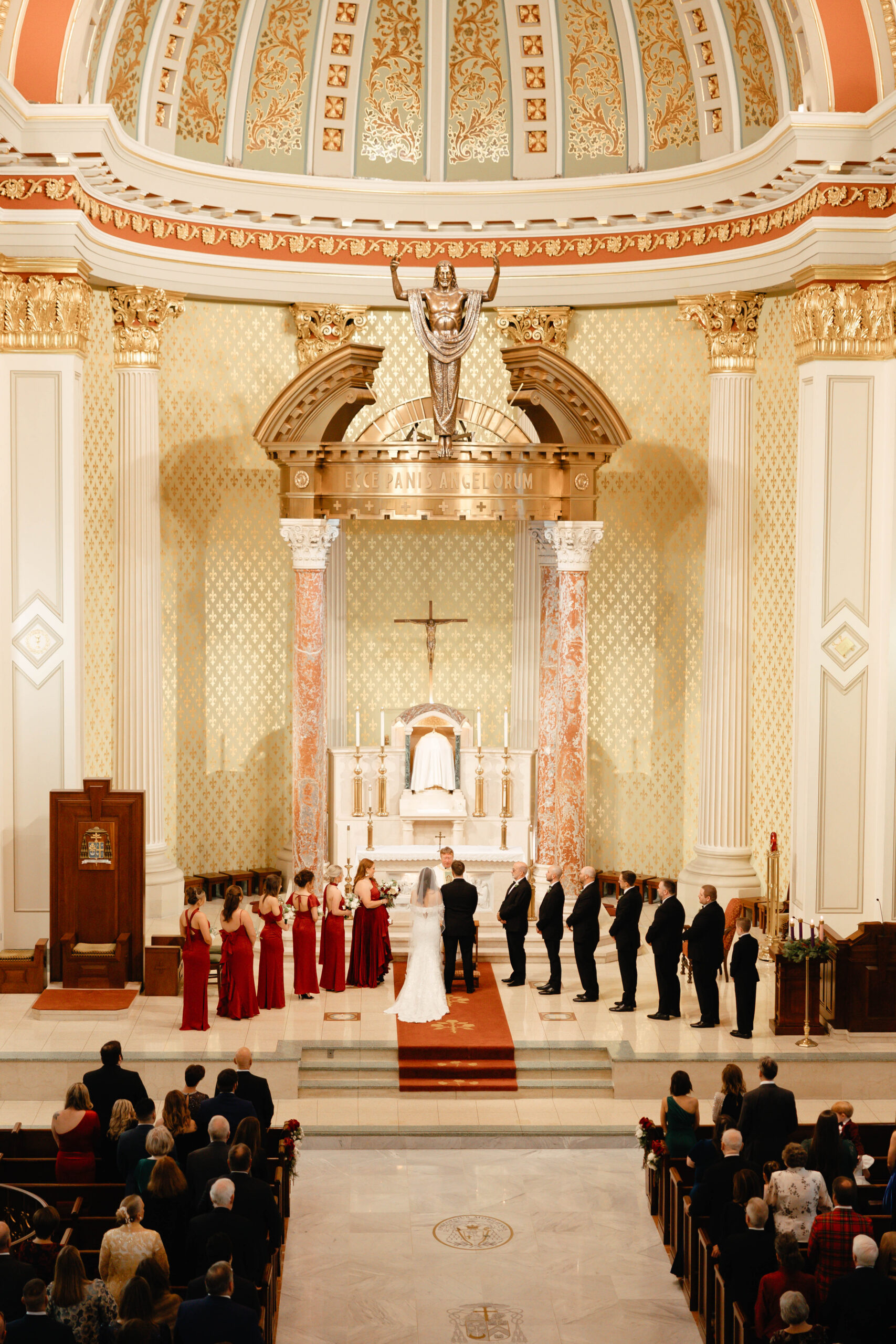 CEREMONY LOCATION: The Cathedral Basilica of the Immaculate Conception | OFFICIANT: Father Dan Good | RECEPTION LOCATION + CATERER: Crown Hall | CHAMPAGNE HOUR: Lupercalia Art Society and Gallery | BRIDAL GOWN: Yvonne La Fleur | BRIDESMAIDS’ GOWNS: Azazie | GROOM/GROOMSMEN ATTIRE: Calvin Klein from Jos. A Bank | PHOTOGRAPHER: Mary Patterson Wallace | FLORIST: Farm Girl Floral & Events | BAKERY: Pollman’s Bakery | SECOND LINE BAND: Excelsior Brass Band | RECEPTION ENTERTAINMENT: The Tip Tops | HAIR + MAKEUP: Hair by Lydia Bell and Makeup by Brittanie Summers | HONEYMOON: Greece | WEDDING PLANNER/DESIGNER: Jennifer Anderson with Farm Girl Florals | JEWELER: Janet Bruno Small | FAVORS: Christmas Ornaments with the Bride and Groom’s Names | INVITATIONS: It’s Inviting