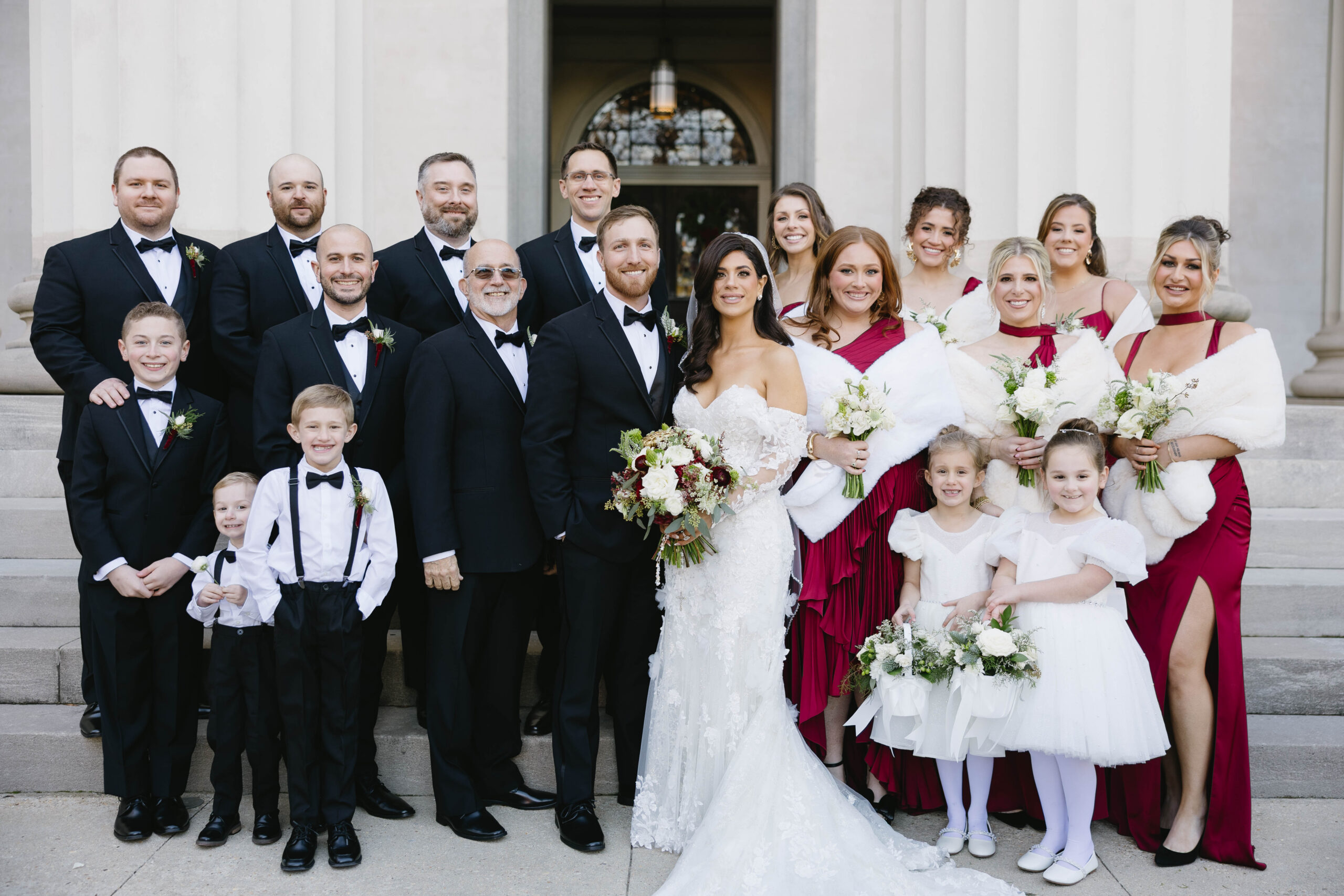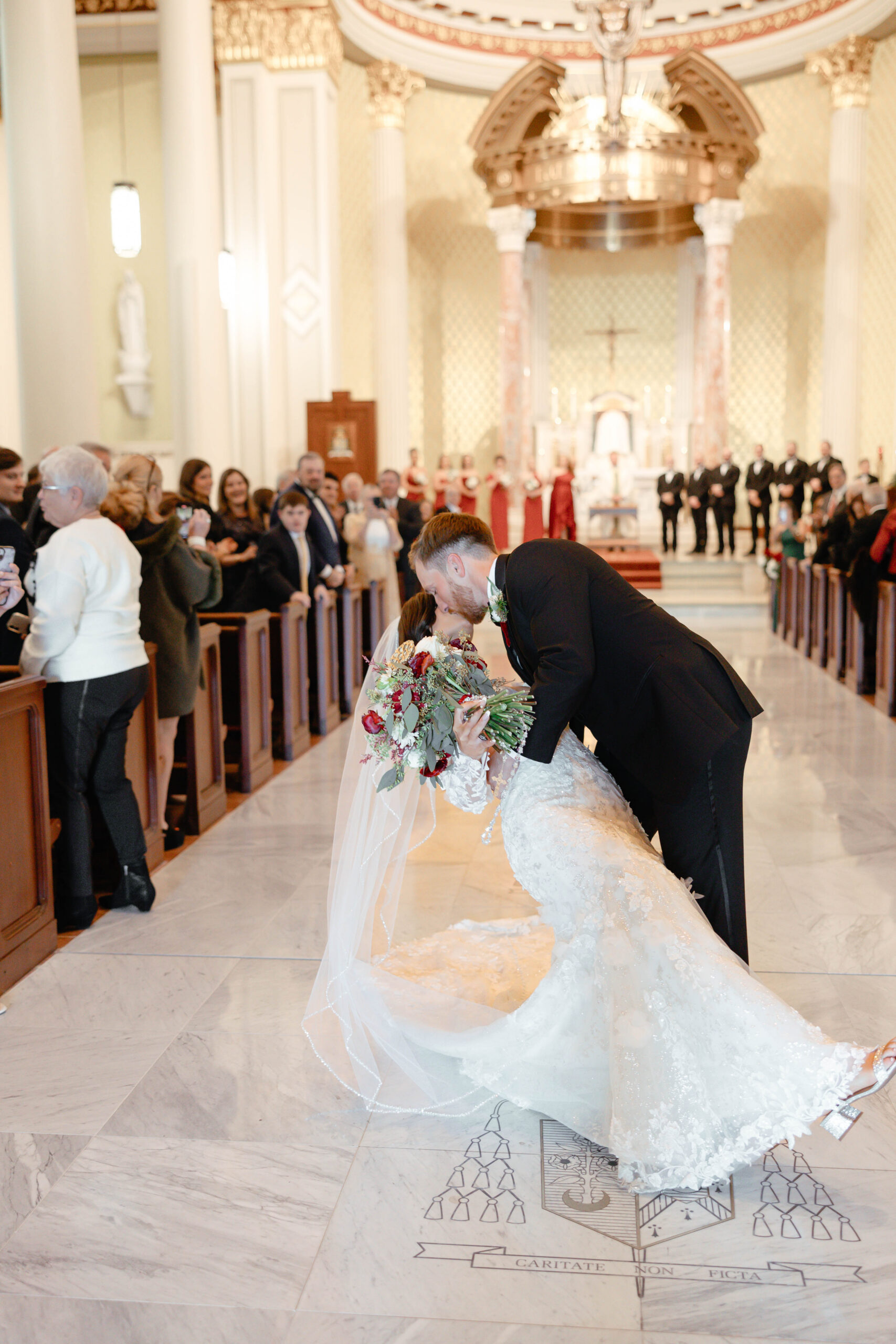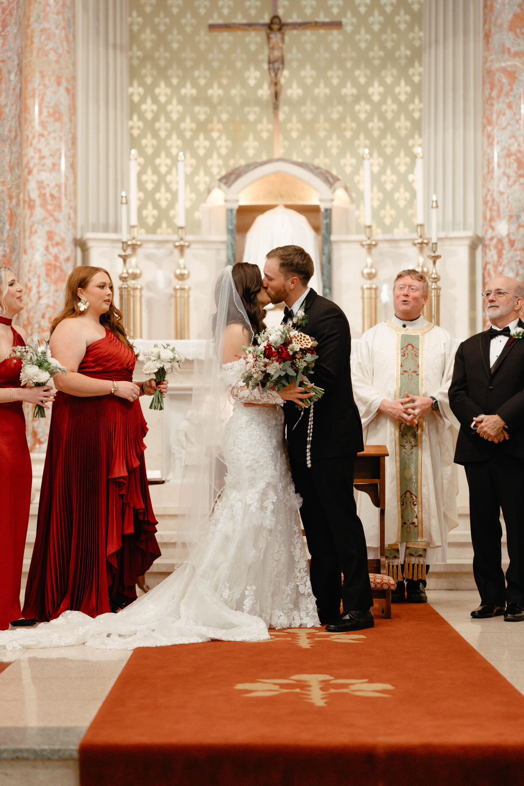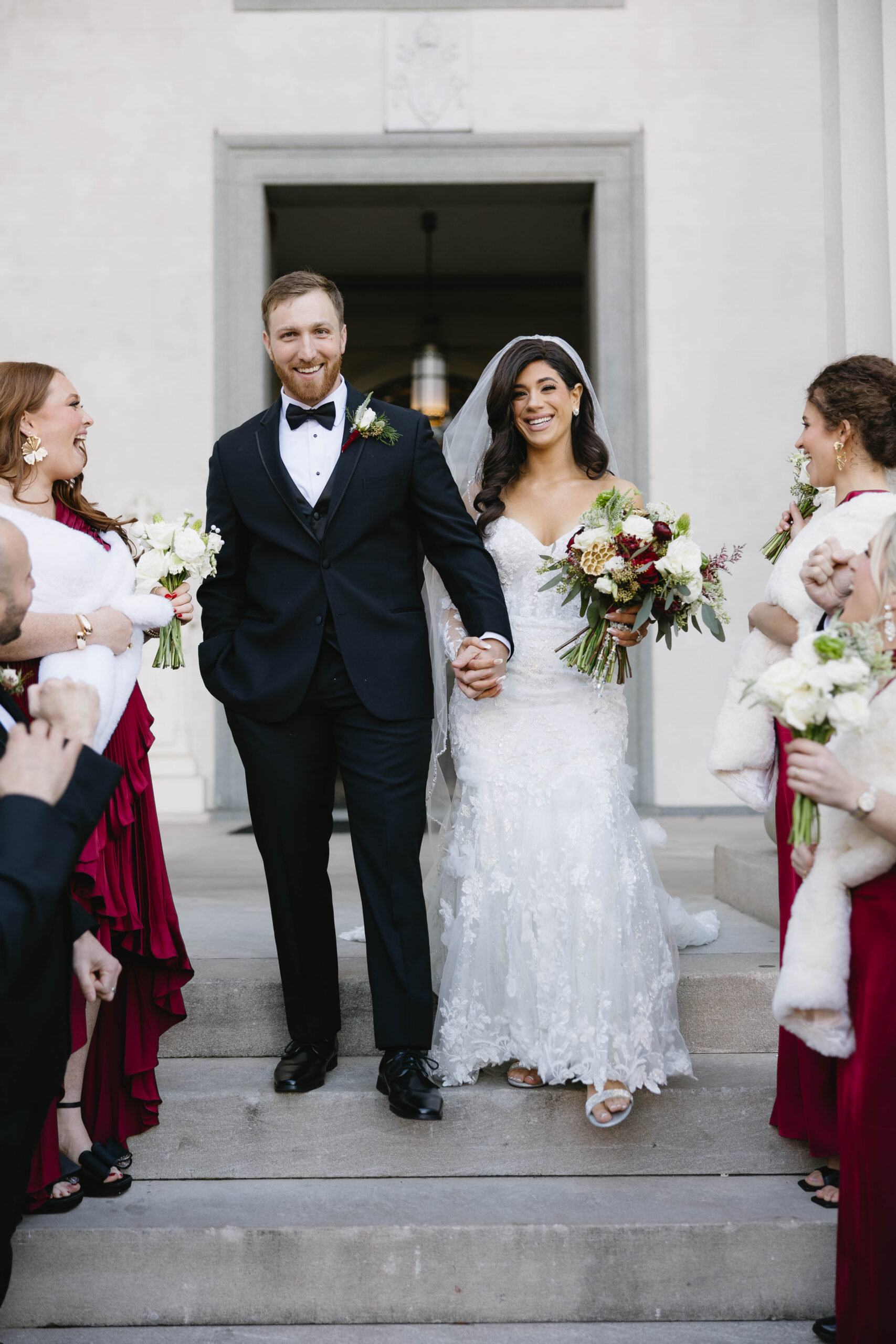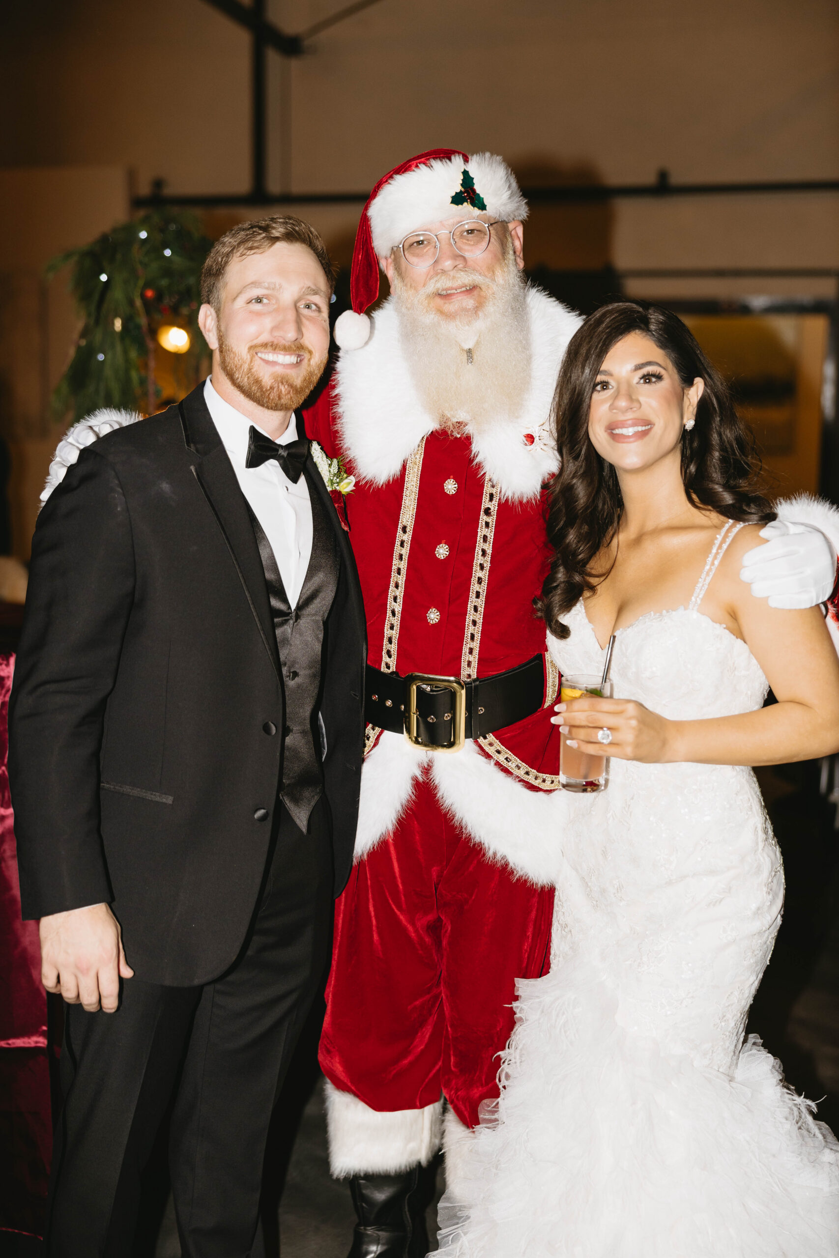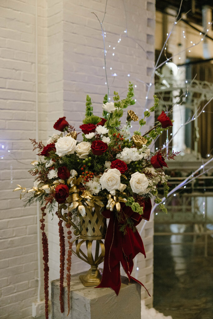 After a beautiful wedding Mass at the Cathedral-Basilica of the Immaculate Conception, the Excelsior BrassBand led the couple and their guests in a spirited second line through the streets of downtown Mobile to Crown Hall. There, they honored their Italian heritage with a custom Italian menu prepared by Bay Gourmet. A festive holiday theme ran throughout the day, with traditional Christmas colors in the florals and a special surprise appearance from Santa himself, who handed out personalized ornament favors engraved with the couple’s names and wedding date.