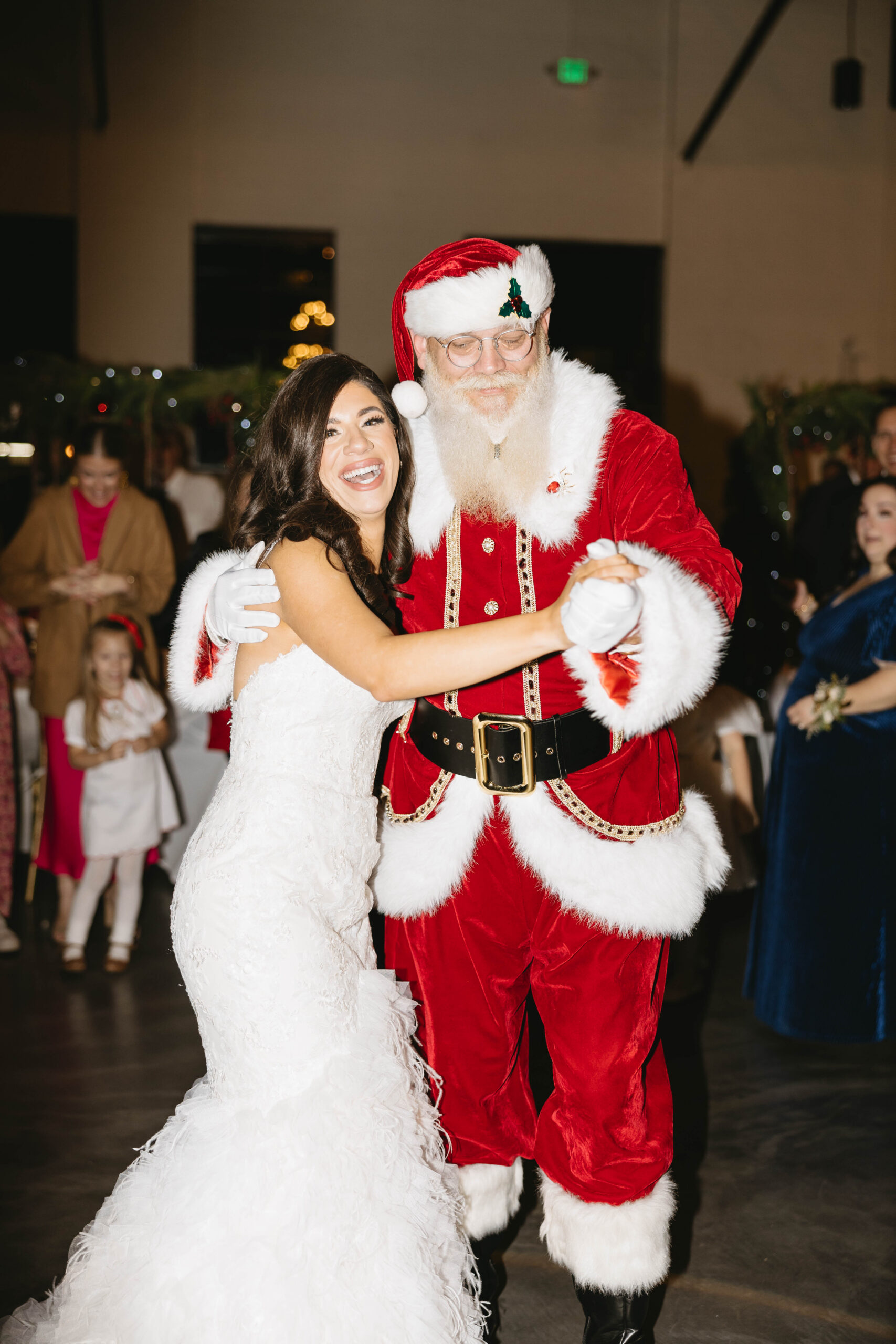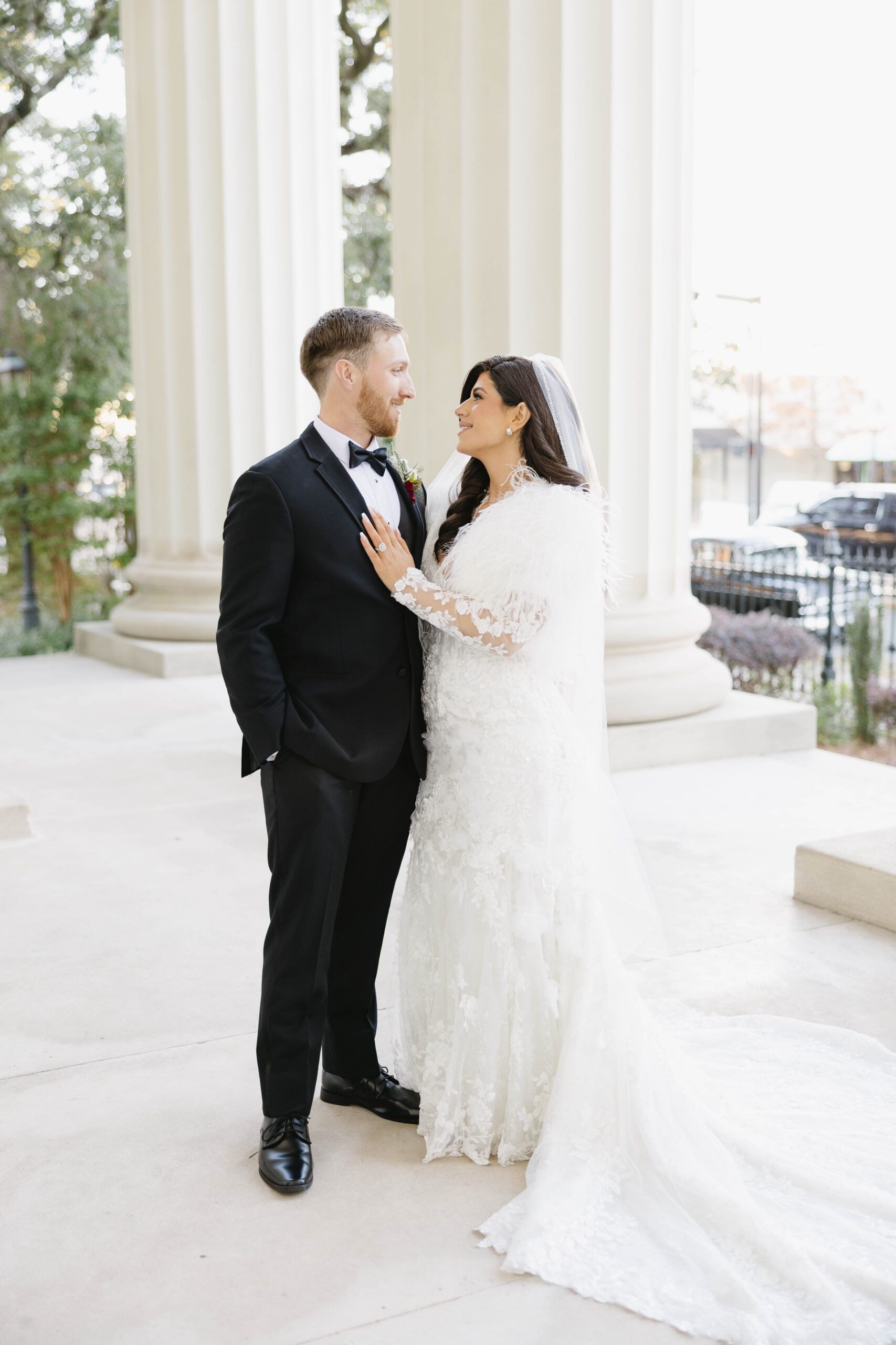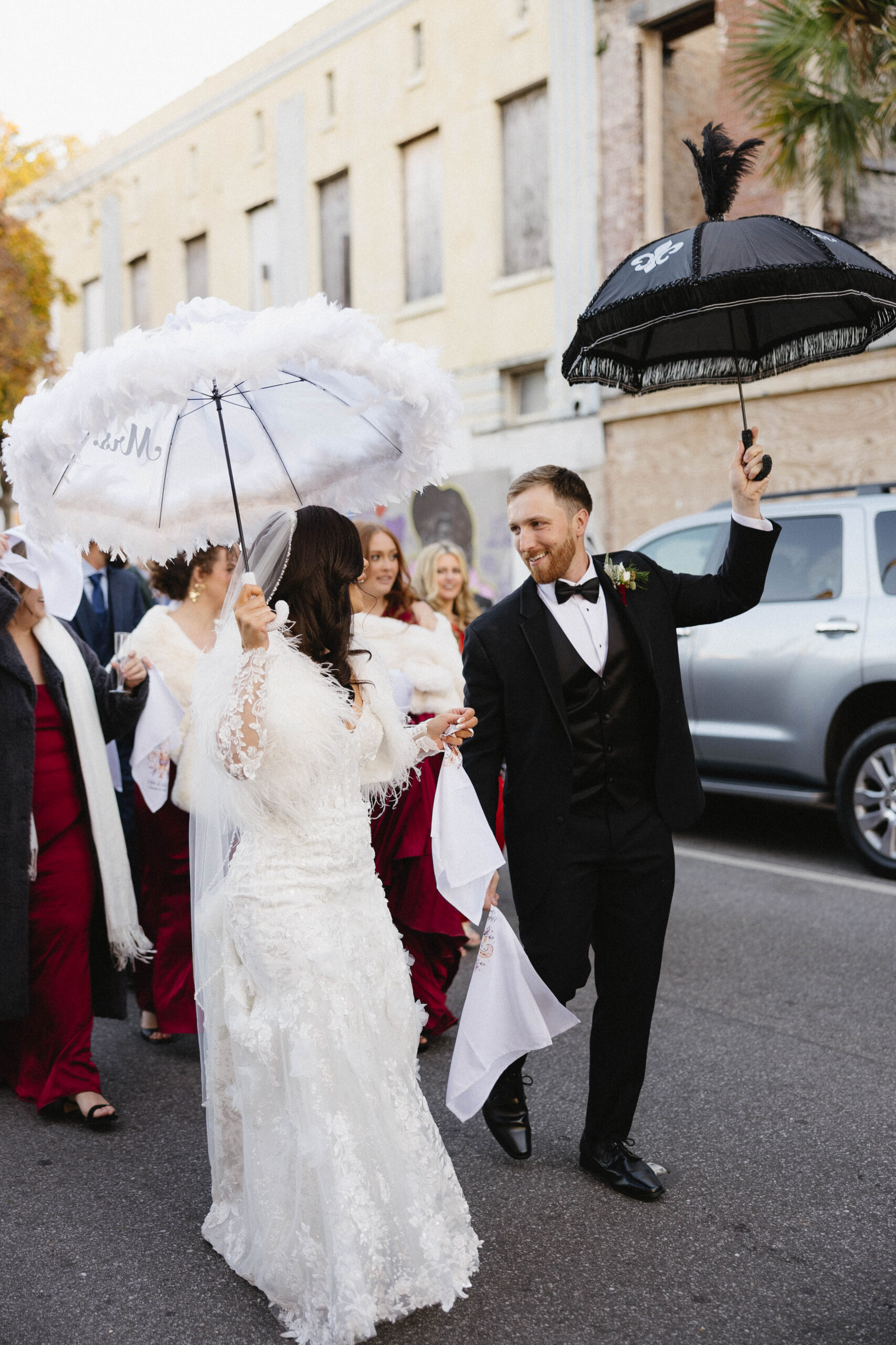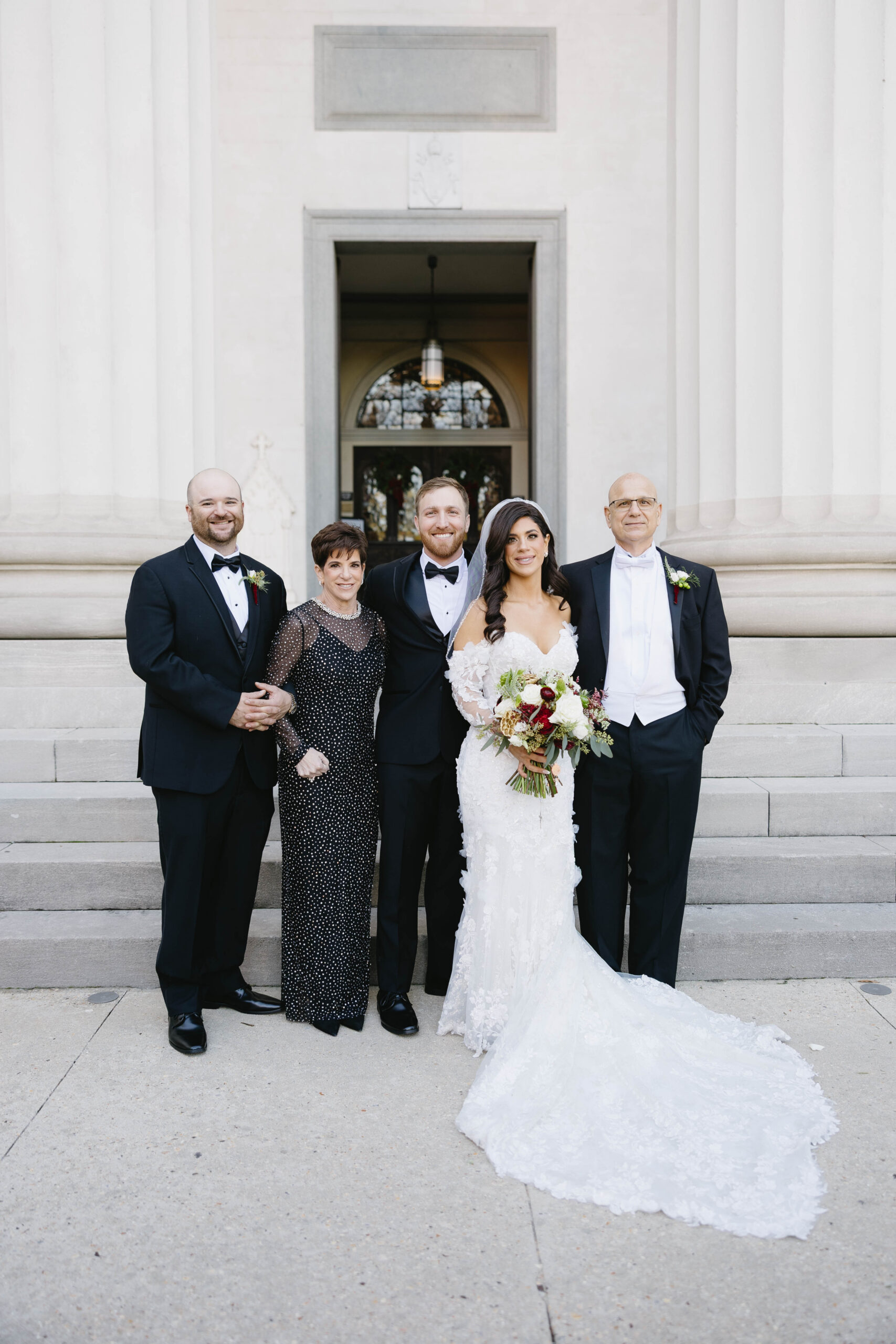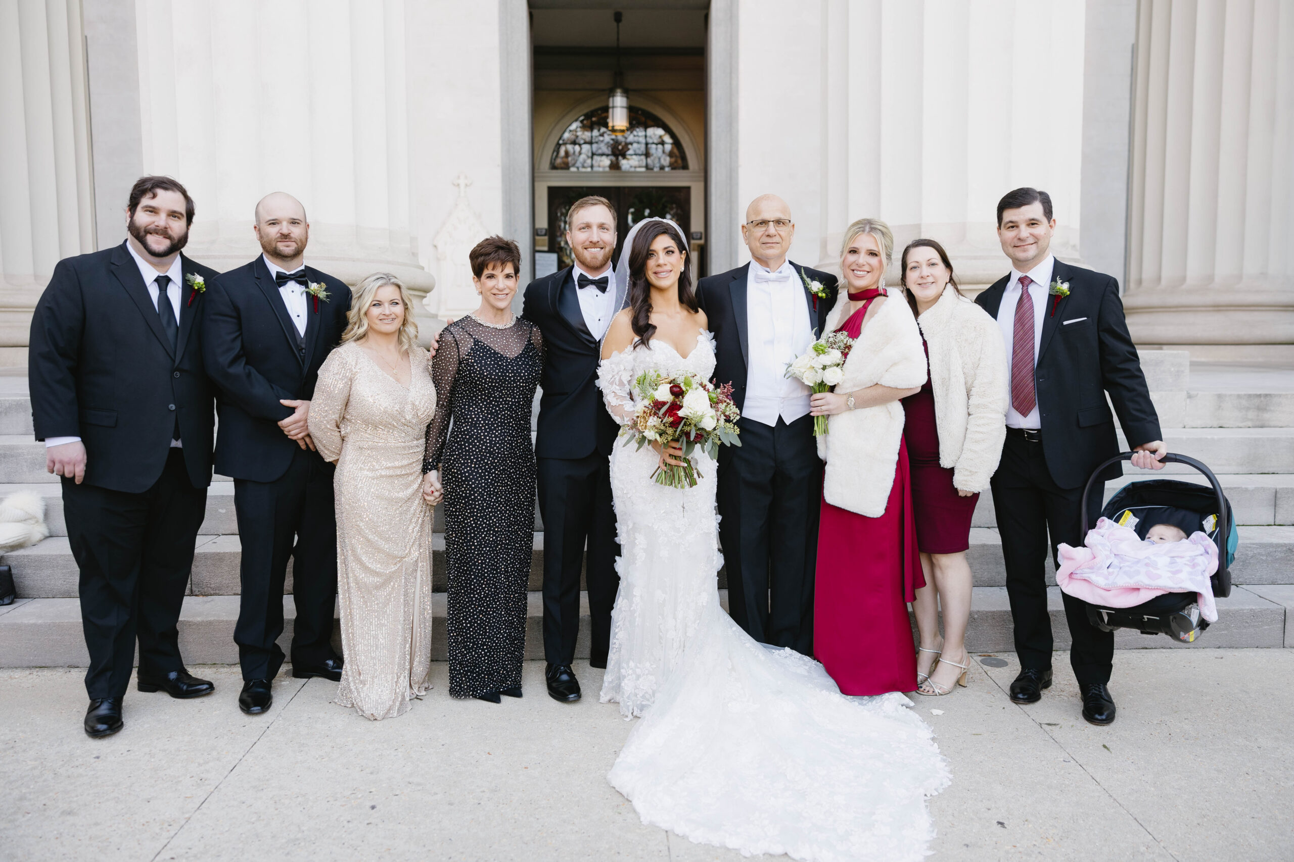 After a beautiful wedding Mass at the Cathedral-Basilica of the Immaculate Conception, the Excelsior BrassBand led the couple and their guests in a spirited second line through the streets of downtown Mobile to Crown Hall. There, they honored their Italian heritage with a custom Italian menu prepared by Bay Gourmet. A festive holiday theme ran throughout the day, with traditional Christmas colors in the florals and a special surprise appearance from Santa himself, who handed out personalized ornament favors engraved with the couple’s names and wedding date.