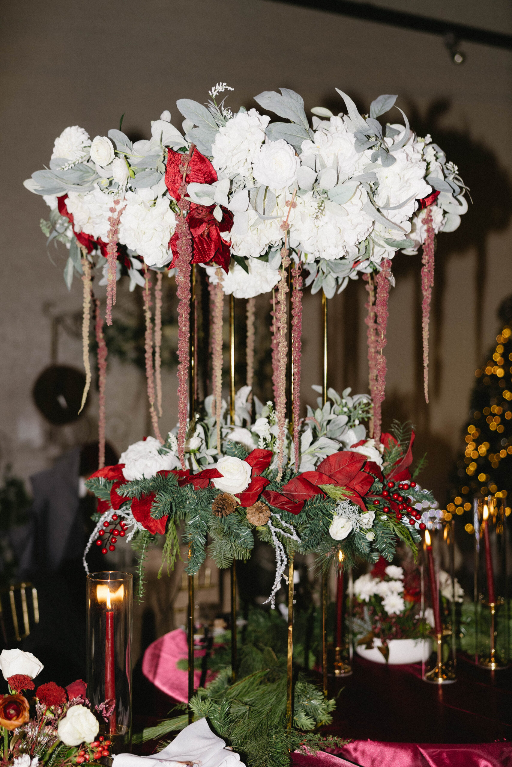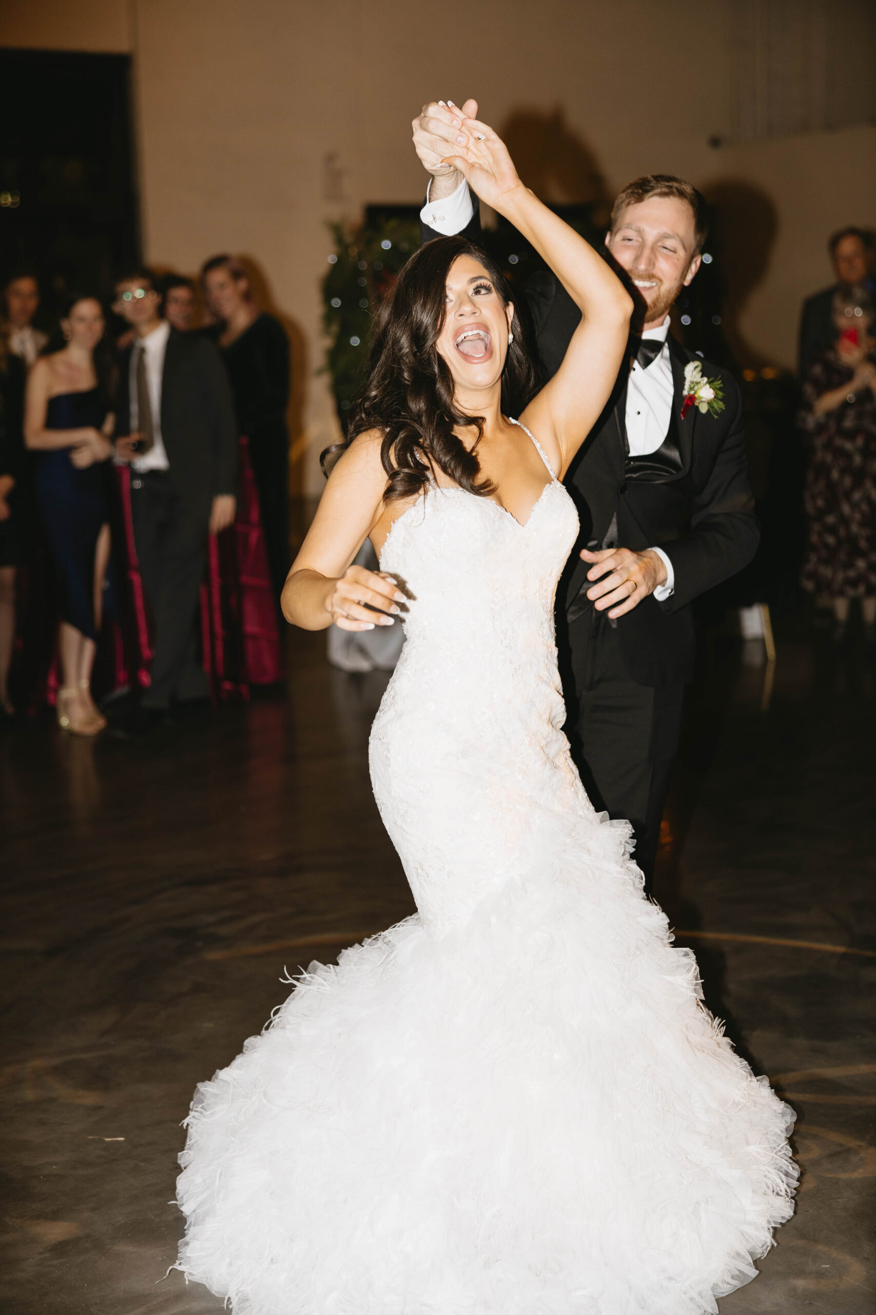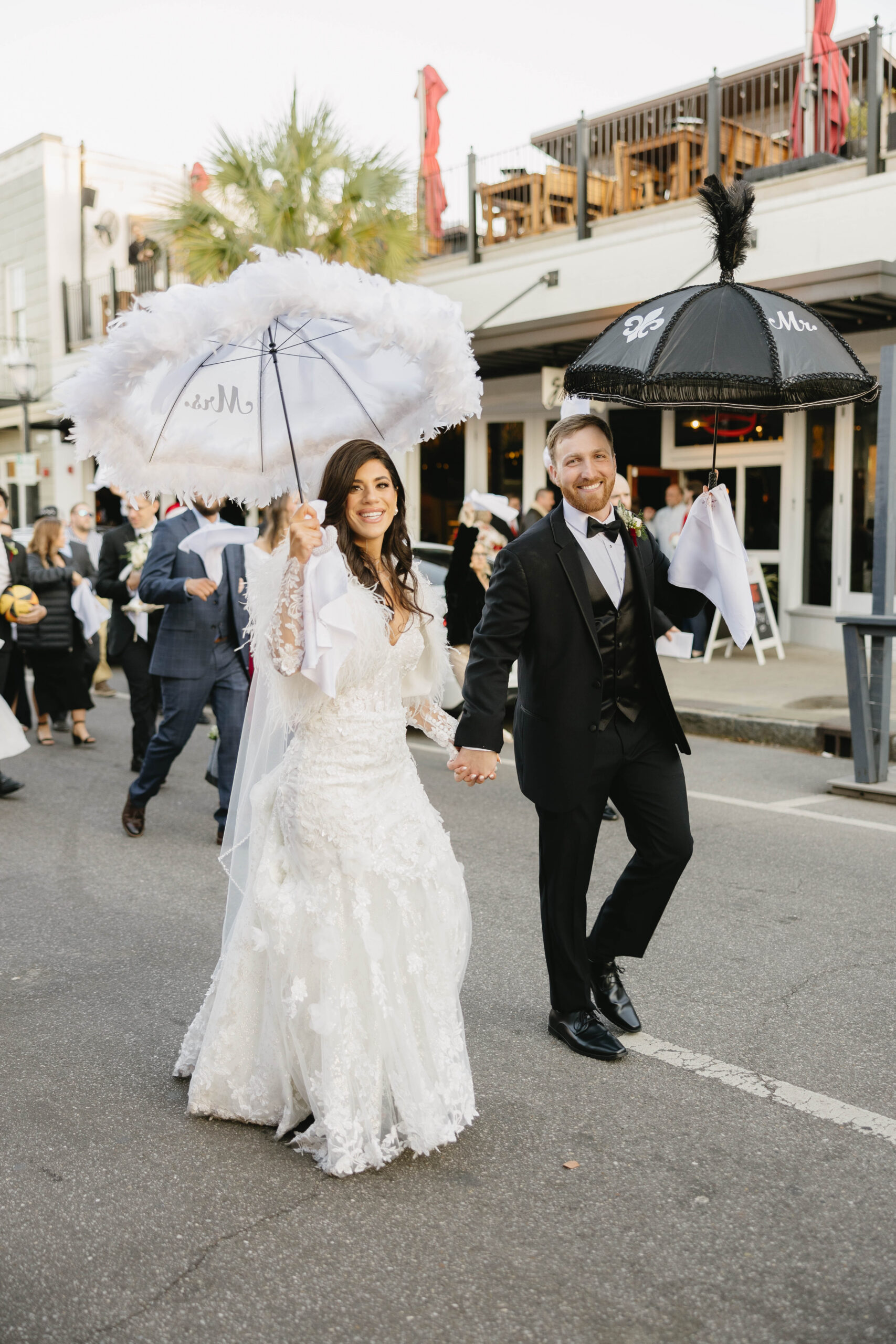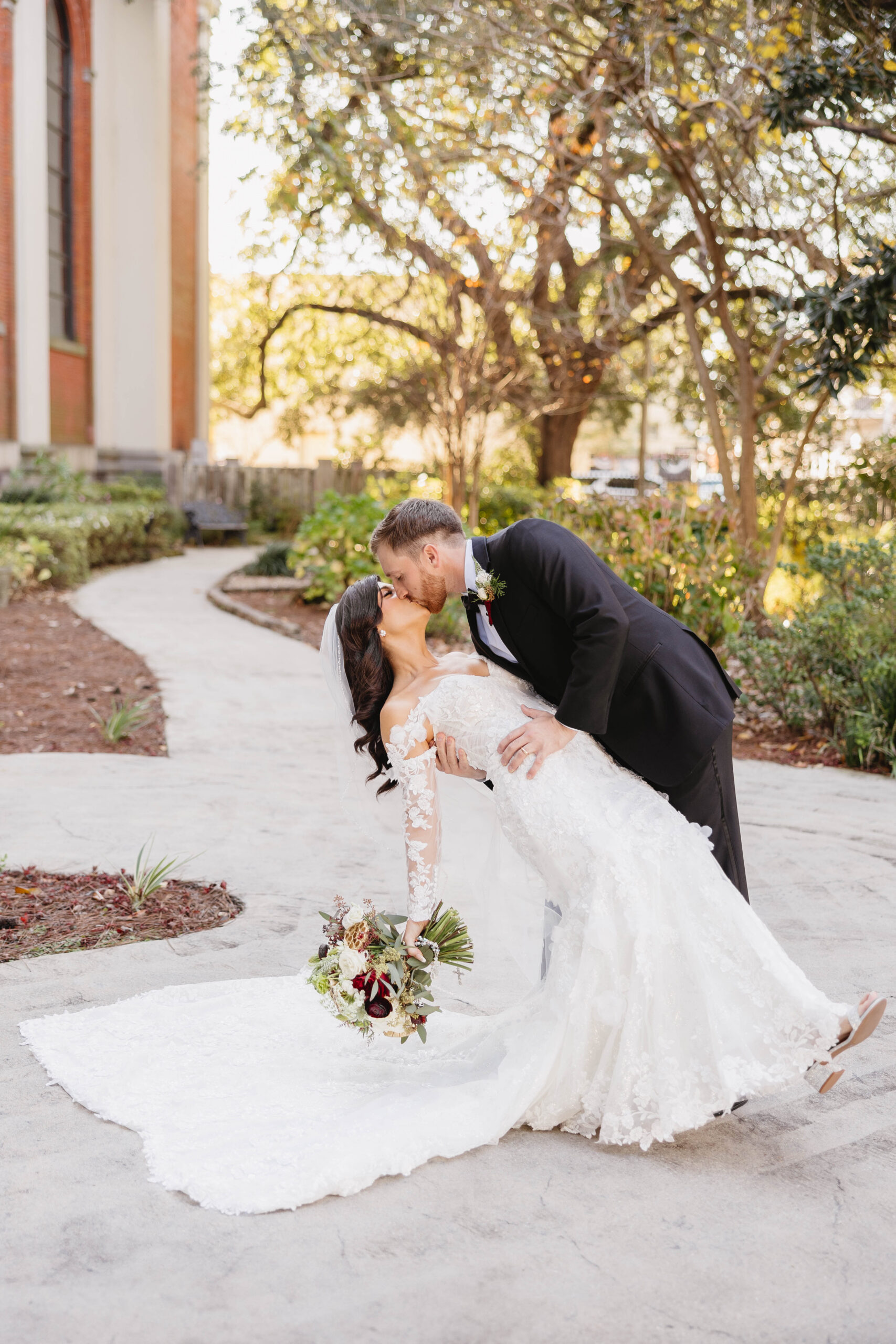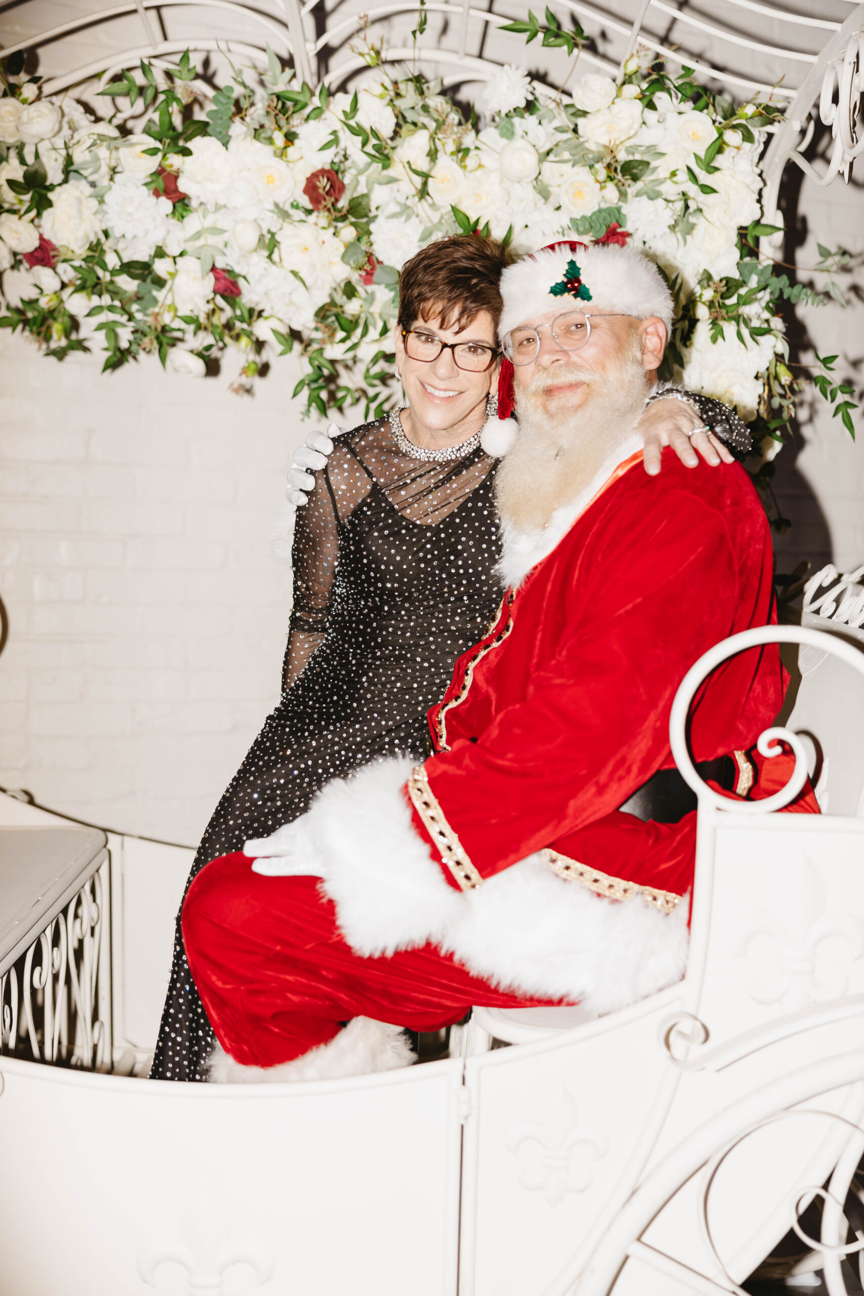 After a beautiful wedding Mass at the Cathedral-Basilica of the Immaculate Conception, the Excelsior BrassBand led the couple and their guests in a spirited second line through the streets of downtown Mobile to Crown Hall. There, they honored their Italian heritage with a custom Italian menu prepared by Bay Gourmet. A festive holiday theme ran throughout the day, with traditional Christmas colors in the florals and a special surprise appearance from Santa himself, who handed out personalized ornament favors engraved with the couple’s names and wedding date.