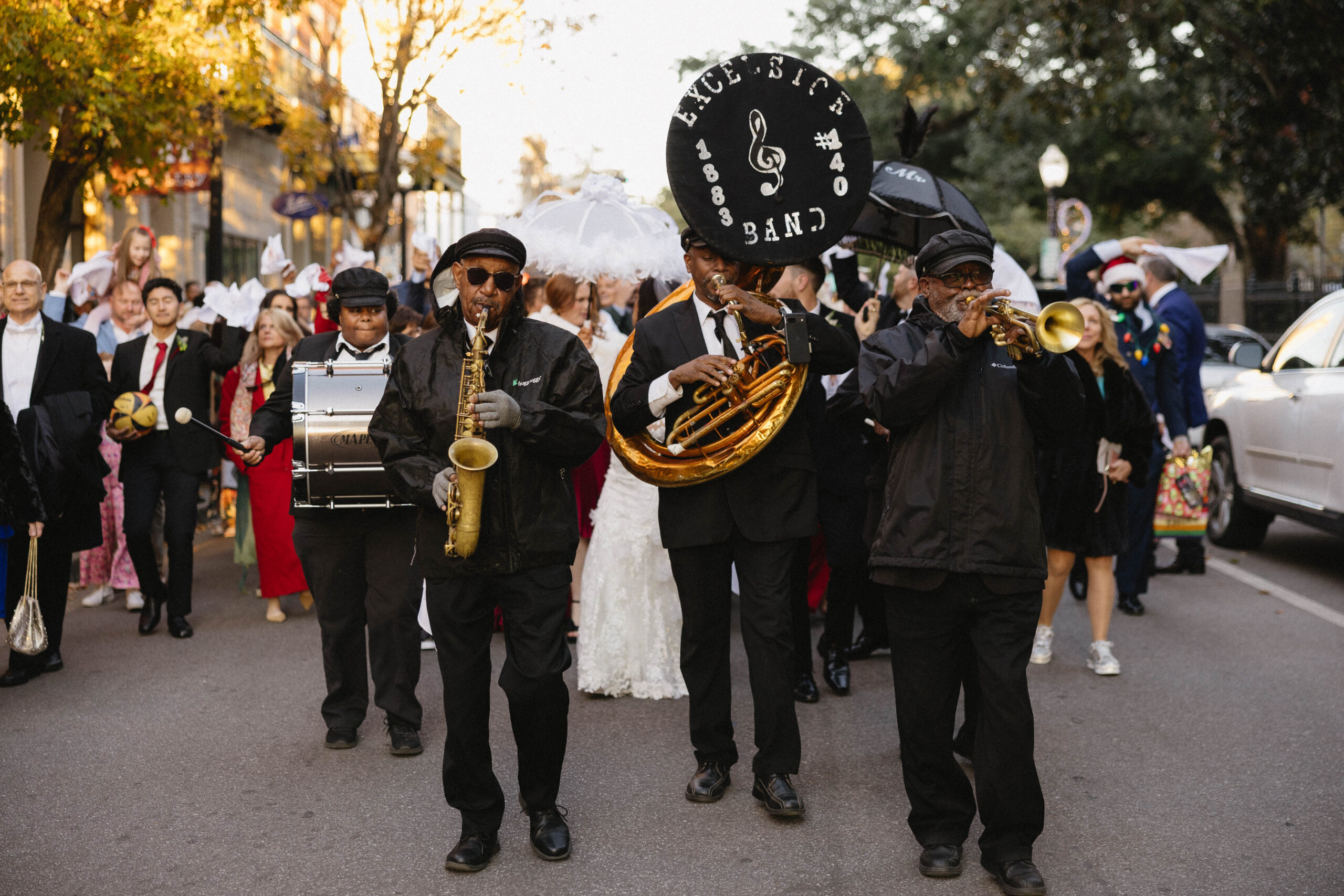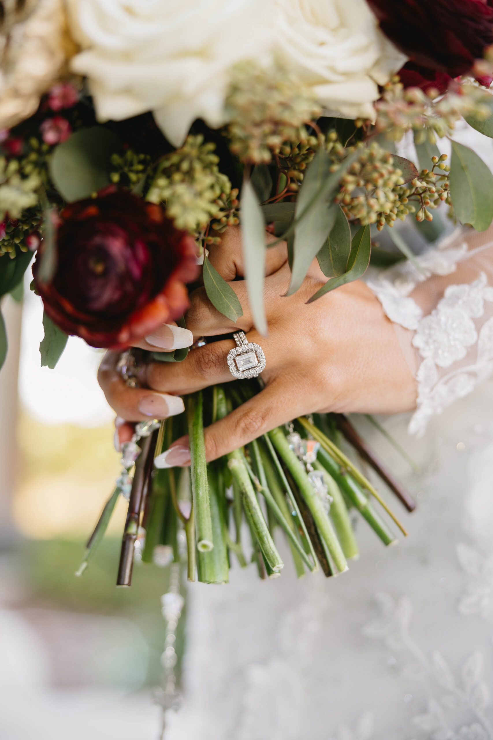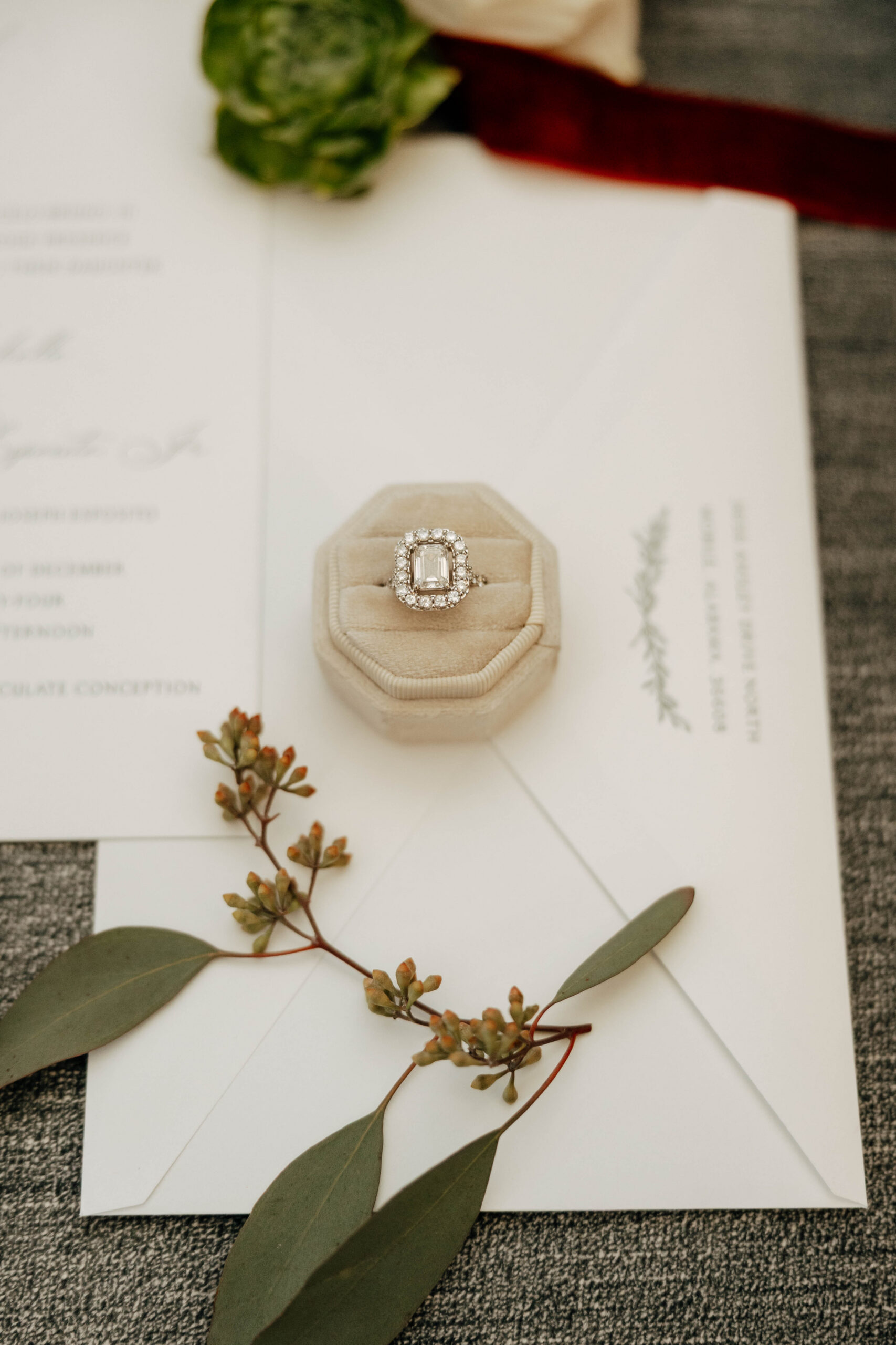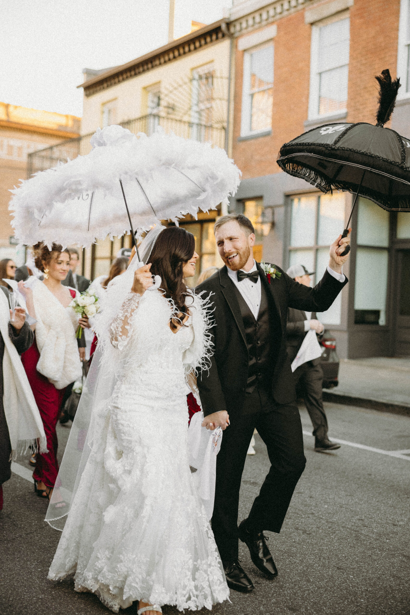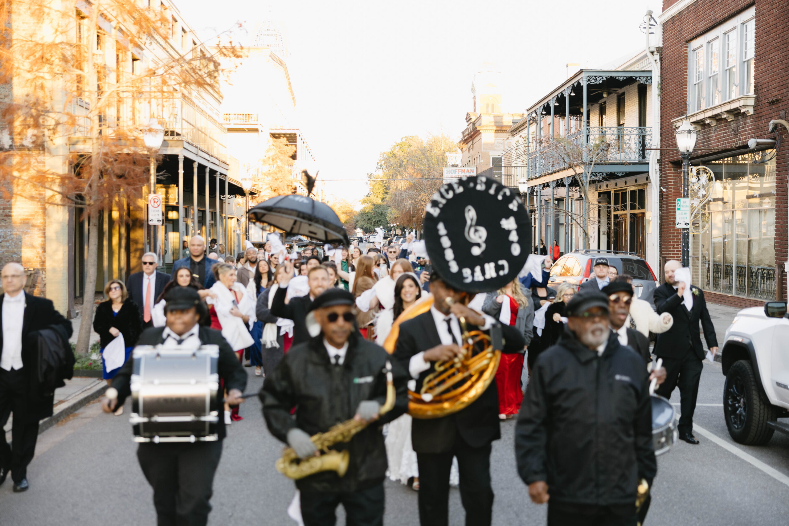 After a beautiful wedding Mass at the Cathedral-Basilica of the Immaculate Conception, the Excelsior BrassBand led the couple and their guests in a spirited second line through the streets of downtown Mobile to Crown Hall. There, they honored their Italian heritage with a custom Italian menu prepared by Bay Gourmet. A festive holiday theme ran throughout the day, with traditional Christmas colors in the florals and a special surprise appearance from Santa himself, who handed out personalized ornament favors engraved with the couple’s names and wedding date.