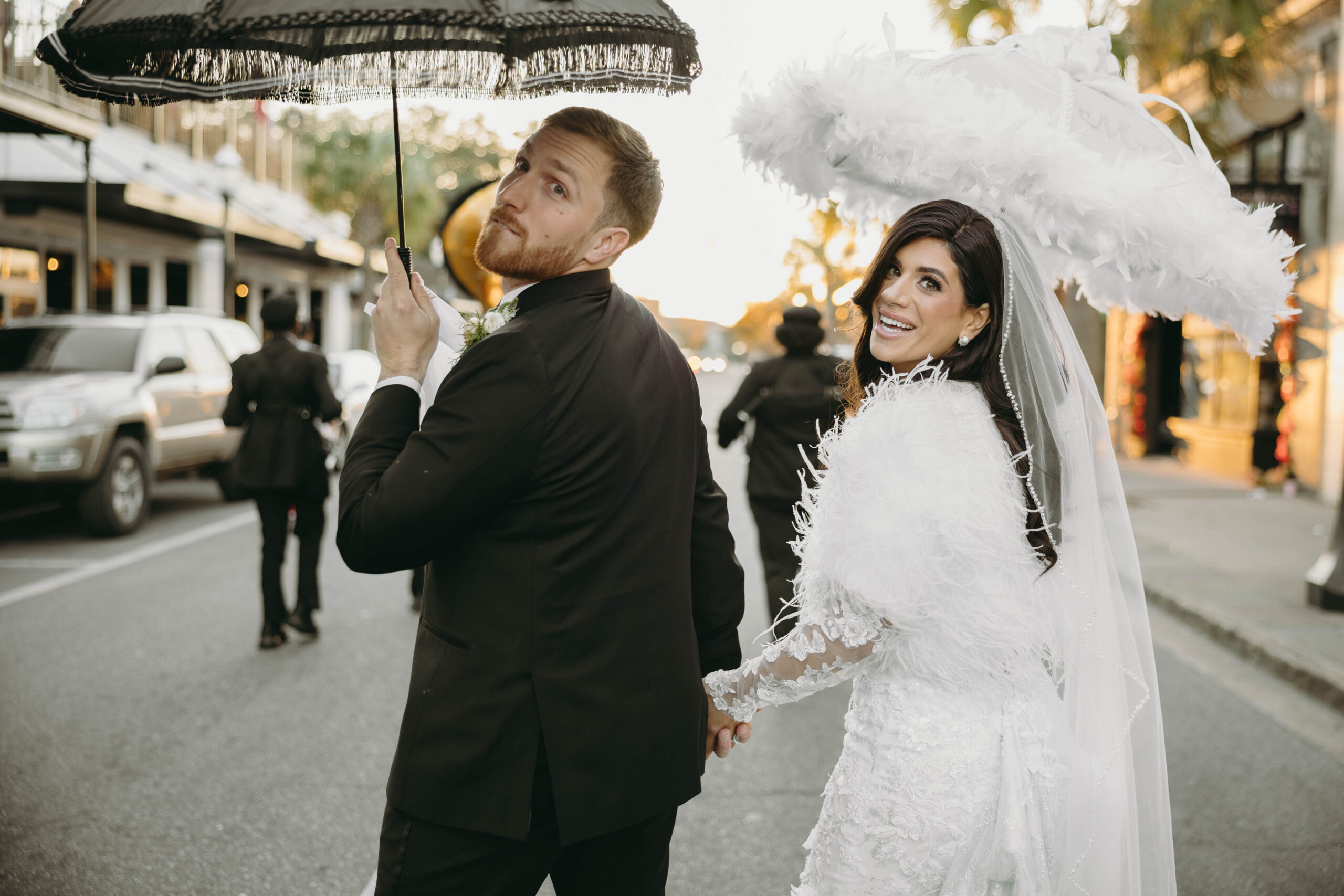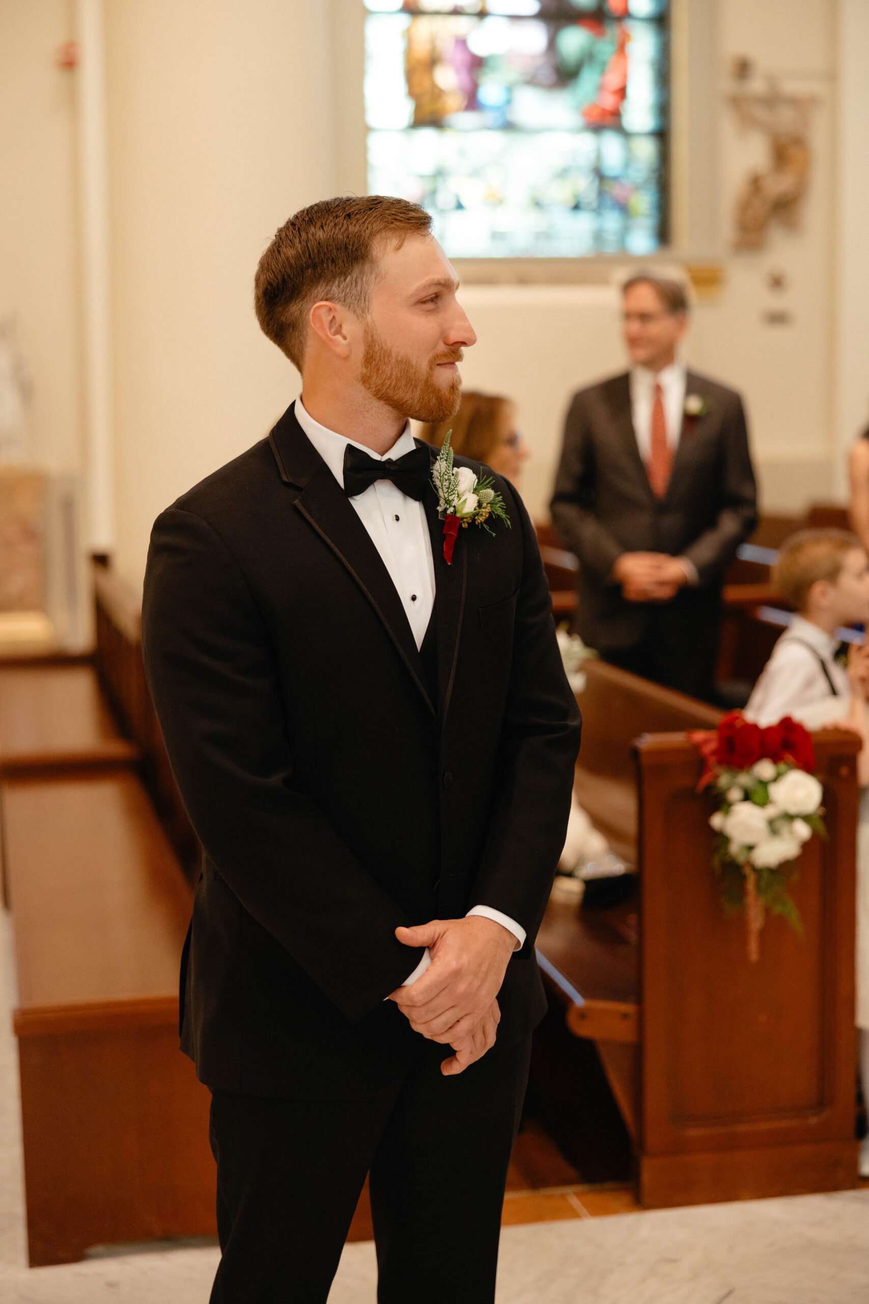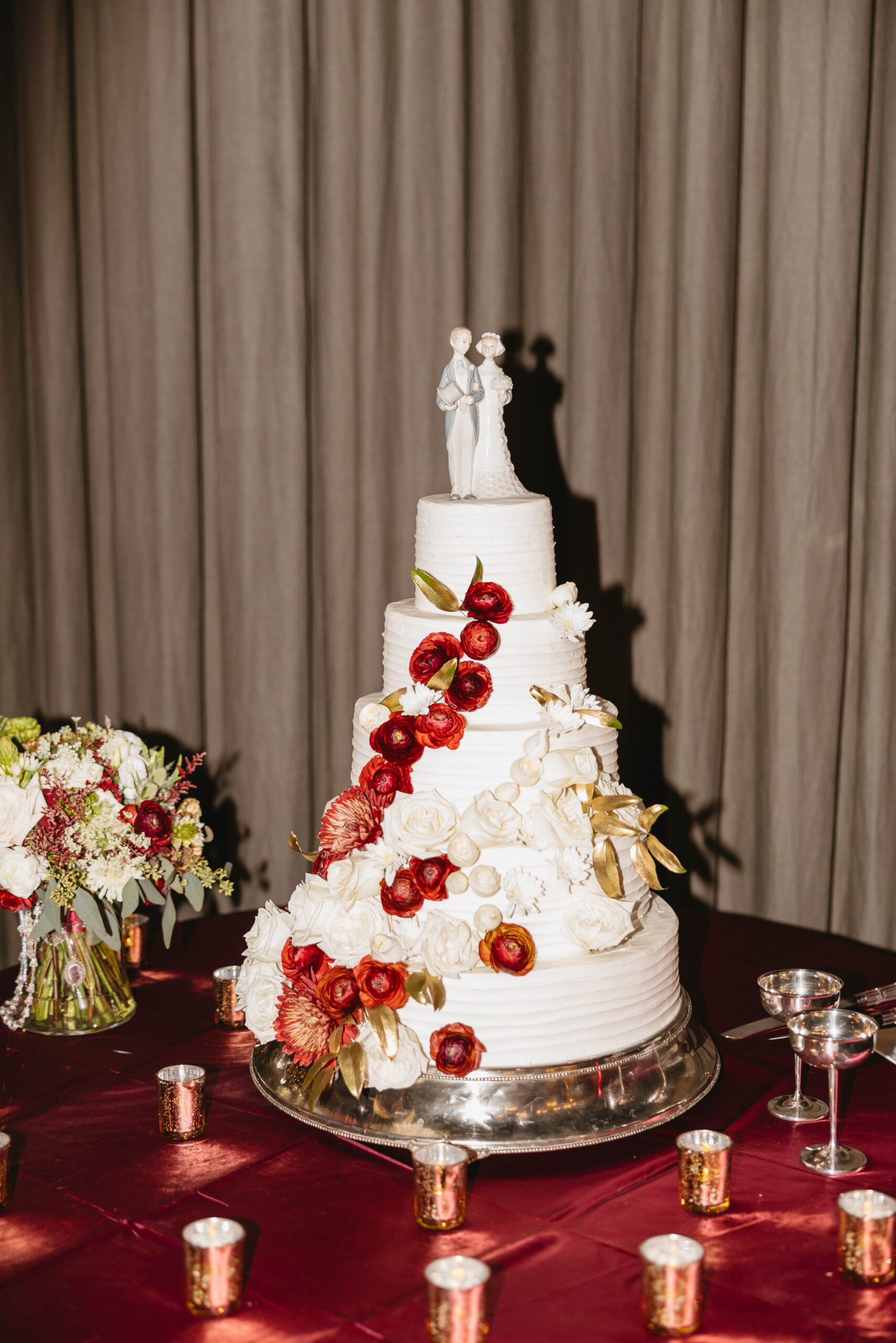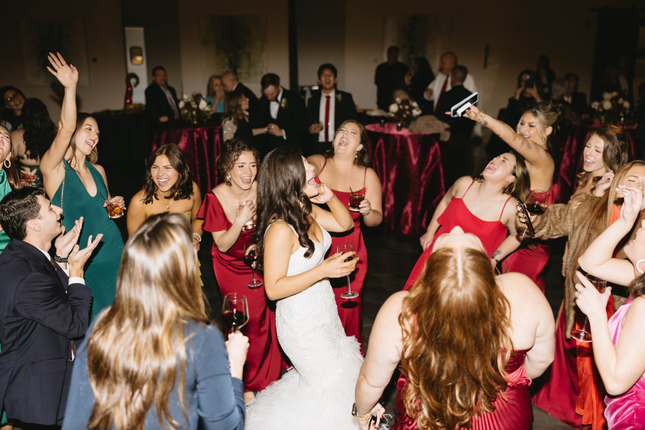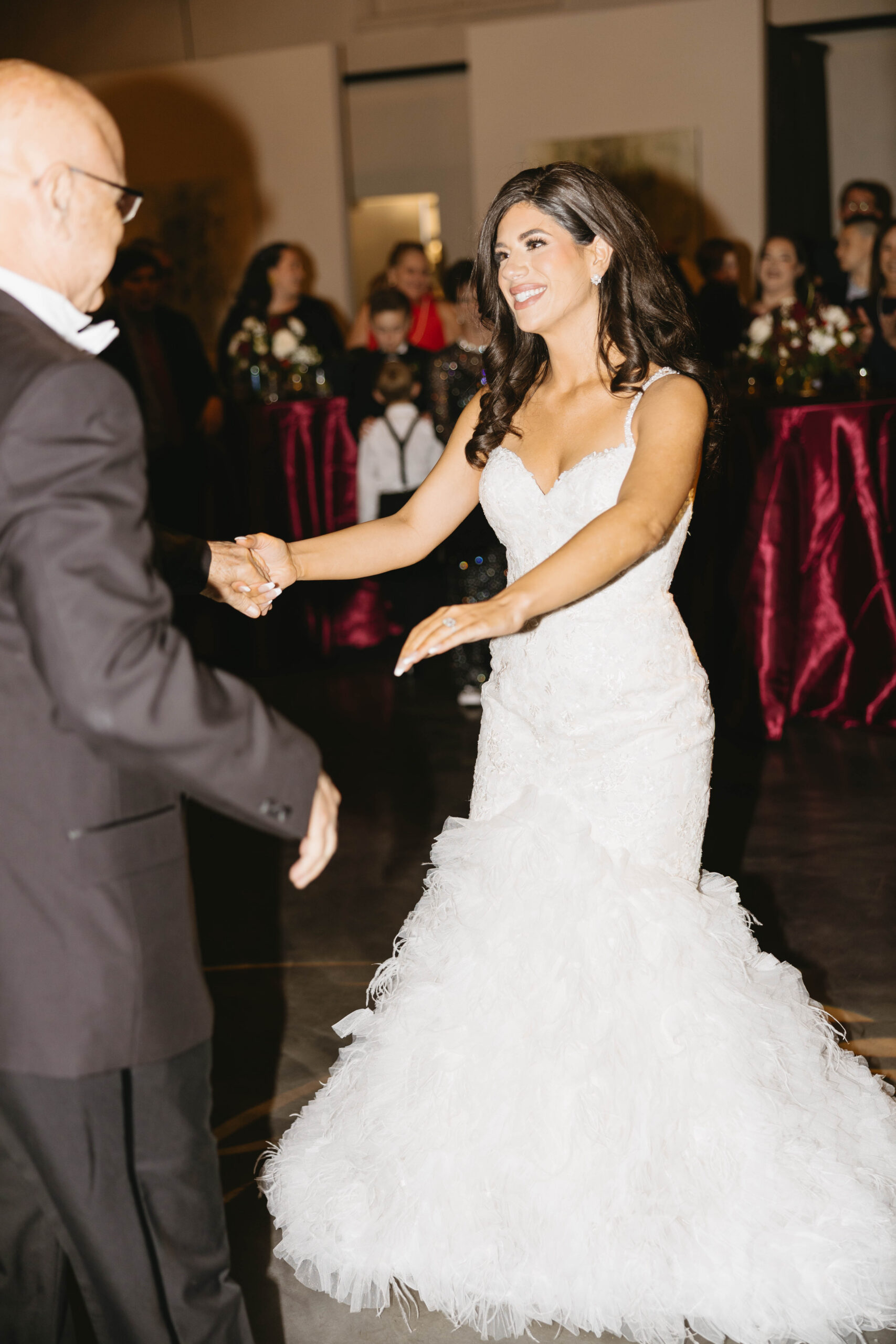 After a beautiful wedding Mass at the Cathedral-Basilica of the Immaculate Conception, the Excelsior BrassBand led the couple and their guests in a spirited second line through the streets of downtown Mobile to Crown Hall. There, they honored their Italian heritage with a custom Italian menu prepared by Bay Gourmet. A festive holiday theme ran throughout the day, with traditional Christmas colors in the florals and a special surprise appearance from Santa himself, who handed out personalized ornament favors engraved with the couple’s names and wedding date.