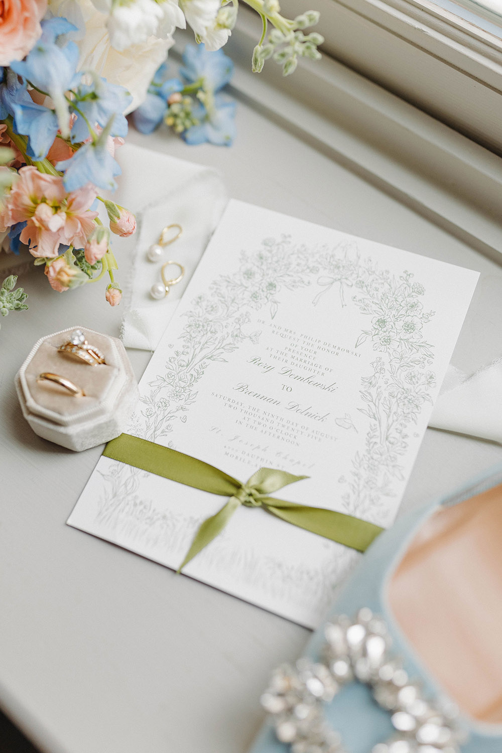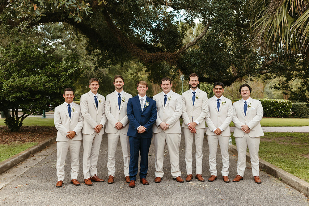 CEREMONY LOCATION: St. Joseph Chapel at Spring Hill College | OFFICIANT: Fr. Jim Morrison | REHEARSAL DINNER LOCATION: The Haberdasher | BRIDESMAIDS’ GOWNS: Birdy Grey | GROOM/GROOMSMEN ATTIRE: Kenneth Cole + Jason Abbound, Men’s Wearhouse | PHOTOGRAPHER: Emily Threatt Photography | FLORIST: The Shade Tree | BAKERY: Publix Bakery | CEREMONY MUSIC: Christopher Congo | RECEPTION ENTERTAINMENT: Codi Griffith with Beach Vibes Entertainment | HAIR + MAKEUP: Hair by Madi Rose + Makeup by Margaret Madison | HONEYMOON: Scotland (Inverness, Fort William, and Isle of Sky) | WEDDING PLANNER/DESIGNER: Tori Oetken of Bella Victoria Events | JEWELER: Jared | FAVORS: A small bag of lavender for luck | INVITATIONS: Vistaprint + Canva
