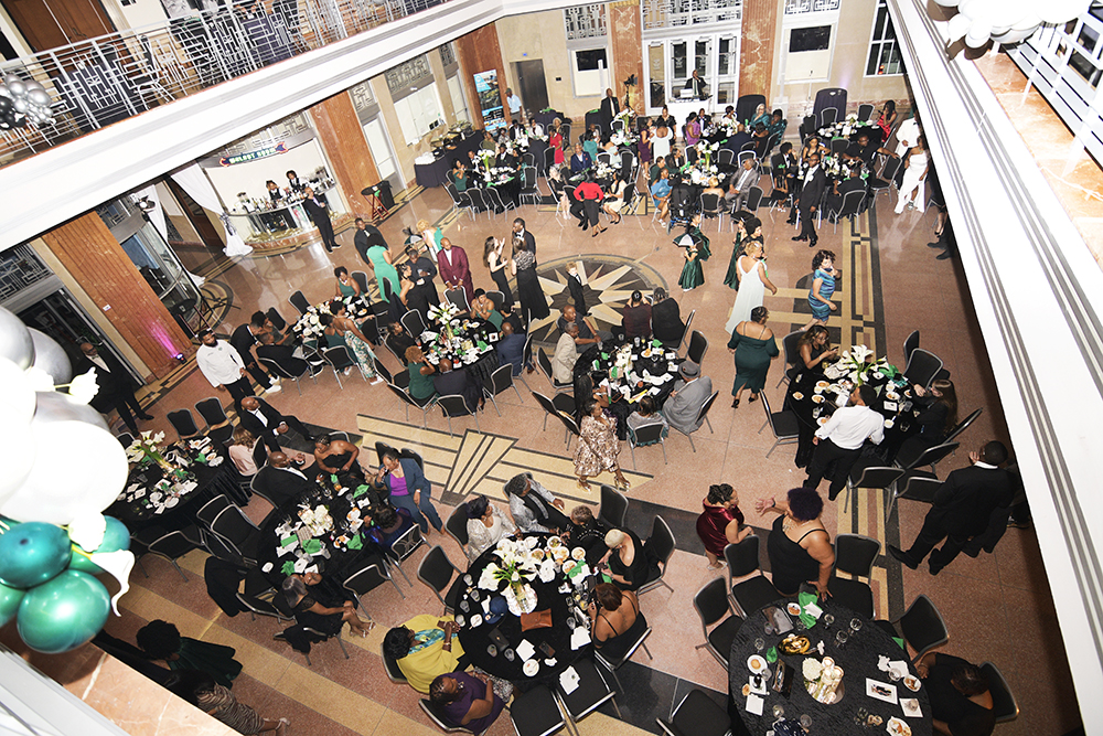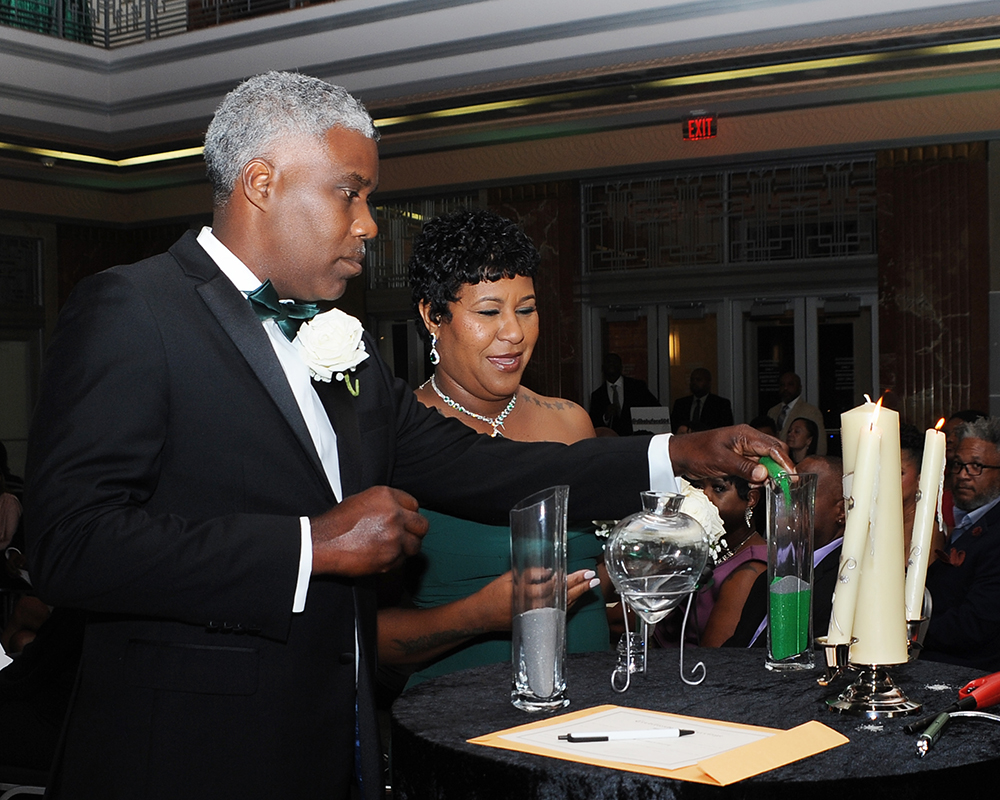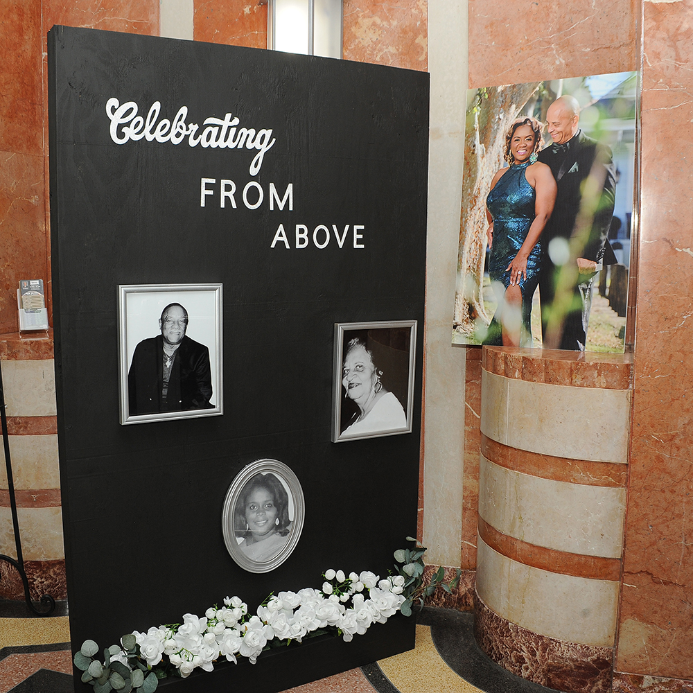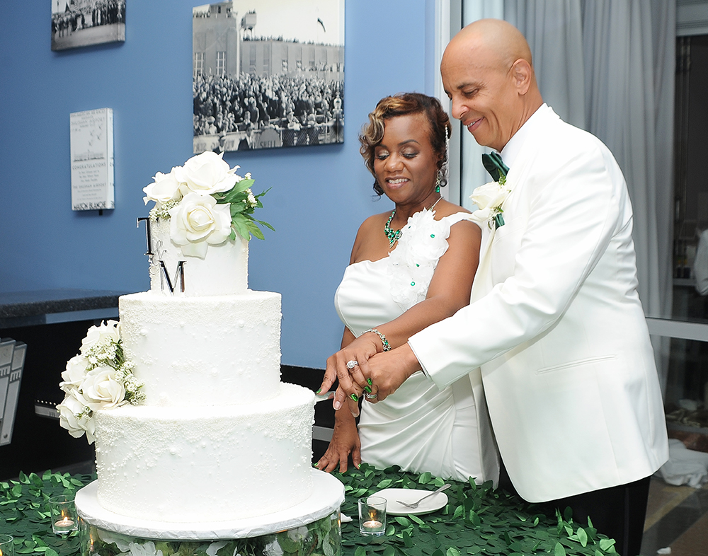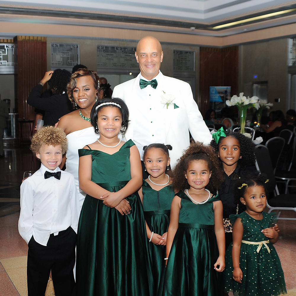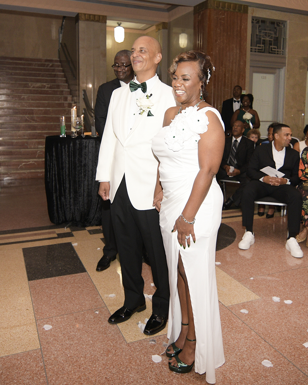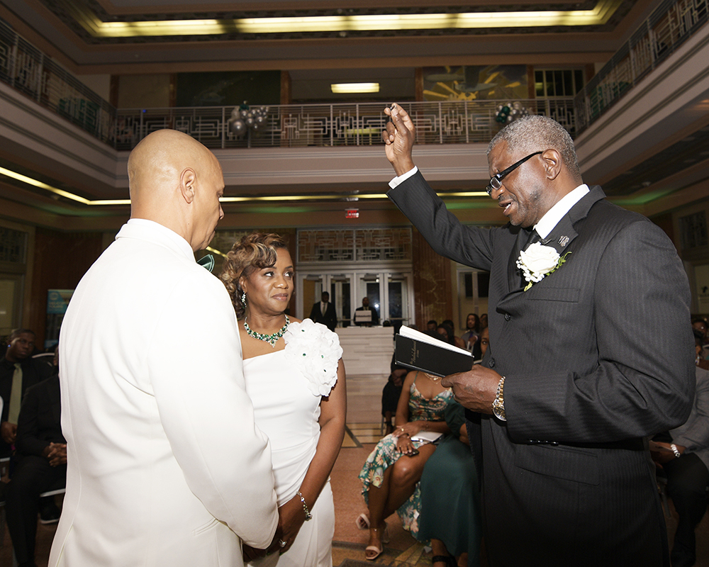 Their wedding day was intentionally designed to reflect that unity. Surrounded by family, the ceremony unfolded in a circle of love, with guests seated around the compass in the atrium. Children and grandchildren played meaningful roles, from flower girls and ring security to lighting unity candles and blending sand into a keepsake vessel. Every detail symbolized connection, legacy, and togetherness.