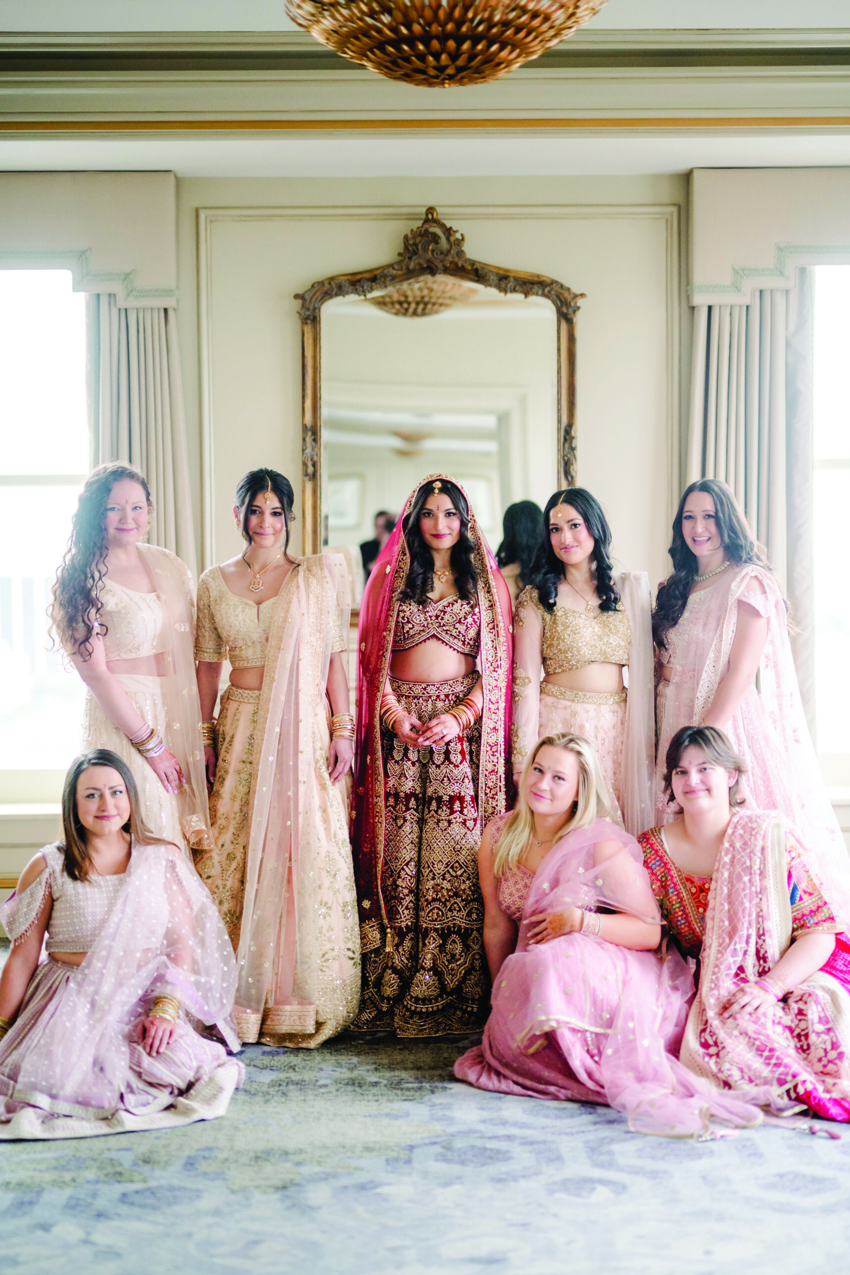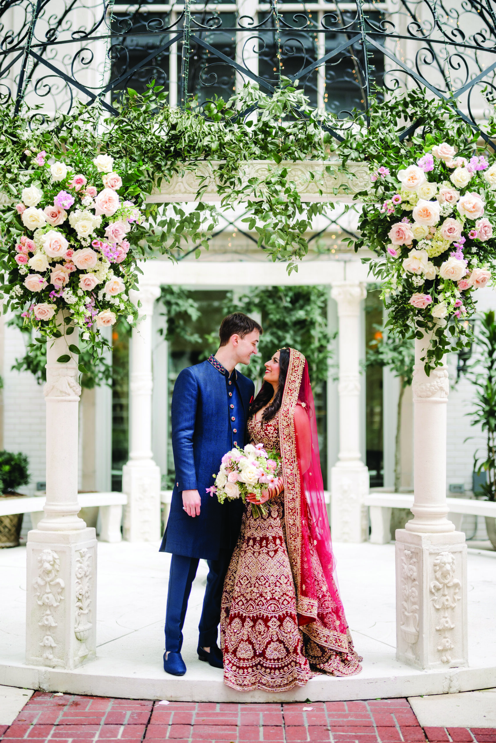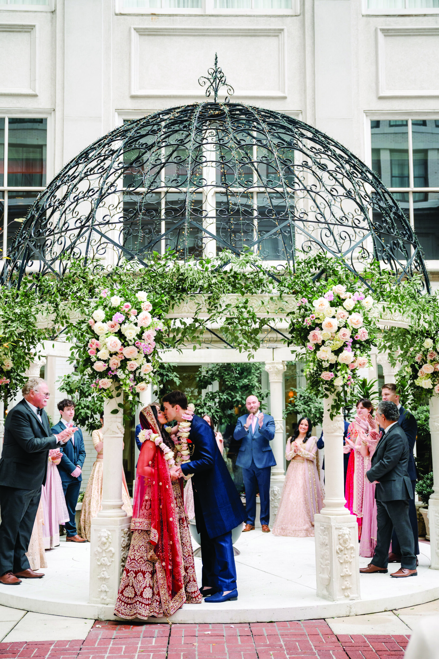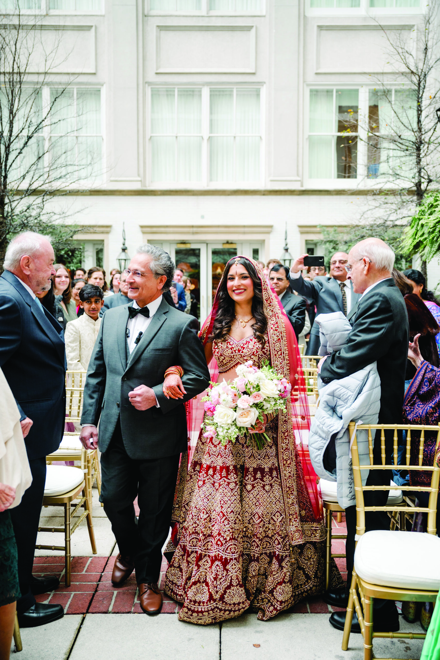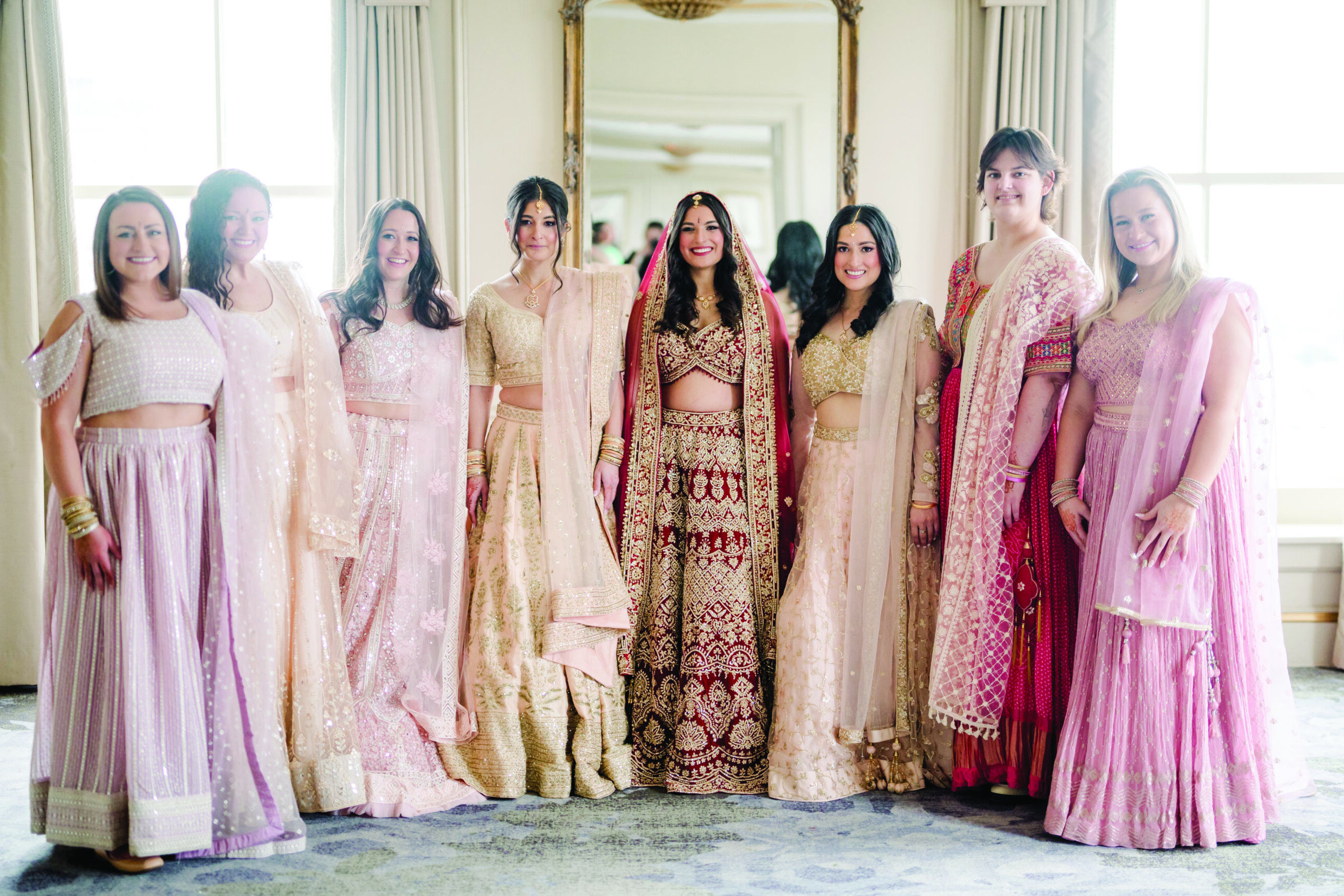 The following morning, the courtyard of The Ritz-Carlton was transformed into a scene of color and symbolism. The gazebo became a mandap, the traditional Indian wedding canopy, framed in florals for the ceremony. Athena walked down the aisle in a red bridal lehenga by Nazranaa, carrying a bouquet that merged Indian and American influences, while Brian matched in dark blue Indian attire from the same designer. Bridesmaids in soft pink lehengas and groomsmen in navy suits with pale pink ties completed the picture.