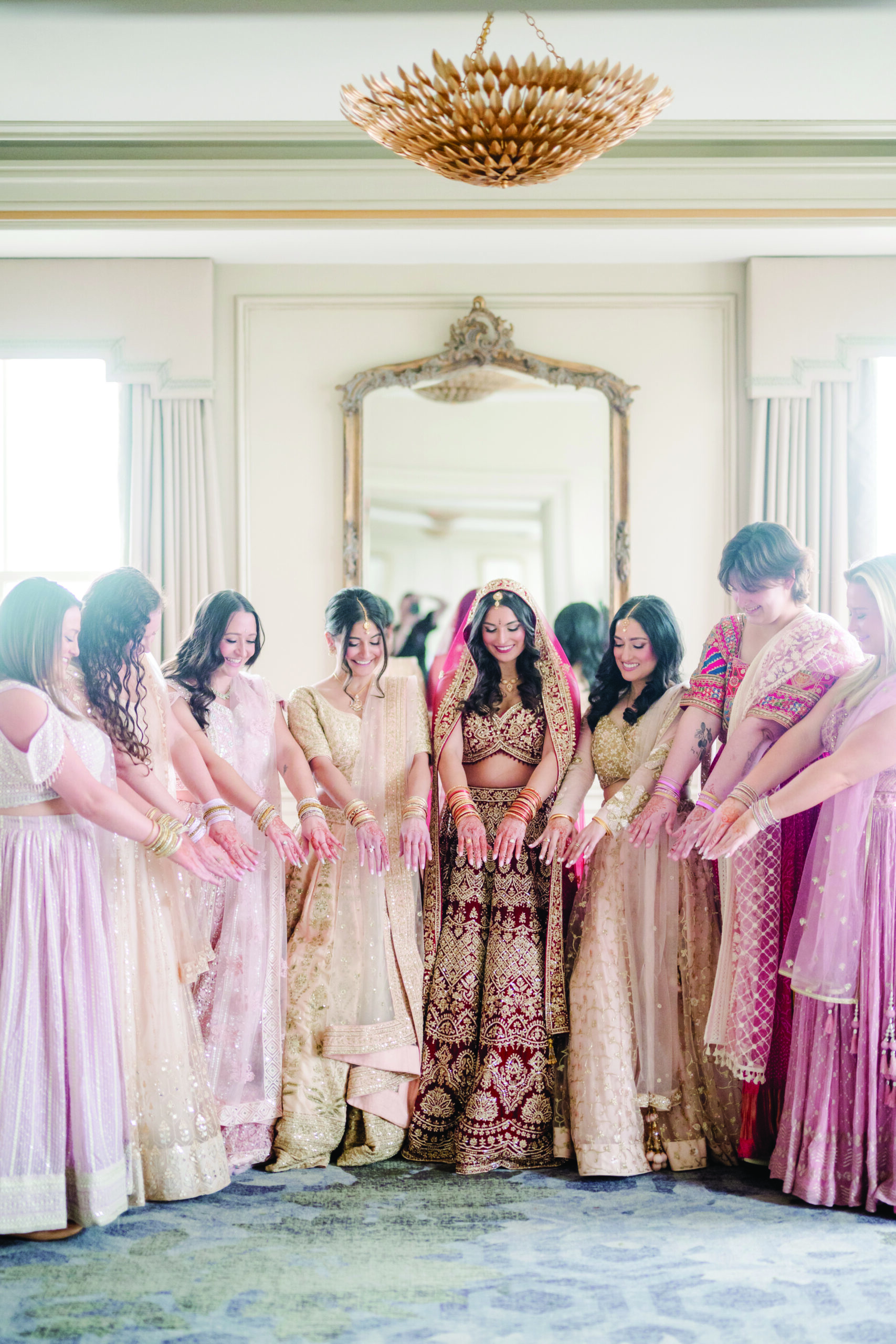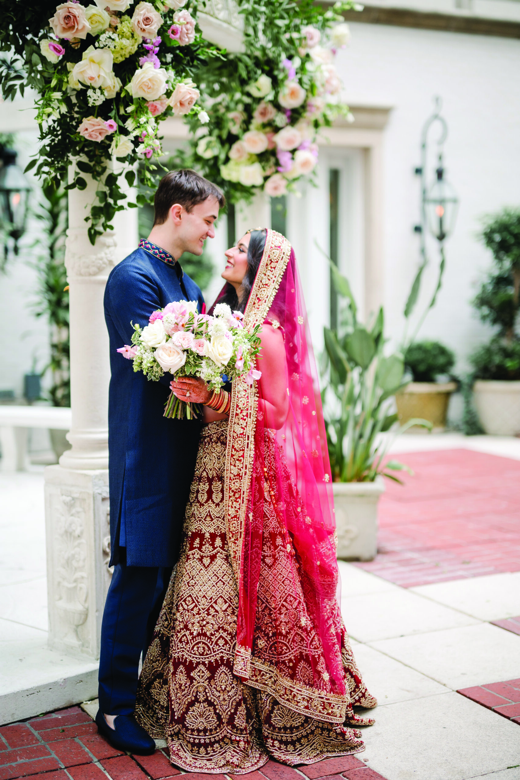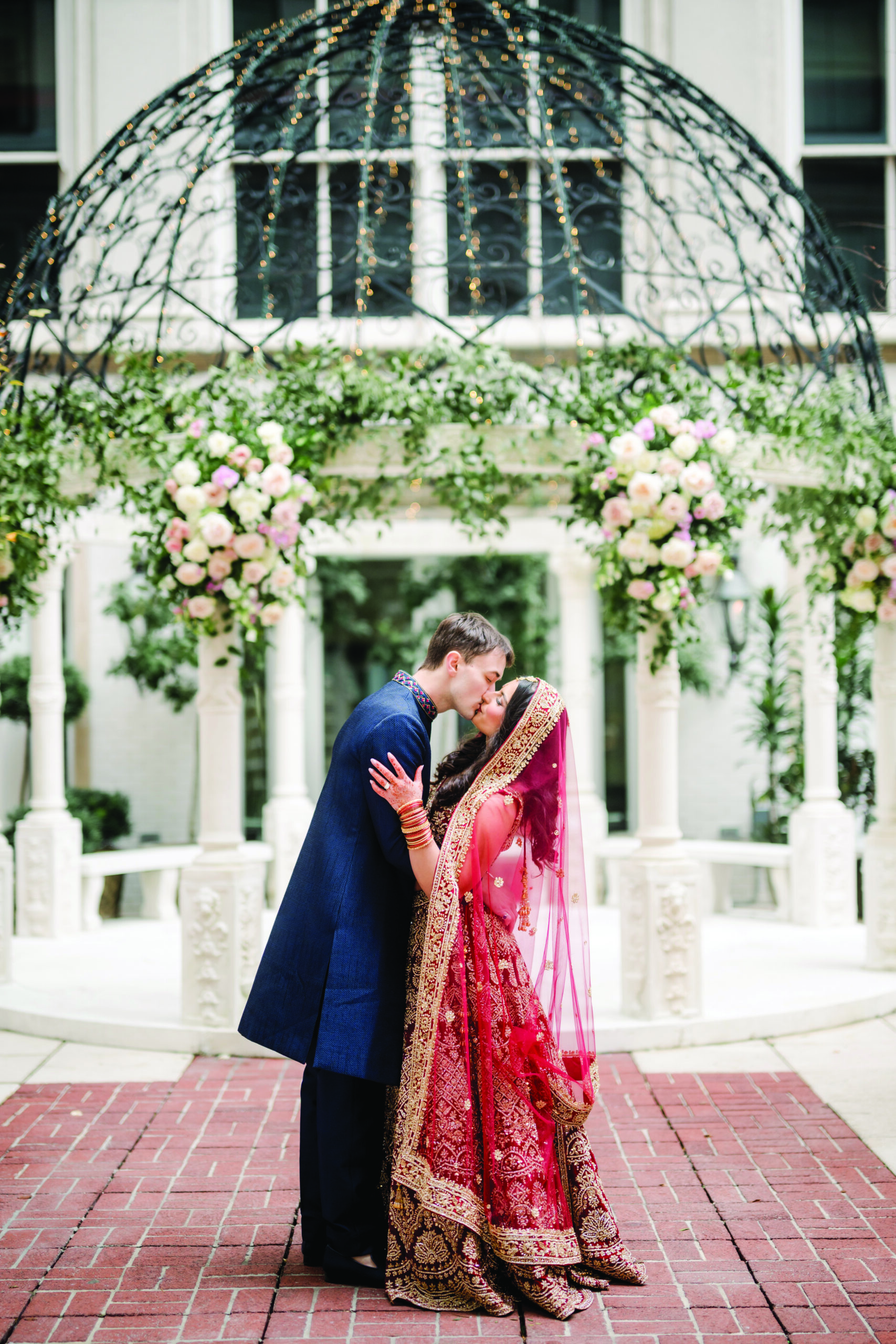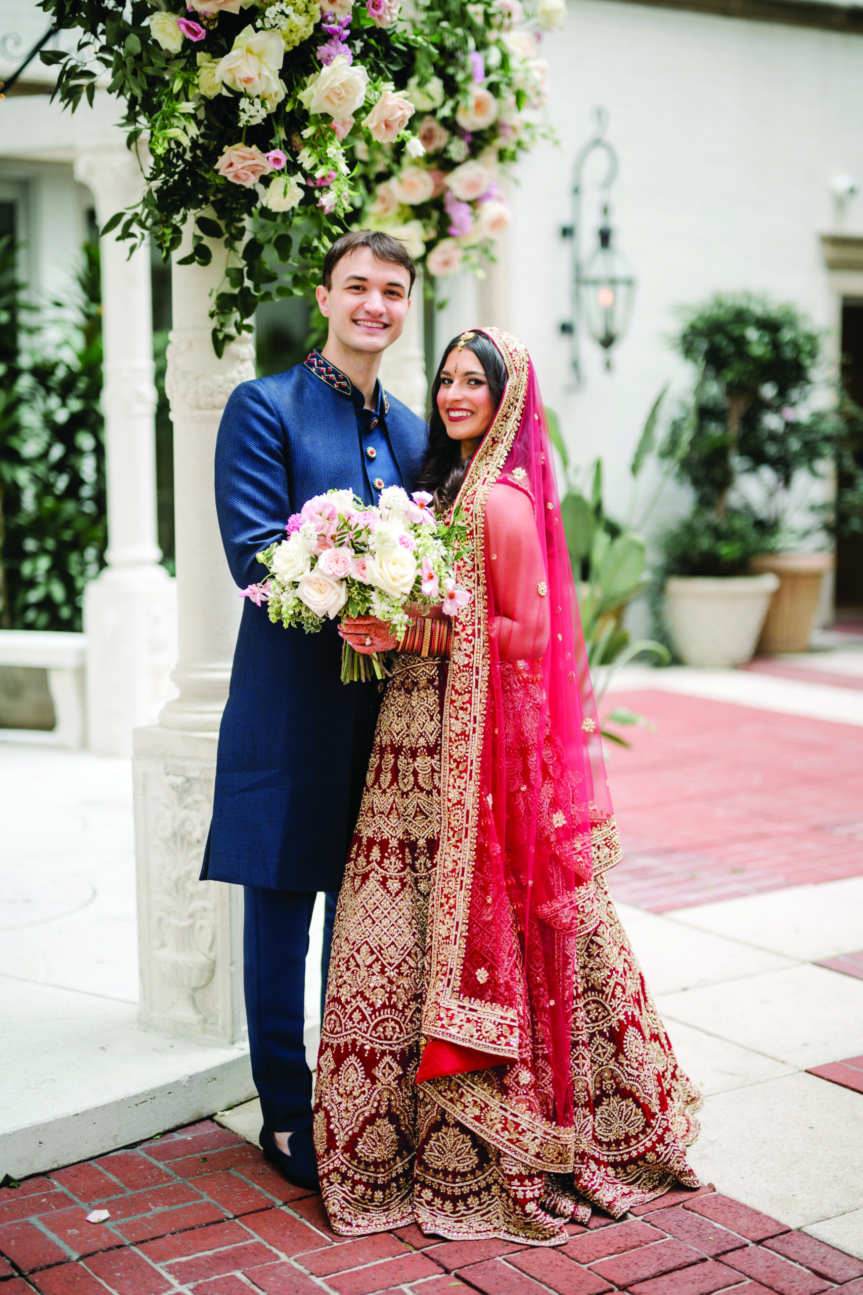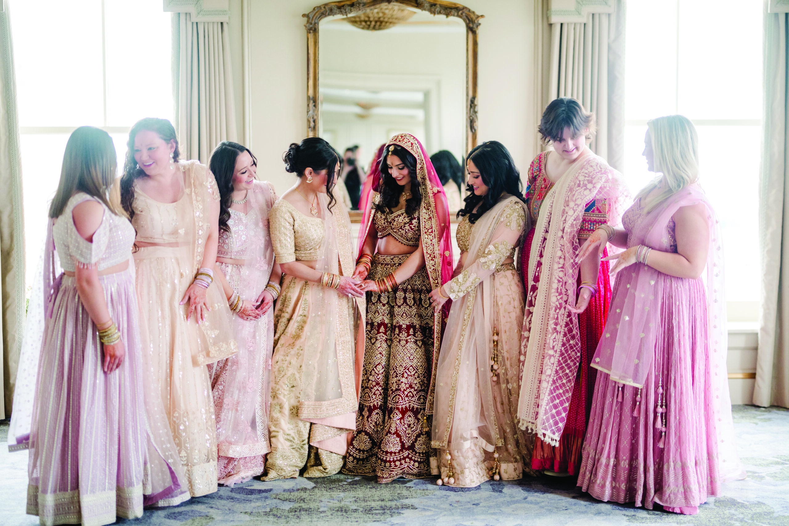 The following morning, the courtyard of The Ritz-Carlton was transformed into a scene of color and symbolism. The gazebo became a mandap, the traditional Indian wedding canopy, framed in florals for the ceremony. Athena walked down the aisle in a red bridal lehenga by Nazranaa, carrying a bouquet that merged Indian and American influences, while Brian matched in dark blue Indian attire from the same designer. Bridesmaids in soft pink lehengas and groomsmen in navy suits with pale pink ties completed the picture.