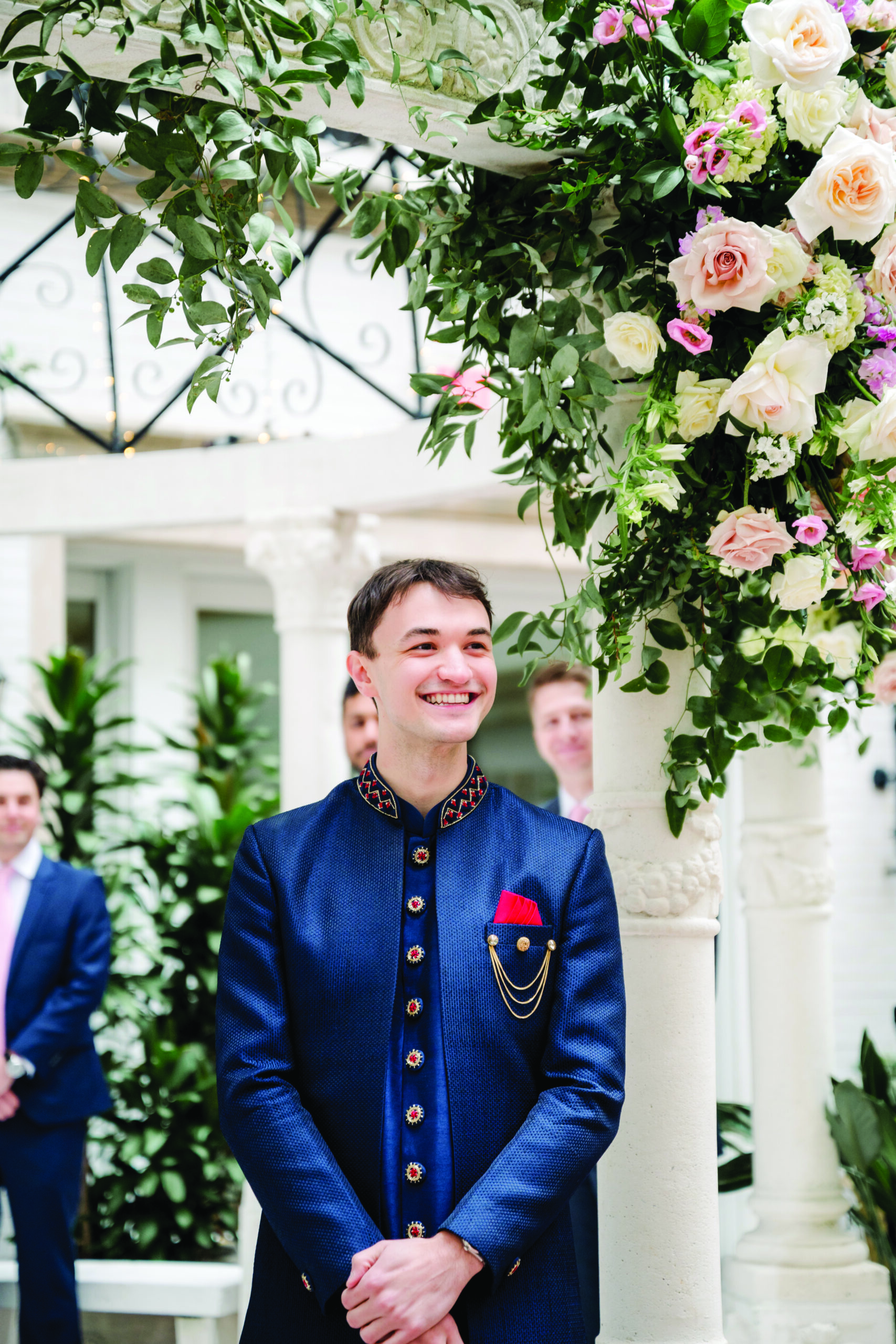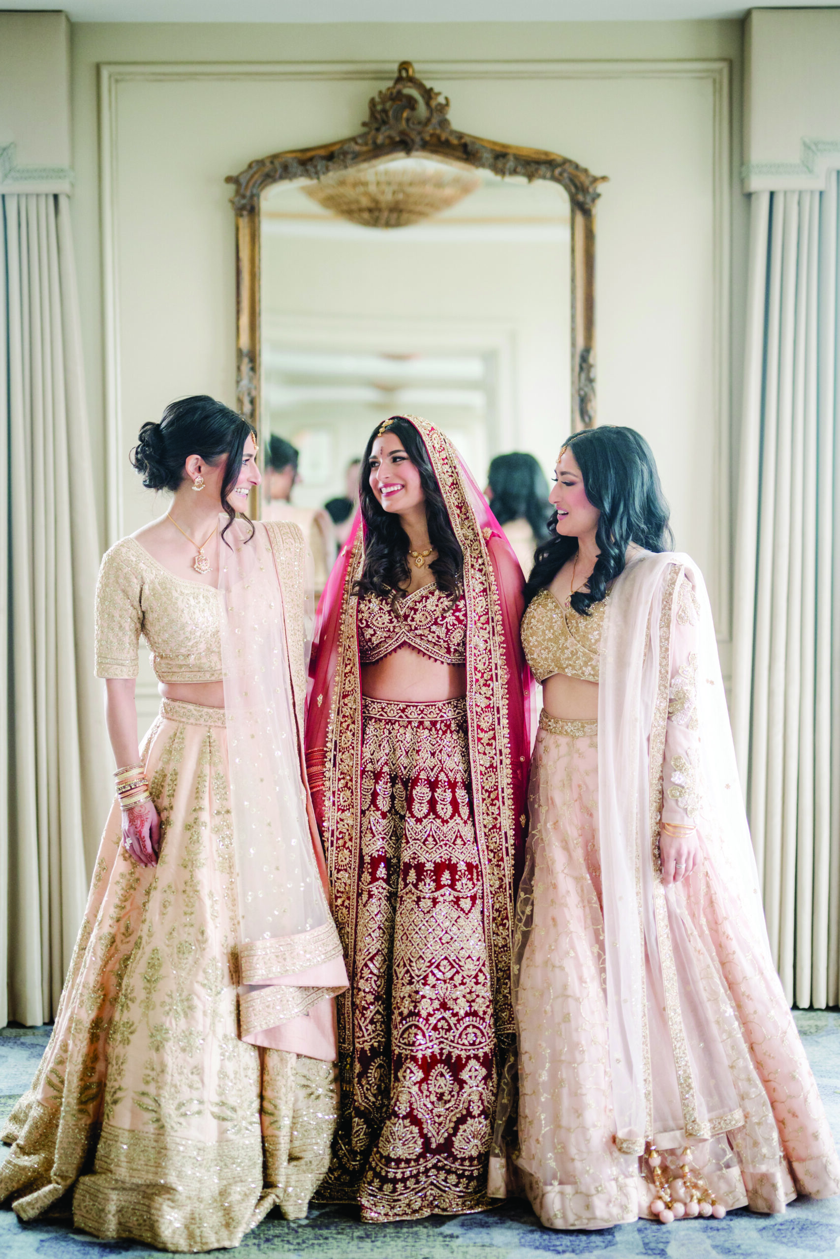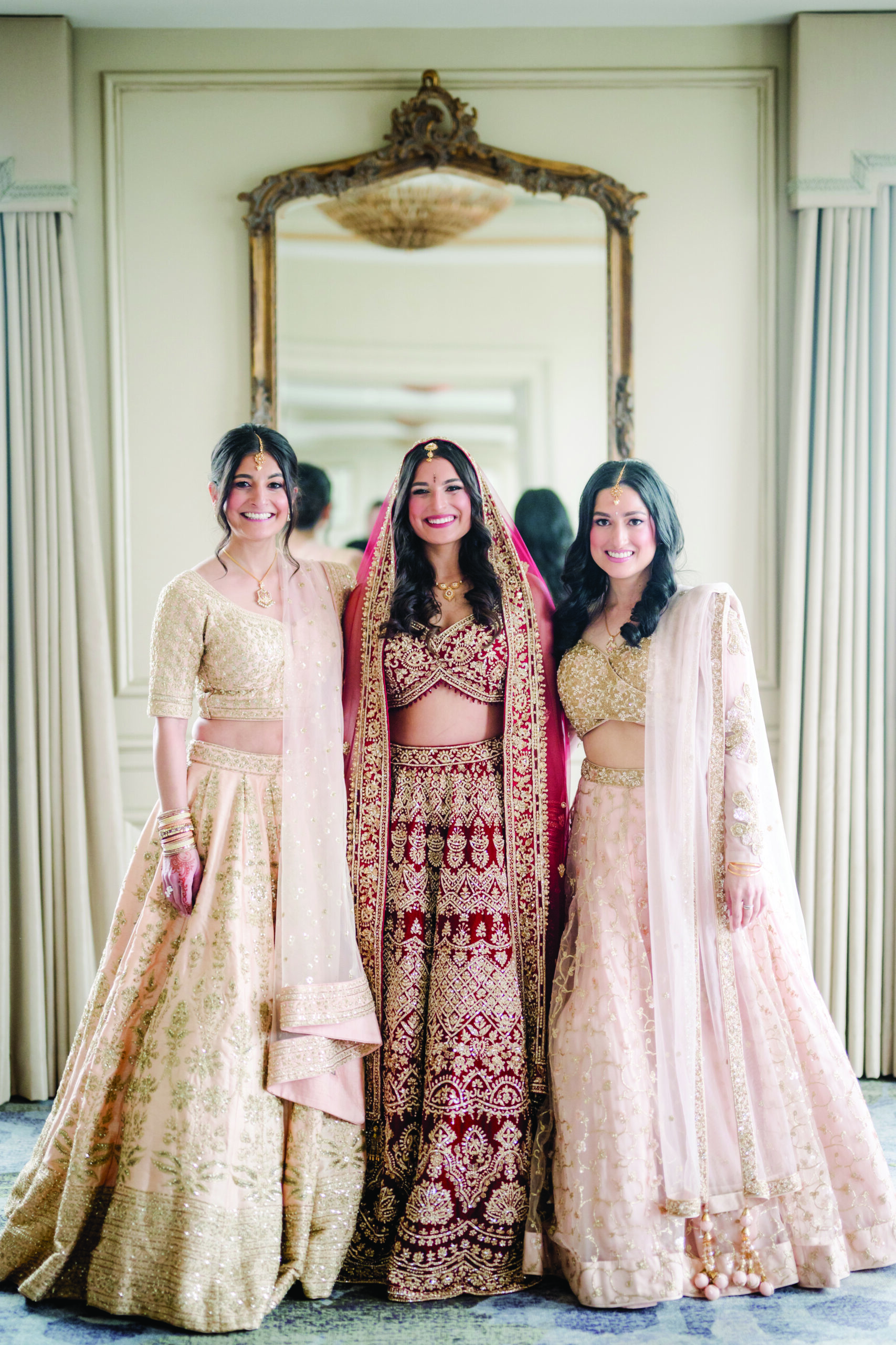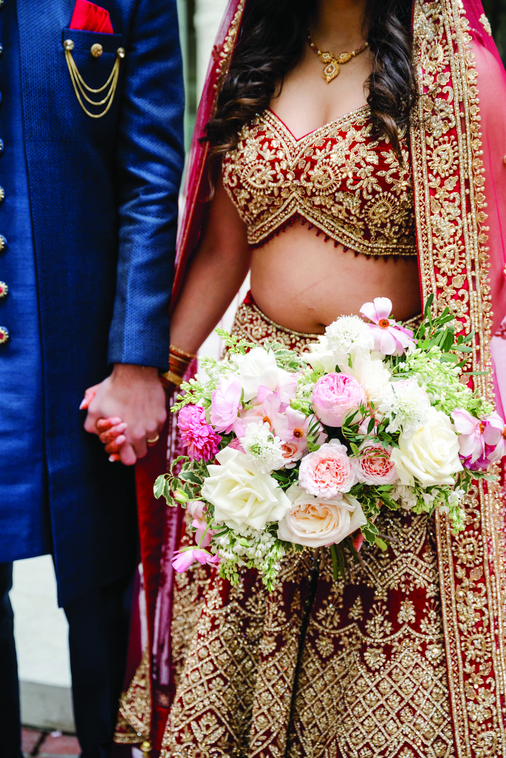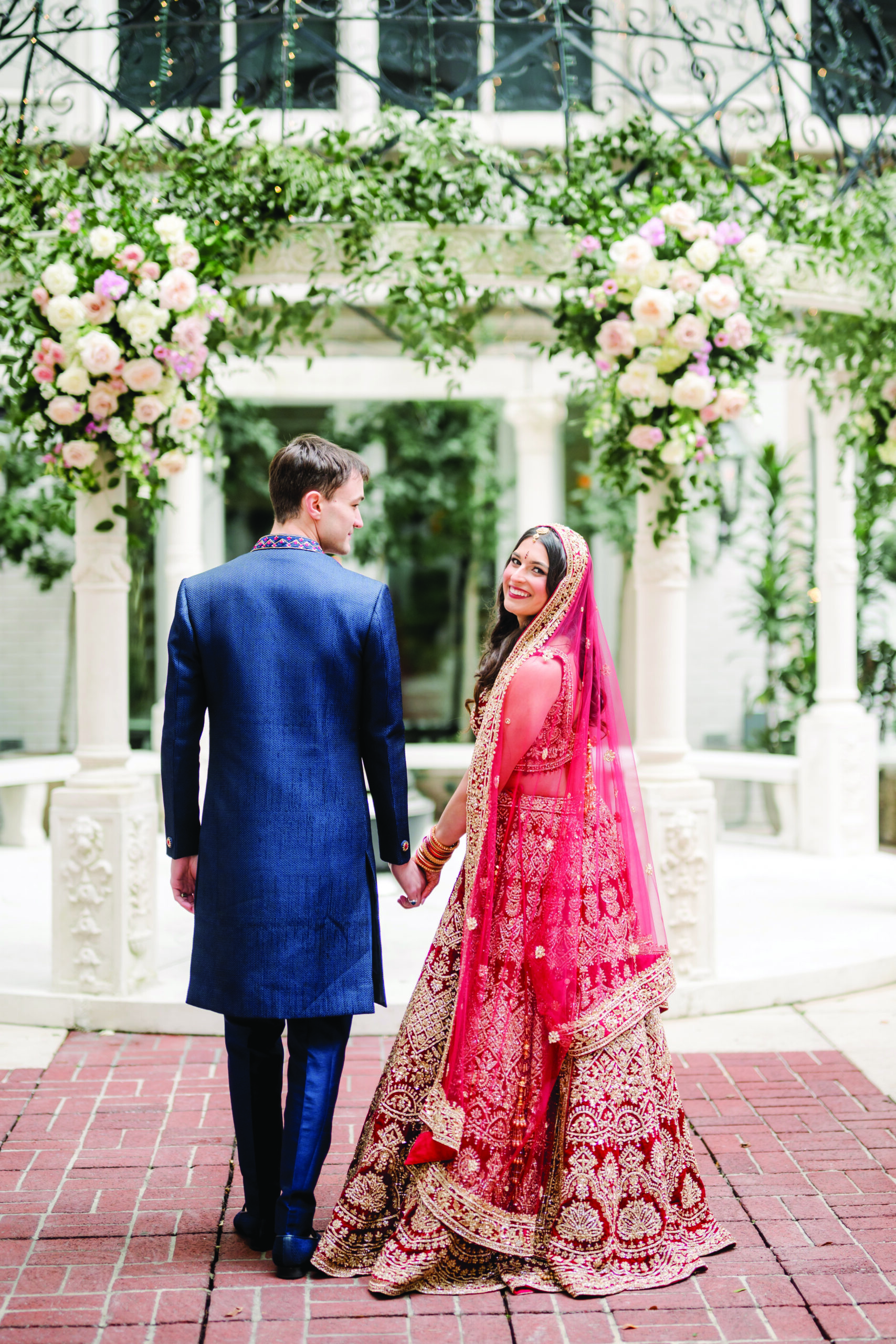 The following morning, the courtyard of The Ritz-Carlton was transformed into a scene of color and symbolism. The gazebo became a mandap, the traditional Indian wedding canopy, framed in florals for the ceremony. Athena walked down the aisle in a red bridal lehenga by Nazranaa, carrying a bouquet that merged Indian and American influences, while Brian matched in dark blue Indian attire from the same designer. Bridesmaids in soft pink lehengas and groomsmen in navy suits with pale pink ties completed the picture.